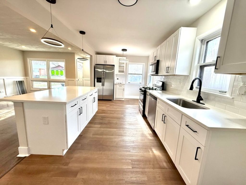 Gorgeous rehabbed tri level 3 bed 1.5 bath home in Dolton. Walk into this open concept level of the home to freshly painted walls, modern light fixtures, and bright natural light coming in from the windows in the living/dining rooms. Enjoy cooking meals while entertaining others at the breakfast bar island in the brand new kitchen featuring white shaker cabinetry with black onyx hardware, quartz countertops, subway tile backsplash and brand new stainless steel appliances to finish off the look. the wainscoting and modern accent wall in the attached dining room. There is a half bath off the kitchen. The second floor boasts three generous sized bedrooms with ample closet space and full bath. Enjoy additional entertaining space in the lower level with a family room and separate area for laundry and plenty of storage. Fully fenced in backyard with a 2.5 car detached garage. Plenty of outdoor entertaining space and extra parking with the side drive. TRULY A MUST SEE!