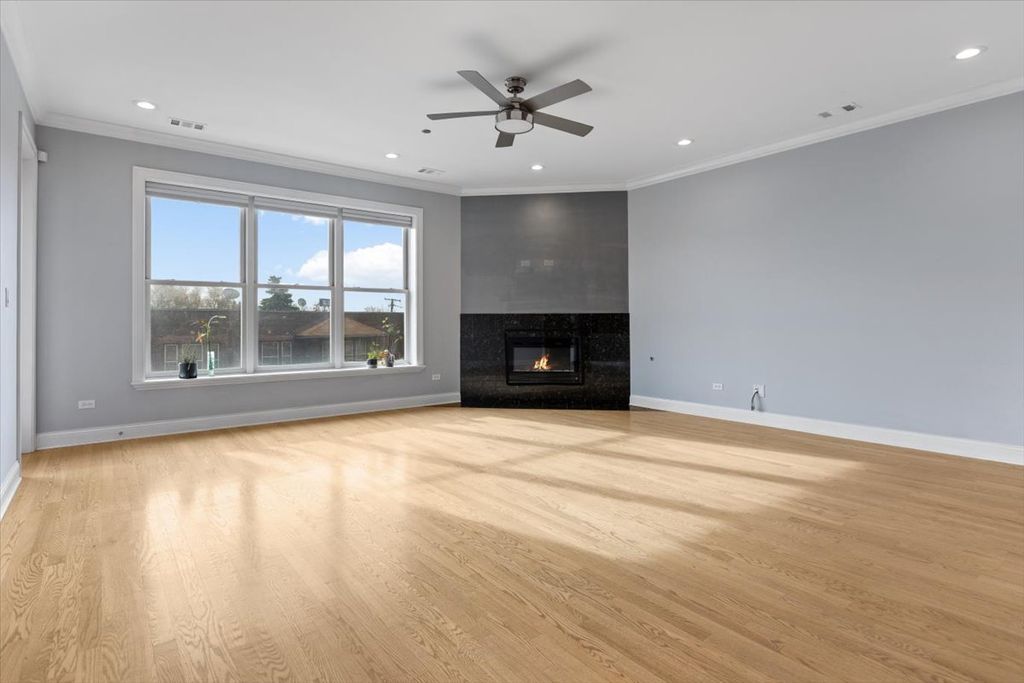 Discover a rare opportunity to own a beautifully updated residence in the highly sought-after Rivers Edge Condominiums, perfectly positioned along the peaceful North Branch of the Chicago River. This expansive 1,000 sq. ft. home welcomes you with a front foyer, generous closet space, and a sun-filled south-facing living area that captures river views and a sparkling city skyline. The open concept living room offers incredible flexibility for lounging, dining, or designing a stylish work-from-home setup, all centered around an electric LED fireplace for year-round ambiance. Step outside to the large covered terrace, ideal for morning coffee, evening wine, or simply enjoying the scenery. The adjacent kitchen is fully updated with granite countertops, stainless steel appliances, a tile backsplash, abundant cabinetry, and a convenient breakfast bar. The spacious bedroom features oversized windows, a walk-in closet, and direct access to the bathroom with a double-bowl vanity and a jetted soaking tub. Thoughtful upgrades elevate this home even further, including refinished hardwood floors, crown molding, a NEST smart thermostat, a new front-loading washer and dryer, and brand-new Low-E living room windows that improve energy efficiency while showcasing the beautiful views. Heated indoor garage parking and additional storage are included. All of this in a prime riverfront location, just steps from the riverwalk, Target, grocery stores, restaurants, coffee shops, fitness centers, andnneighborhood parks. Urban convenience, modern comfort, and a serene natural backdrop come together in one exceptional home.