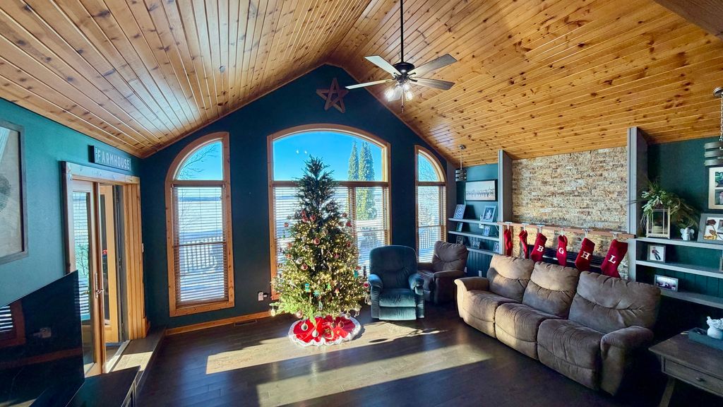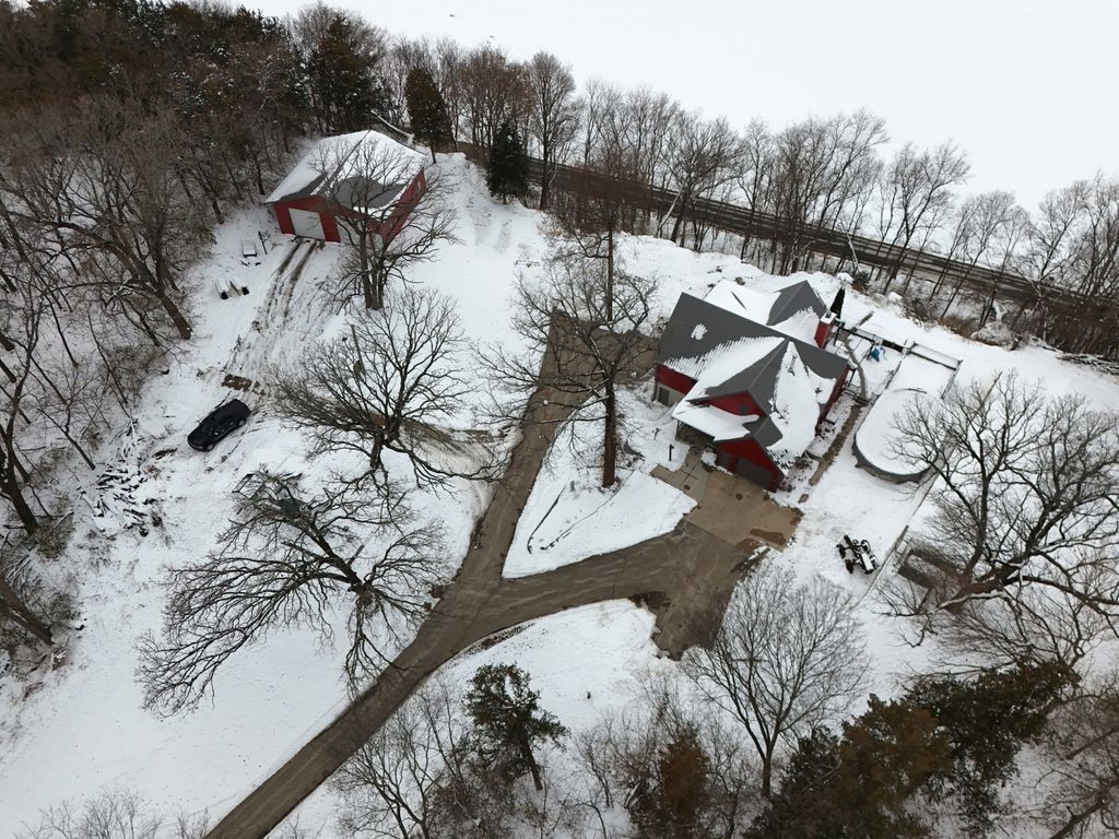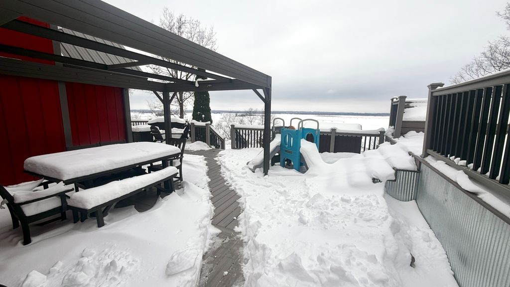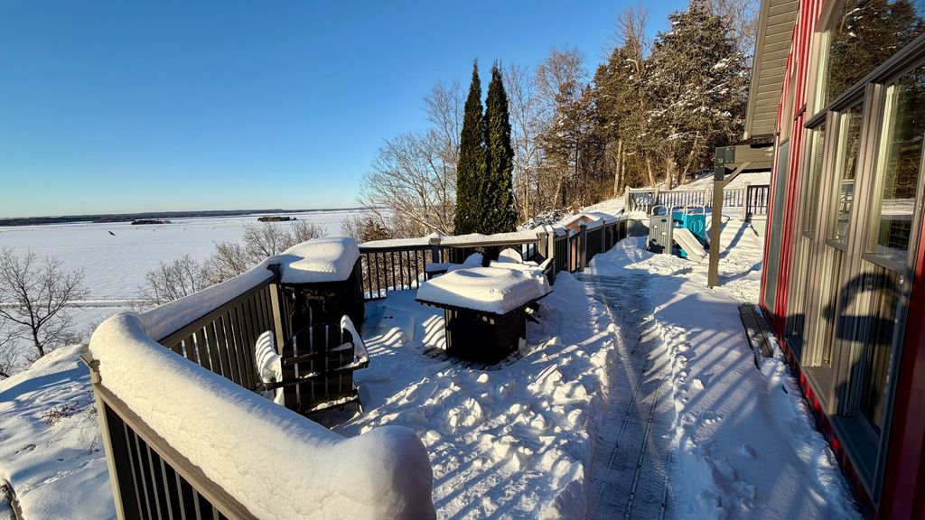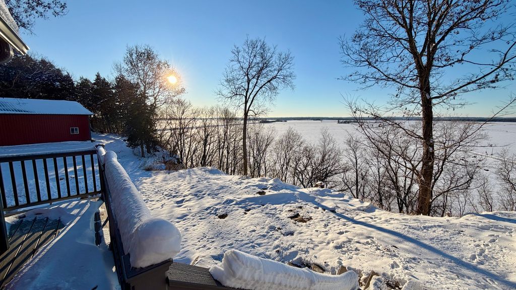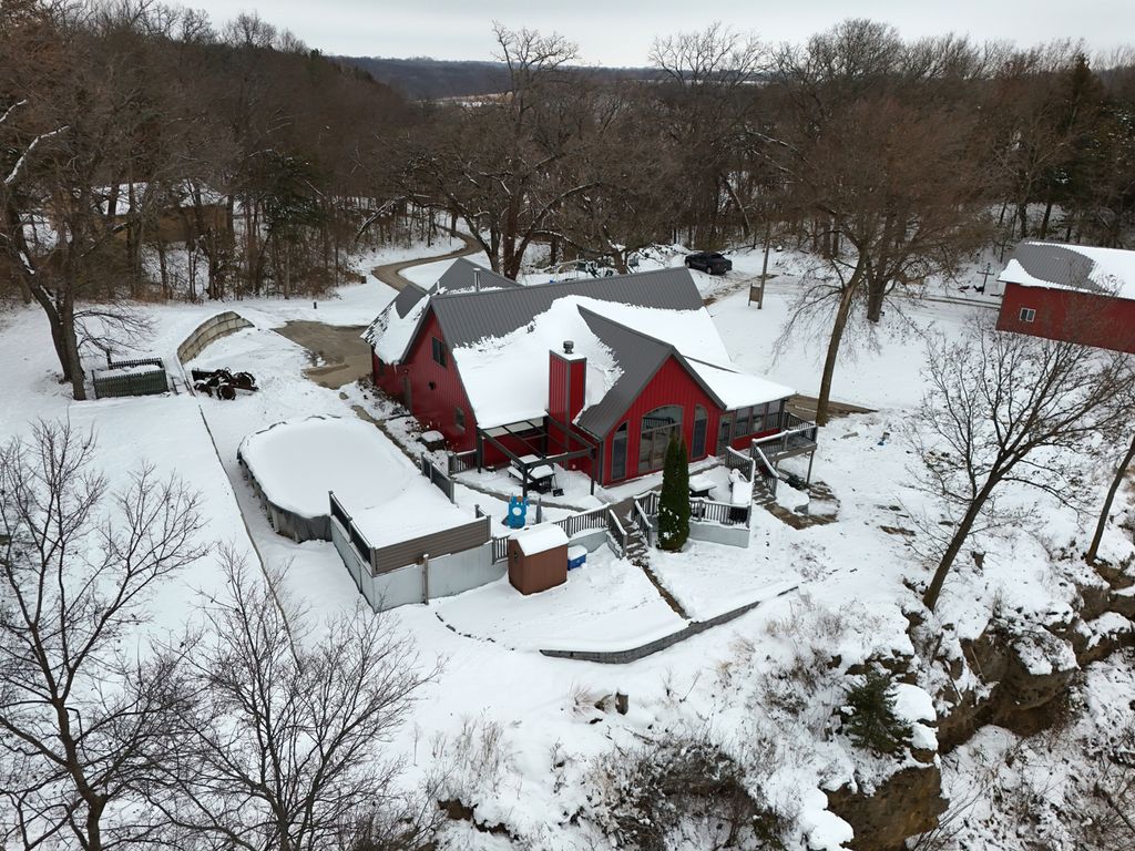 Perched high on a bluff overlooking the stunning Mississippi River valley, this exceptional 5-acre property offers unmatched views and peaceful wooded surroundings. The home features 3-5 bedrooms, 3 full bathrooms, and an additional half bath, thoughtfully designed for comfort and flexibility. The living room features vaulted ceilings, wood burning fireplace and expansive windows that frame the incredible bluff-top views. Newer engineered hardwood floors flow through the living room and four-season sunroom, while heated tile floors warm the entry, dining area, and kitchen. The beautifully renovated kitchen offers abundant counter space, modern finishes, and a large walk-in pantry-perfect for cooking and entertaining. Enjoy breathtaking scenery year-round from the four-season sunroom equipped with a mini split for efficient heating and cooling. The primary suite includes a freshly updated bathroom with dual sinks and a stunning tiled walk-in shower. Additional highlights include board-and-batten siding, a durable steel roof, and a 3-car attached garage for everyday convenience and a large 18x33 above ground pool and beautiful deck. A large 40x40 pole building with two 14' electric garage doors provides excellent space for equipment, storage, or hobbies. With bluff-top scenery, quality updates, and total privacy surrounded by nature, this property is a rare find. A true must-see.