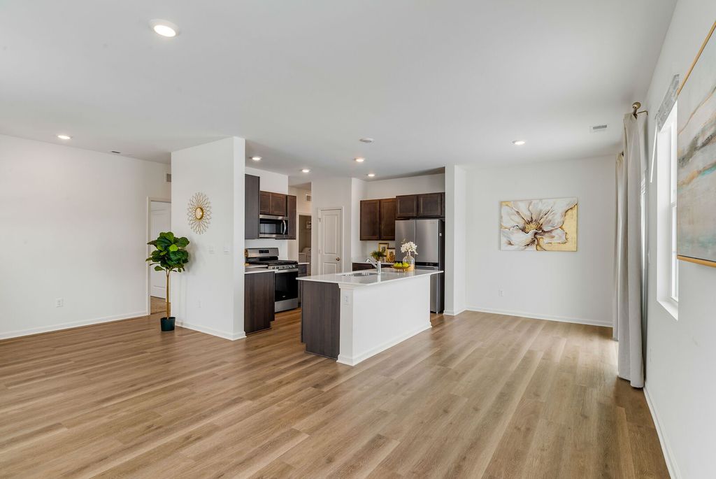 This newly built ranch-style townhome offers 2 bedrooms, 2 bathrooms, and impressive 9-foot ceilings plus an immediate move in date. The open-layout living room, kitchen, and dining area provide a bright, welcoming space that's perfect for gatherings. The kitchen is equipped with stylish cabinetry, stainless steel appliances, a pantry, and a large island with room for seating- plus a new washer and dryer. Relax in your own private retreat-the spacious primary bedroom with an en-suite bath featuring raised-height dual sinks and a walk-in shower. Community provides snow removal and lawn care-- plus access to other amenities like the community pool!