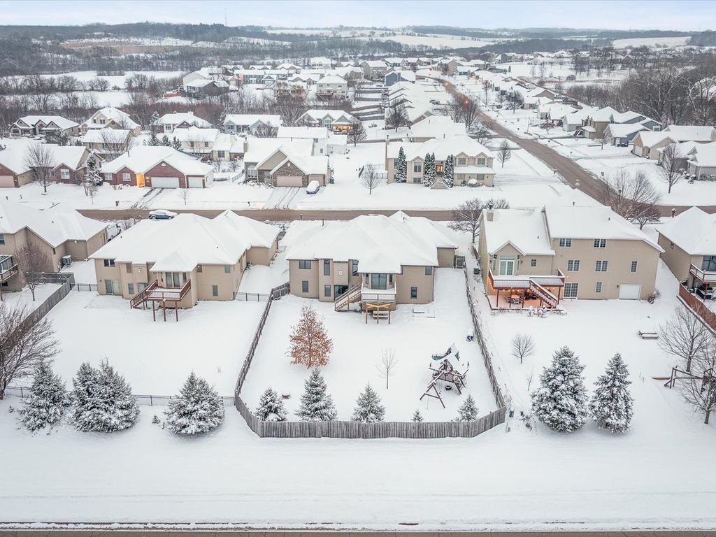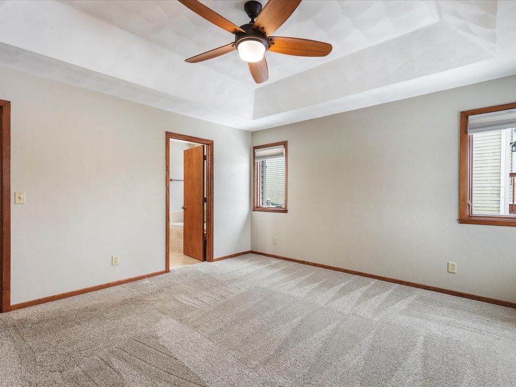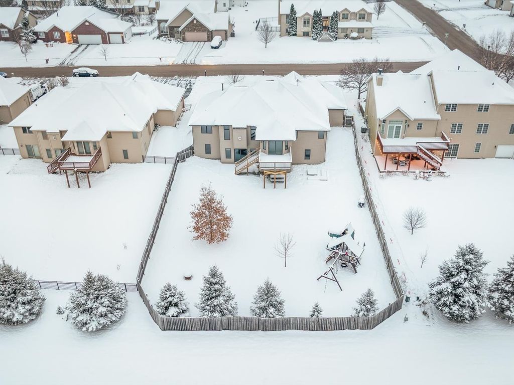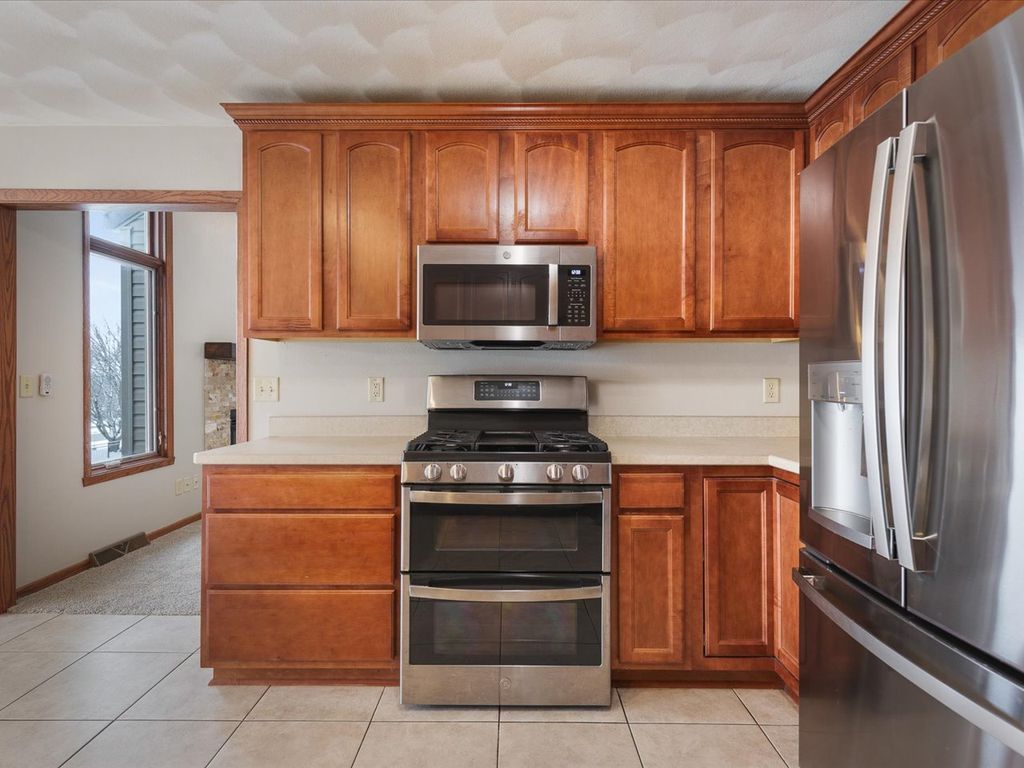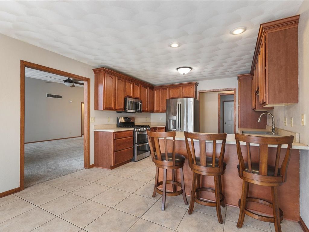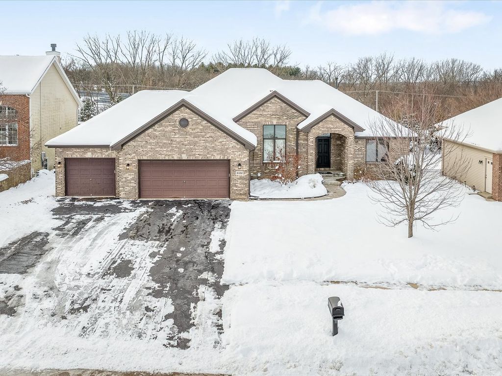 Step into this impressive 5-bedroom, 3-bath home designed for those who appreciate quality, space, and style. This split-bedroom floor plan offers fresh updates throughout and striking 11-foot ceilings on the main level that elevate every room. Floor-to-ceiling windows flood the home with natural light, creating a bright and welcoming atmosphere from the moment you walk in. The formal dining room sets the tone with an elegant Pottery Barn glass pendant fixture. The living room features a beautifully updated gas fireplace with new tile and mantle-an ideal focal point for gatherings. The eat-in kitchen offers rich cherry cabinetry, generous counterspace, a breakfast bar, new stainless-steel appliances that stay, and ceramic tile flooring. A sliding glass door opens to the deck overlooking a spacious, privacy-fenced yard with mature trees and a Rainbow brand playset that stays. The expansive primary suite is a true retreat with tray ceilings, a walk-in closet, double bowl sinks, a Jacuzzi tub, and a stunning new tile shower. Convenience continues with first-floor laundry and a rare 3-car garage with a 3-car-wide driveway. The full walk-out lower level extends the living space beautifully, featuring a kitchenette, media room with French doors, two fully exposed bedrooms, an additional office, and a stylish full bath with double bowl sinks and modern gray cabinetry. Walk right out to the concrete patio and enjoy the peaceful backyard setting that connects to the newly expanded Perryville bike path. Located in the desirable Harlem School District, this home offers space, upgrades, and a refined feel throughout ready to welcome its next owner.