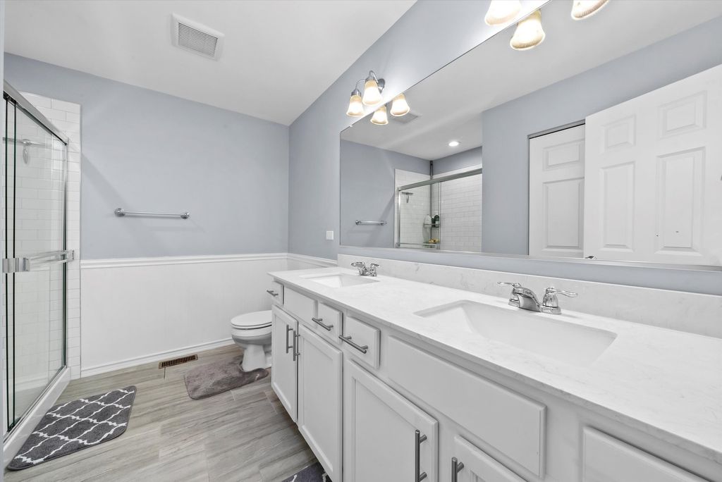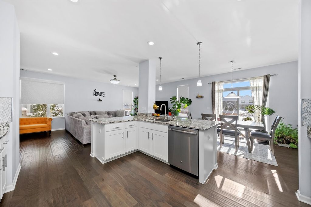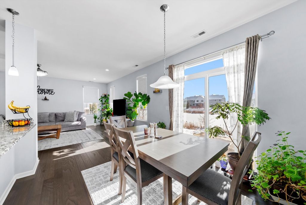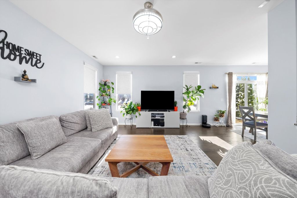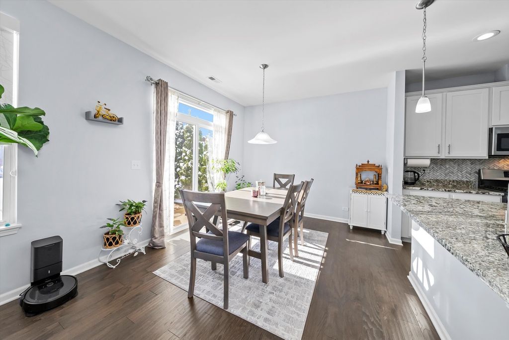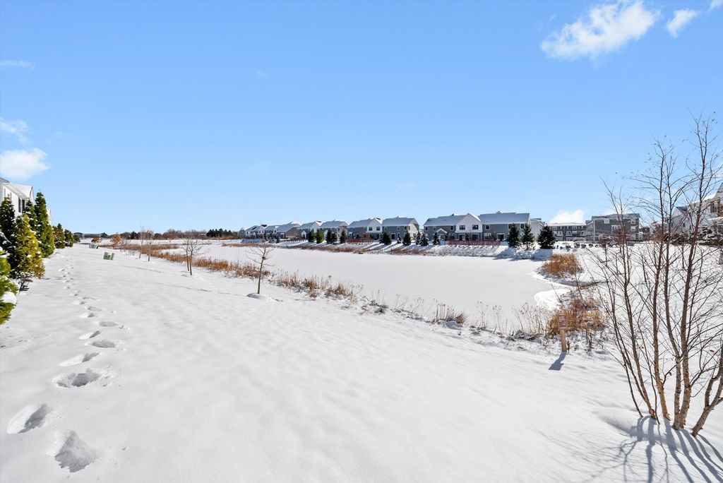 Experience refined living in this beautiful end-unit Campbell model, thoughtfully positioned along open pond-side scenery for enhanced privacy and a serene backdrop. The main level impresses with 9-foot ceilings and a spacious living area that spans half the first floor. Recent enhancements include fresh interior paint, an epoxy-finished garage floor, premium blackout roller shades, a storm door, and an RO drinking water system. The kitchen features a large island, 42-inch white cabinetry, granite surfaces with a coordinating backsplash, and stainless steel appliances. The second floor offers two oversized guest bedrooms, a shared full bath, and a well-appointed primary suite complete with a 5-foot walk-in shower, linen storage, and a large walk-in closet. The upstairs laundry room adds everyday convenience. Gramercy Square provides exceptional convenience. Costco and Whole Foods are directly across the street for everyday errands. Fox Valley Mall is just one mile north for shopping, dining, and entertainment. Commuters will appreciate being only 3 miles from the Naperville Route 59 Metra station and about 4 miles from the I-88 expressway. Families will value this home's location within the highly regarded District 204 school system, along with school bus service available within the community. This home comes with a transferable 15-year structural warranty and is Whole Home Certified.