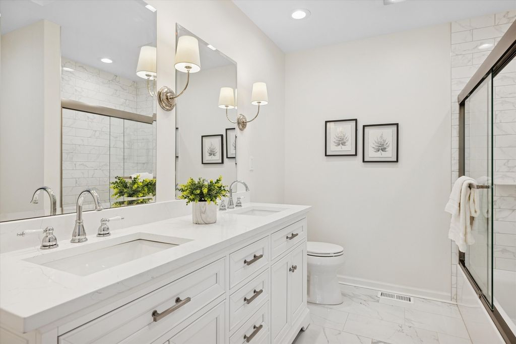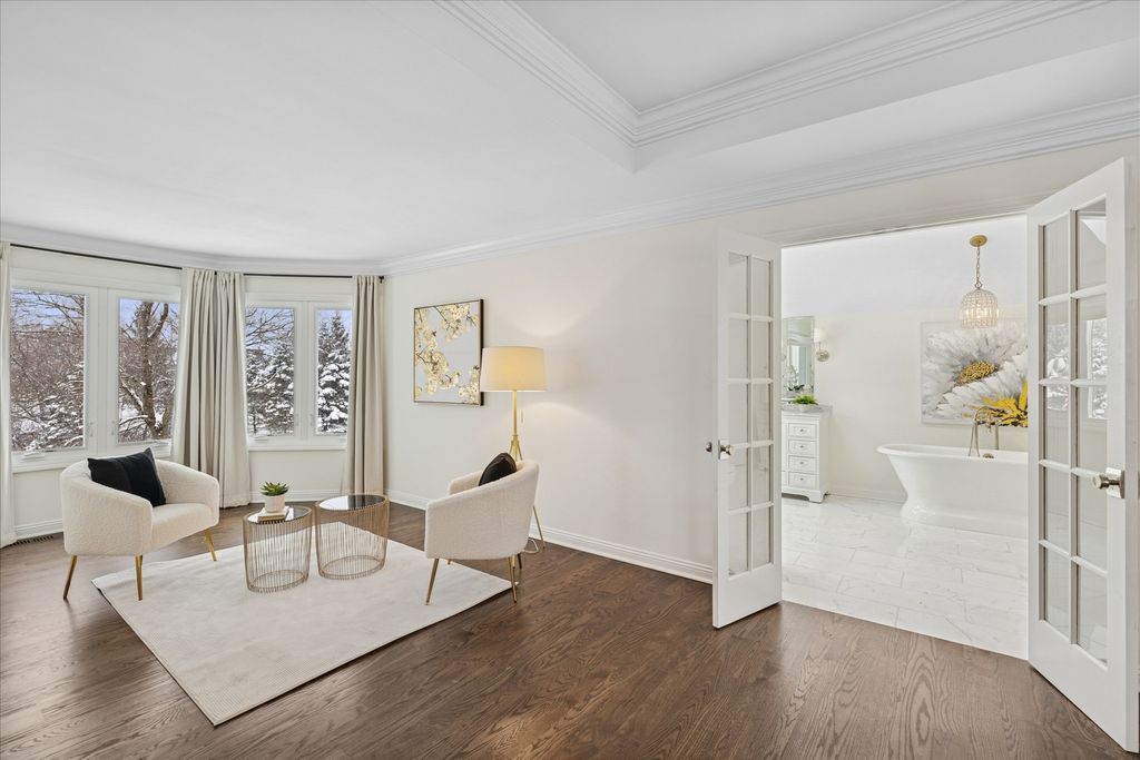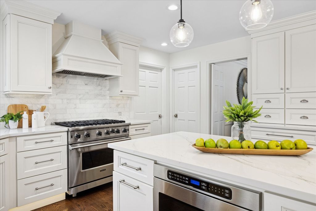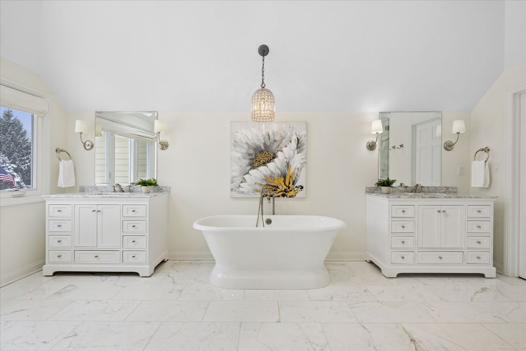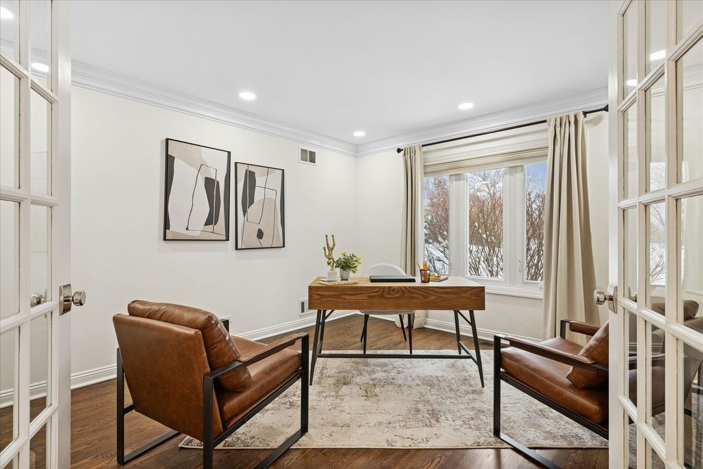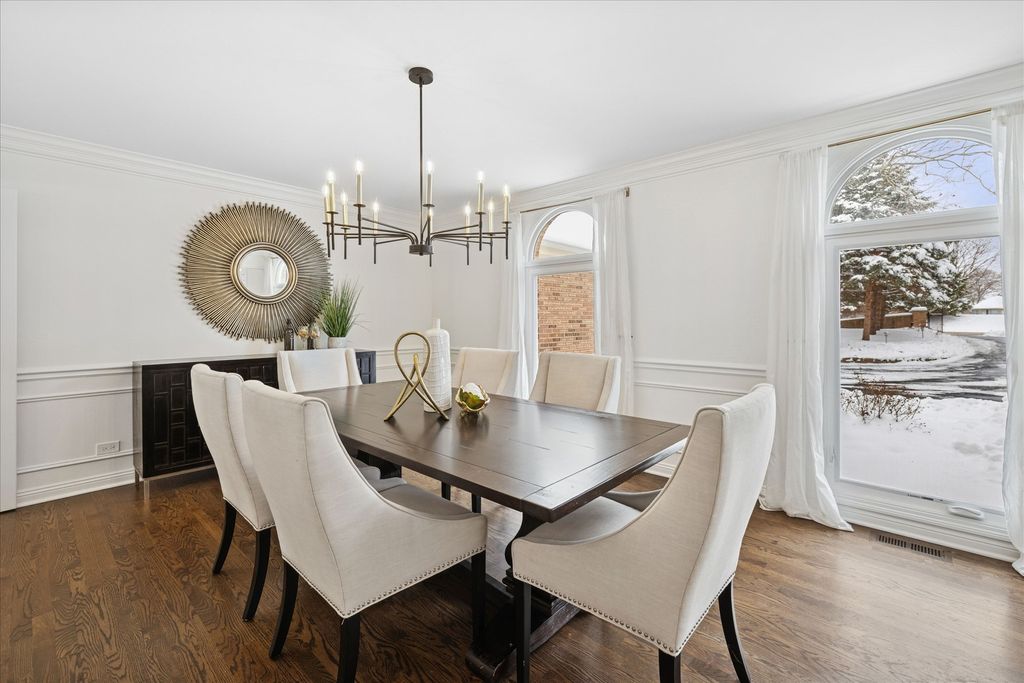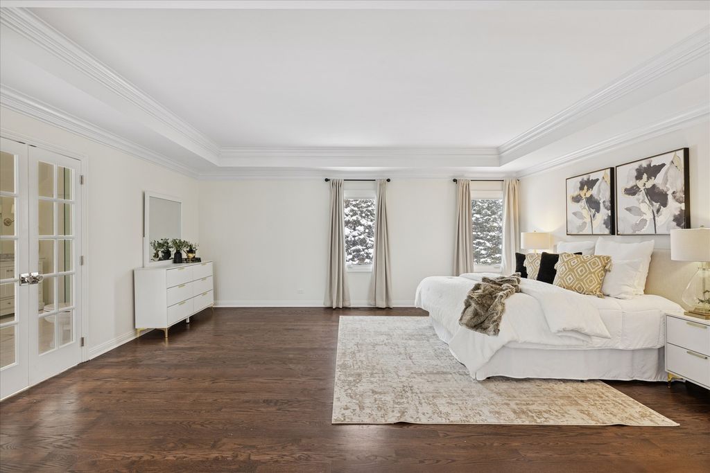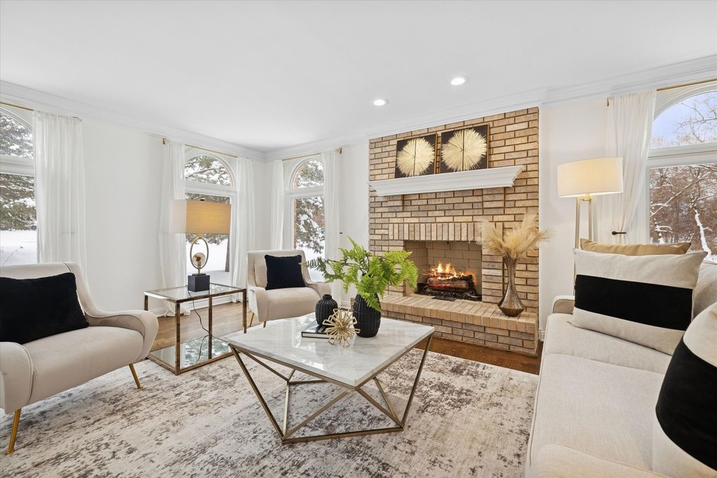 Welcome to your own private nature sanctuary on a serene 5.83-acre estate! This stunning Georgian-style brick and cedar custom home is tucked within a peaceful, wooded setting and includes water rights to non-motorized Old Oak Lake-just a short walk away with your own private pier. Completely remodeled with a modern farmhouse vibe, the home features rich hardwood floors, white trim, tray ceilings, crown molding, and expansive windows showcasing breathtaking views from every room. The gorgeous new kitchen includes white cabinetry with interior and under-cabinet lighting, a large island with seating, granite countertops, stainless steel appliances, and a walk-in pantry. The breakfast area opens to a spacious family room boasting a dramatic two-story whitewashed brick fireplace, skylights, and an impressive designer wet bar-perfect for entertaining. The main floor also offers a private office with French doors (ideal for remote work, playroom, or study), a generous dining room, and a living room/sitting room with a second fireplace. Upstairs you'll find four bedrooms, including a luxurious primary suite with a sitting area, skylights, a spa-like bath featuring a soaker tub, separate glass-enclosed shower, double sinks, a vanity area, and a huge walk-in closet. The additional bedrooms are all nicely sized with beautiful nature views. The hall bath offers both a tub/shower combination and an additional separate shower. The finished basement features a 9' ceiling height, recessed lighting, a large recreation area, half bath, and abundant storage. Step outside and enjoy the tranquility of your surroundings-relax on the new Trex deck, gather by the fire pit, stroll your acreage, or spend time at the lake. A new fence adds additional convenience if you have pets or children. Car enthusiasts and hobbyists will love the super-clean 3-car attached garage, fully drywalled, insulated, and finished with epoxy floors, plus a NEW oversized detached garage outfitted with heavy electric-ideal for a workshop, storage, or work vehicles. New driveway and all new windows. Mechanicals replaced in 2022. Located on the southwest side of Mundelein, directly across from Hawthorn Woods Country Club.
