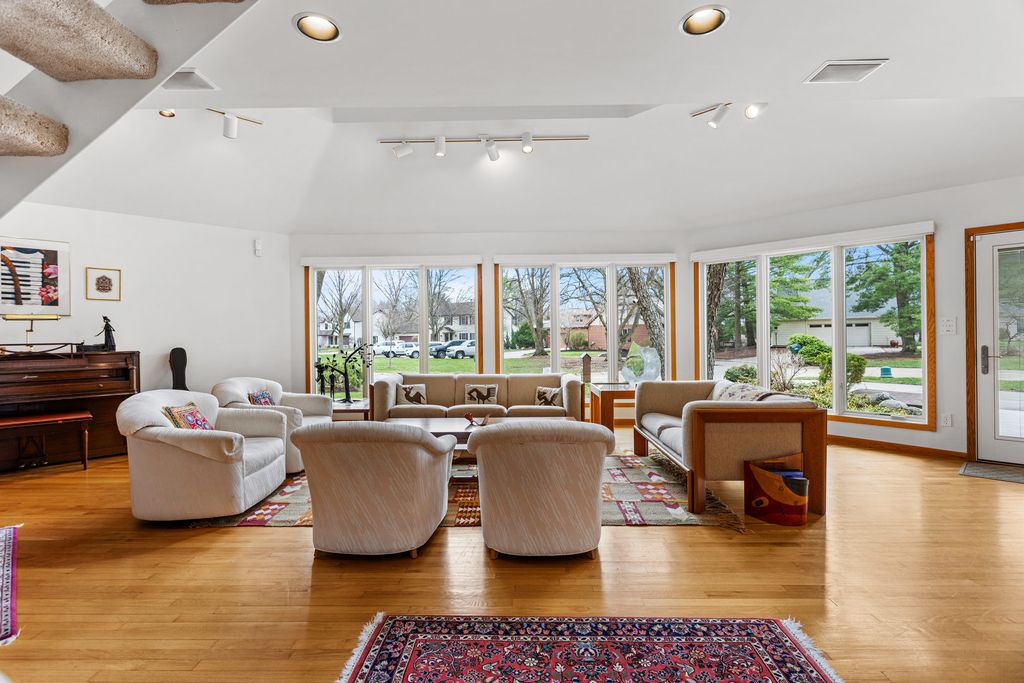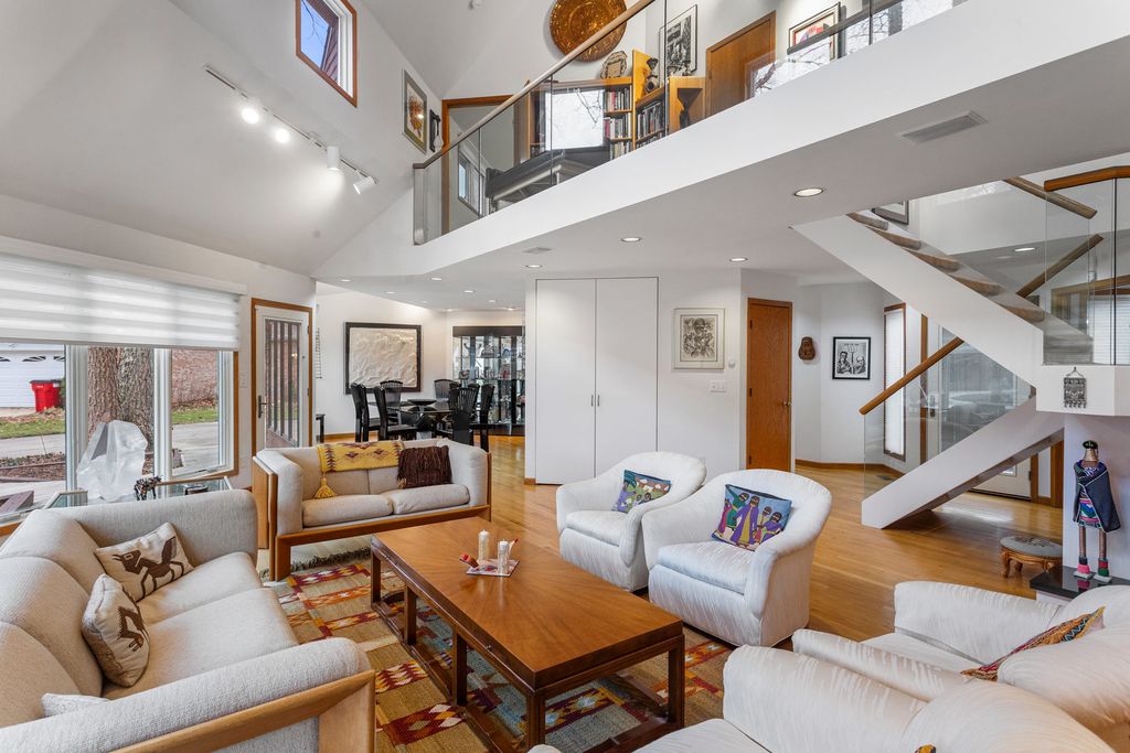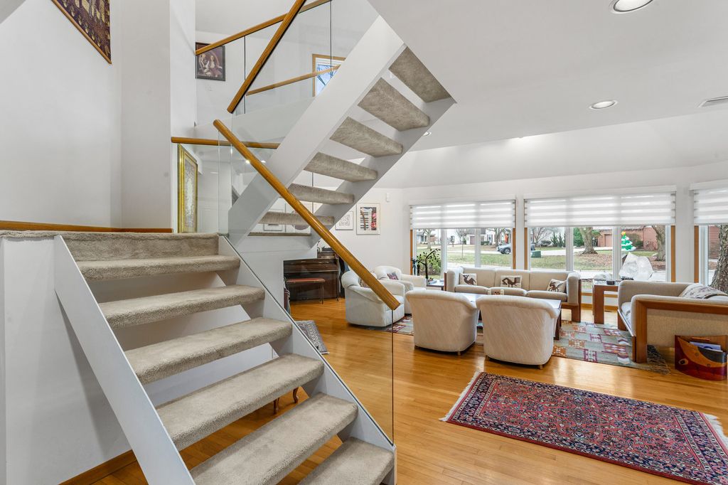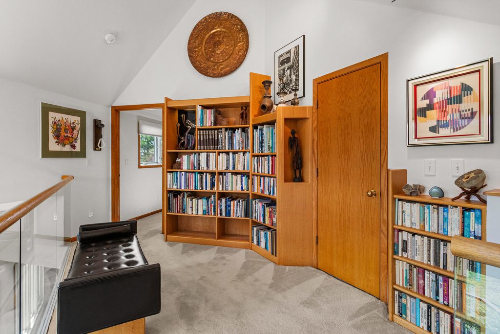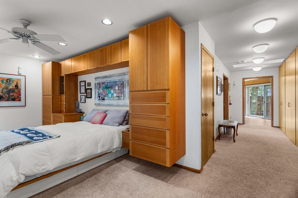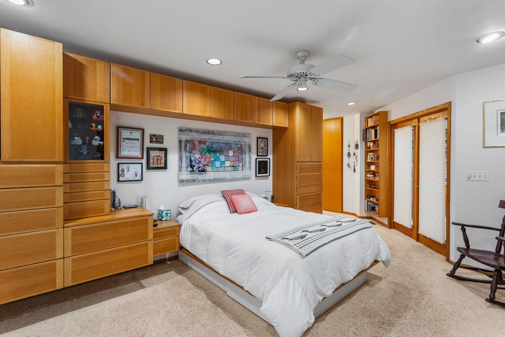 This beautiful, contemporary Passive Solar Home is located in highly sought-after Devonshire South, set on a cul-de-sac providing park-like views. Carefully maintained by its original owners, the home is custom-designed with a spacious layout designed for functionality and comfort. The home has vaulted ceilings, a large living room, and a dining room with an open floor plan, and expansive windows allowing for tons of natural light. The home has 3 or 4 bedrooms (depending on the configuration), 3.5 baths, two staircases, a two-and-a-half-car garage with an Electric Vehicle charger, and a completely encapsulated crawl space. Enjoy custom-built-in furniture and cabinetry throughout the house in the primary bedroom suite, office, dining room, sunroom, family room, recreation room, and hallways. The primary bedroom suite is located on the first floor and features extensive one-of-a-kind custom cabinetry in both the sleeping room and the attached private study, a gorgeous, recently updated bathroom, an oversized walk-in closet, additional cedar-lined closets, and a large sitting room with heated tile floors that has direct access to a private, fenced patio with a hot tub. The large kitchen area features Wolf double ovens, a Thermador cooktop, and a Sub-Zero refrigerator adjoining an eat-in area and family room. The laundry room features an Electrolux washer and dryer, utility sink, and a door to a large, private dog run. The second floor features two bedrooms, each with a private ensuite bath and walk-in closets. There is a stunning oak and glass-railed bridge connecting the bedroom suites, overlooking the living room and parkway. Also, on the second floor is a very large recreation room presently being used as an exercise, TV, and office space. The recreation room could be converted into an additional, very spacious bedroom. The large backyard is surrounded by more than two dozen trees and features extensive decking, tiered gardens, seating areas, and a fire circle.
