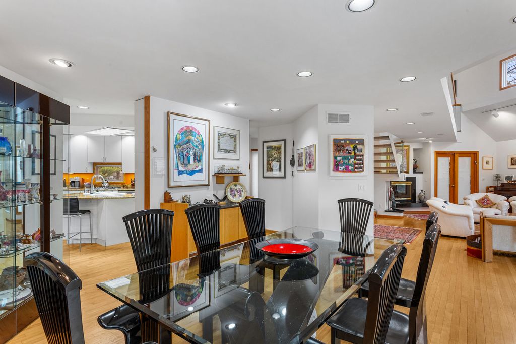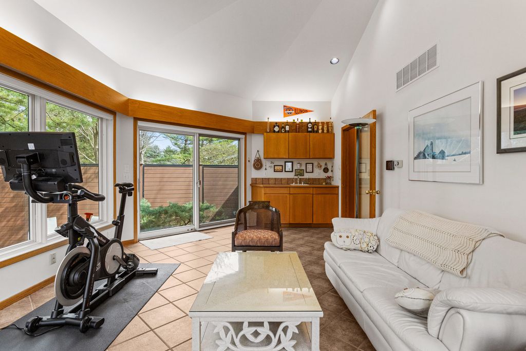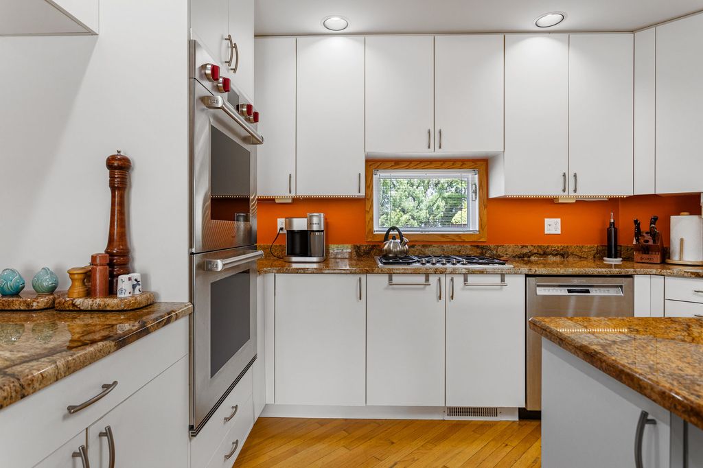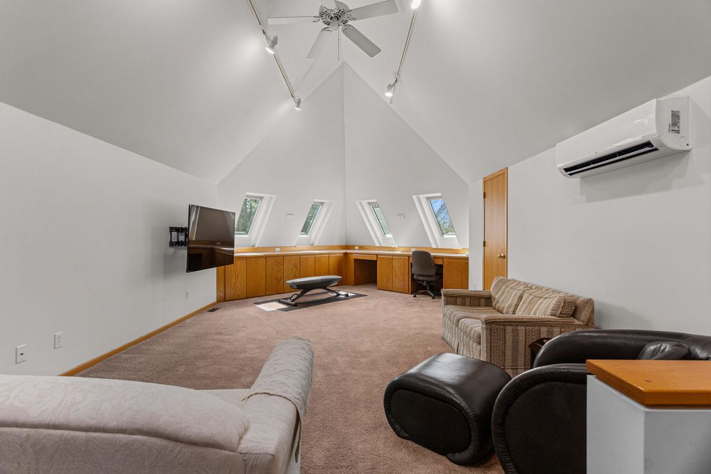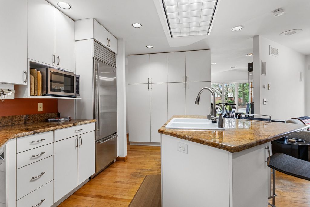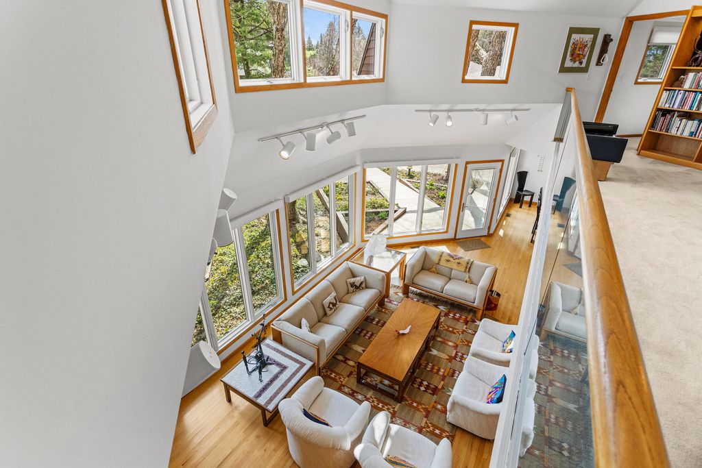 This beautiful, contemporary Passive Solar Home is located in highly sought-after Devonshire South, set on a cul-de-sac providing park-like views. Carefully maintained by its original owners, the home is custom-designed with a spacious layout designed for functionality and comfort. The home has vaulted ceilings, a large living room, and a dining room with an open floor plan, and expansive windows allowing for tons of natural light. The home has 3 or 4 bedrooms (depending on the configuration), 3.5 baths, two staircases, a two-and-a-half-car garage with an Electric Vehicle charger, and a completely encapsulated crawl space. Enjoy custom-built-in furniture and cabinetry throughout the house in the primary bedroom suite, office, dining room, sunroom, family room, recreation room, and hallways. The primary bedroom suite is located on the first floor and features extensive one-of-a-kind custom cabinetry in both the sleeping room and the attached private study, a gorgeous, recently updated bathroom, an oversized walk-in closet, additional cedar-lined closets, and a large sitting room with heated tile floors that has direct access to a private, fenced patio with a hot tub. The large kitchen area features Wolf double ovens, a Thermador cooktop, and a Sub-Zero refrigerator adjoining an eat-in area and family room. The laundry room features an Electrolux washer and dryer, utility sink, and a door to a large, private dog run. The second floor features two bedrooms, each with a private ensuite bath and walk-in closets. There is a stunning oak and glass-railed bridge connecting the bedroom suites, overlooking the living room and parkway. Also, on the second floor is a very large recreation room presently being used as an exercise, TV, and office space. The recreation room could be converted into an additional, very spacious bedroom. The large backyard is surrounded by more than two dozen trees and features extensive decking, tiered gardens, seating areas, and a fire circle.