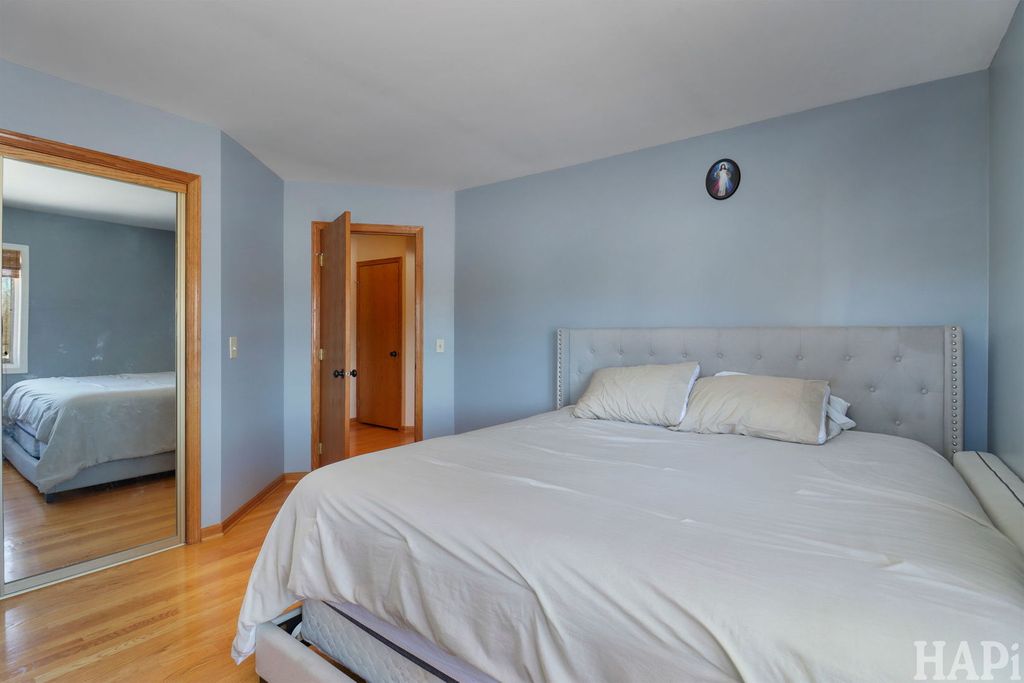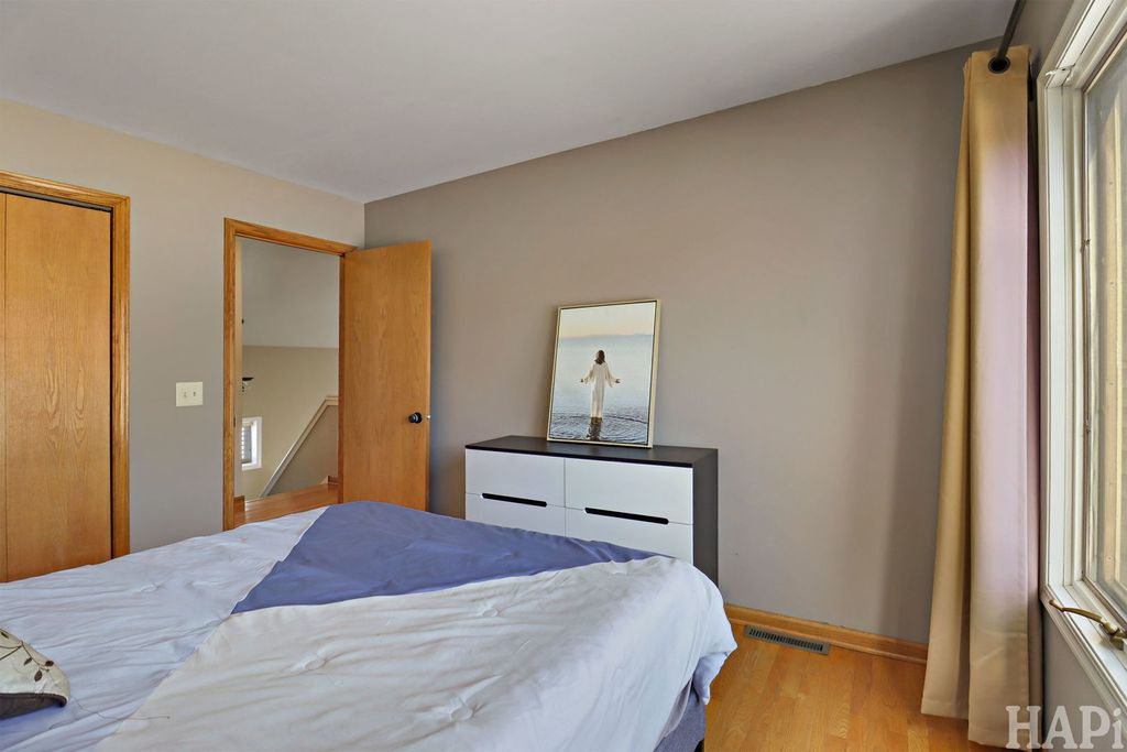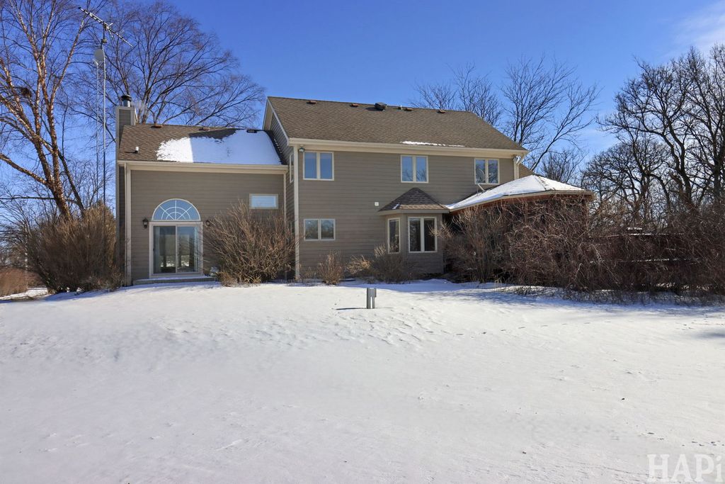 This charming 3 bedroom, 3 bath home is nestled at the end of a quiet cul-de-sac in desirable Harmony Hills, conveniently located off of I90, offering plenty of privacy on 1.44 acres! Enjoy spacious living areas, refinished hardwood floors (2022), and a welcoming front porch. With ample indoor and outdoor space, this home is perfect for entertaining or relaxing and taking in the nature around you. The living room features a coffered ceiling and custom fireplace. An updated kitchen (2019) with an oversized breakfast bar opens to a beautiful screened porch and large deck. The finished basement offers a flexible space for recreation, fitness, or even crafting! With a utility sink and half bath. Deck painted in 2024. Newer water heater, fridge, dishwasher, and sump pump (2023). Move in ready & waiting for its next chapter!