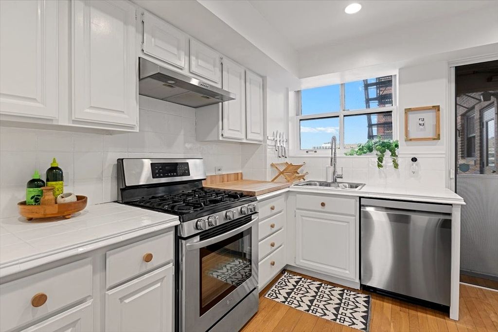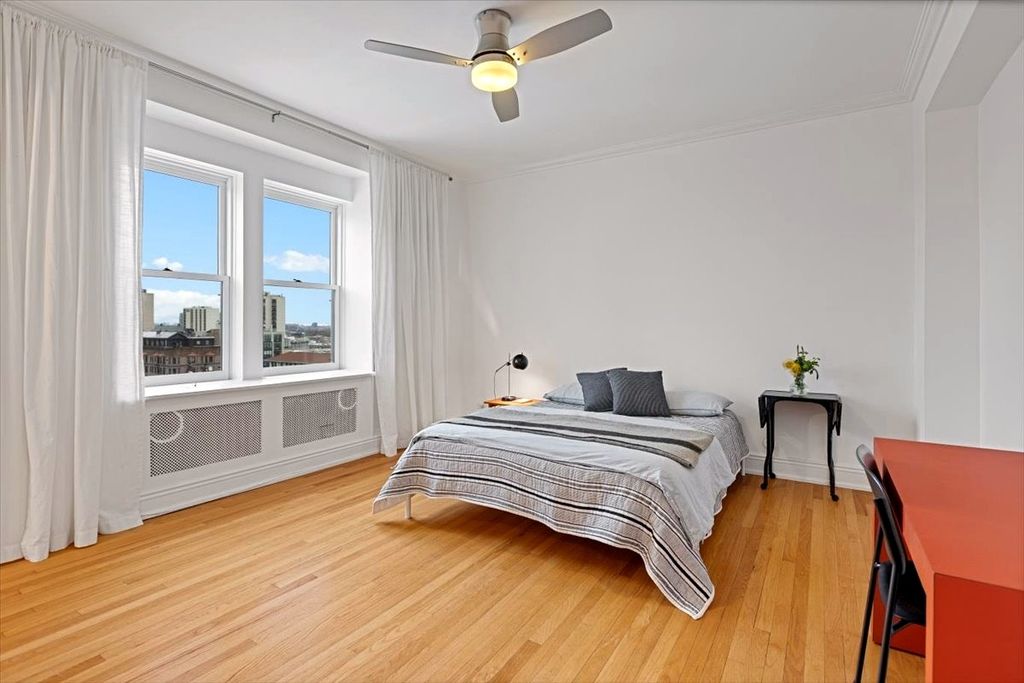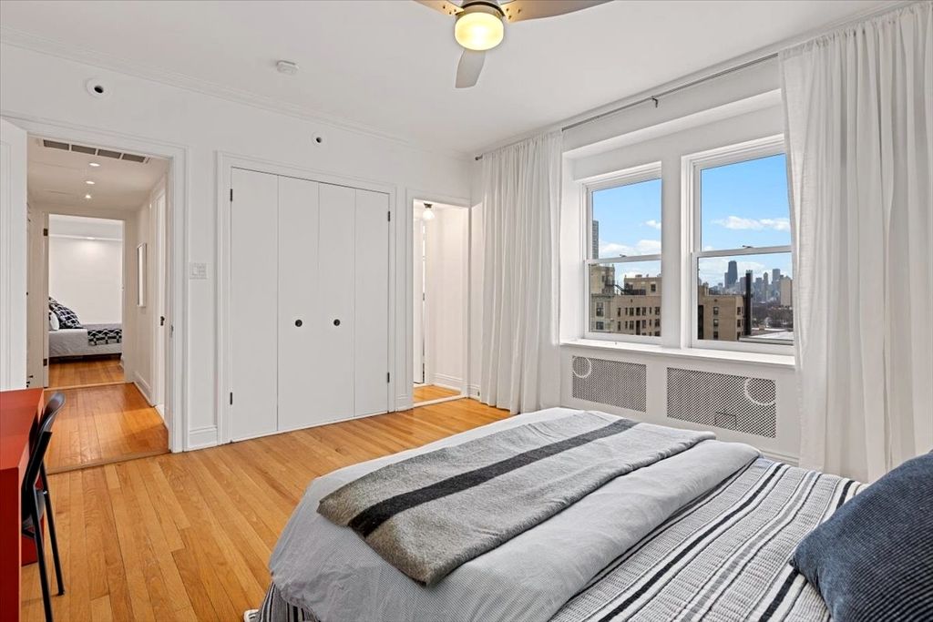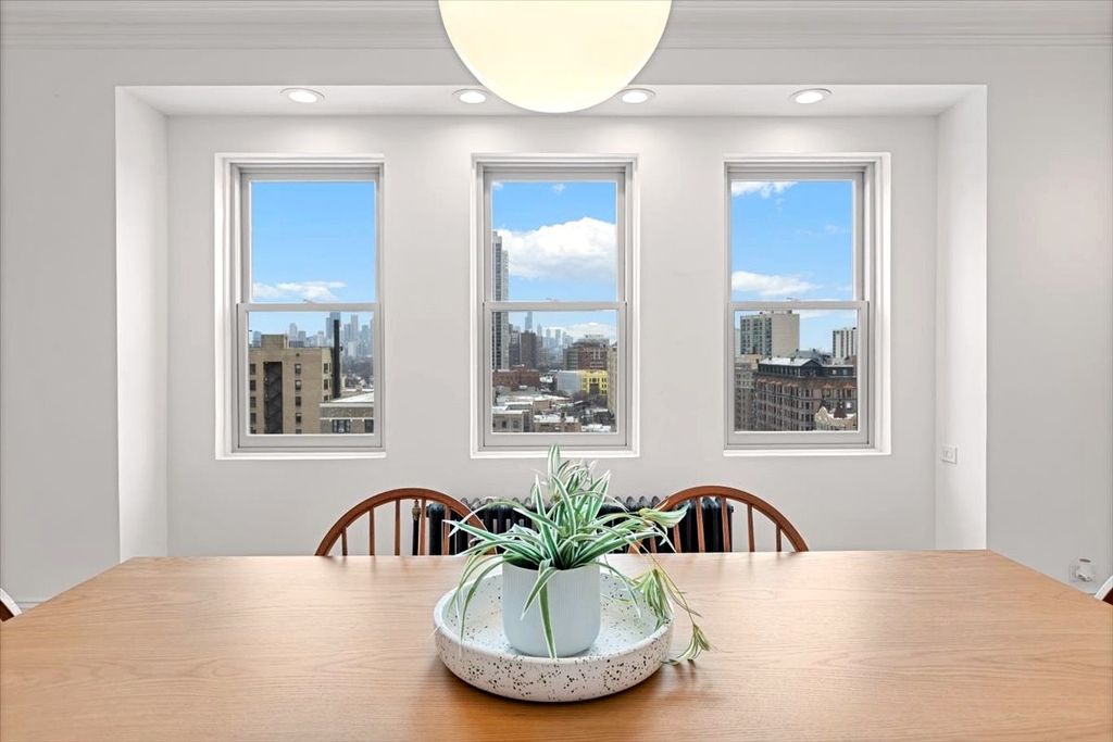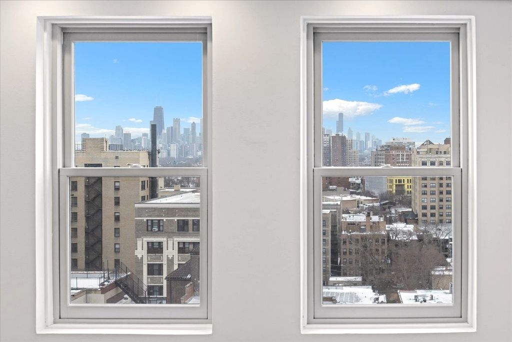 High-floor 2-bedroom, 2-bath vintage condo in the distinguished Oakdale Towers - a 1920's Lakeview East building designed by noted architects E.F. Quinn & R.T. Christiansen! With only two units per floor, this residence offers exceptional privacy along with sweeping lake and skyline views. A gracious arched gallery foyer leads into sun-filled living and dining spaces featuring original hardwood floors, restored millwork, custom built-ins, and an original green marble decorative fireplace. Large windows provide excellent natural light and dramatic city views throughout. The kitchen offers stainless steel appliances, a brand-new dishwasher and exhaust fan, fire-rated windows, and ample storage. Both bedrooms are generously sized and include built-ins, with the primary suite highlighted by original stained glass and an en suite bath. Both bathrooms blend vintage charm with modern updates, including original porcelain fixtures, restored medicine cabinets, freshly glazed tubs and tile, Kohler finishes, new toilets, upgraded faucets, and spa-style rain showers. Additional features include SpacePak central air with Nest thermostat, all new windows (2021), restored and rewired original lighting, Schoolhouse and Rejuvenation fixtures, new LED recessed can lighting with dimmers, concealed TV wiring, and professional paint throughout (custom white, 2023). The pet-friendly, elevator building offers a rooftop deck with grills and seating, fitness center, laundry room, private storage (closet, not cage), on-site engineer (Monday-Friday), and new ButterflyMX security and keyless entry system. No deeded parking; but multiple rental options available nearby. This prime Lakeview East location is steps to the lakefront, dining, shopping, transit, and everything that the Broadway corridor has to offer!