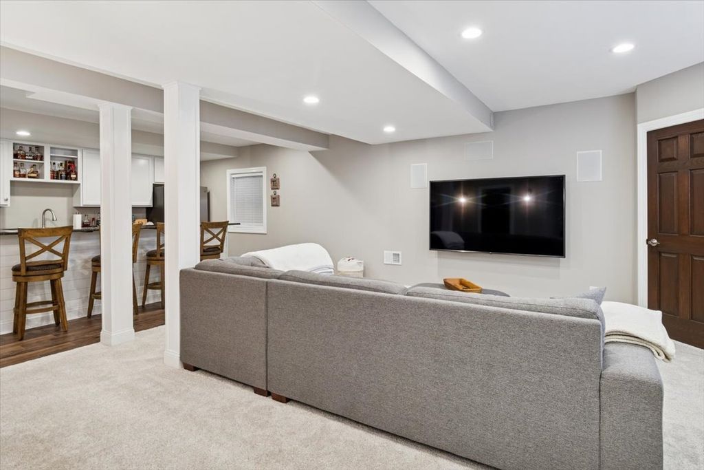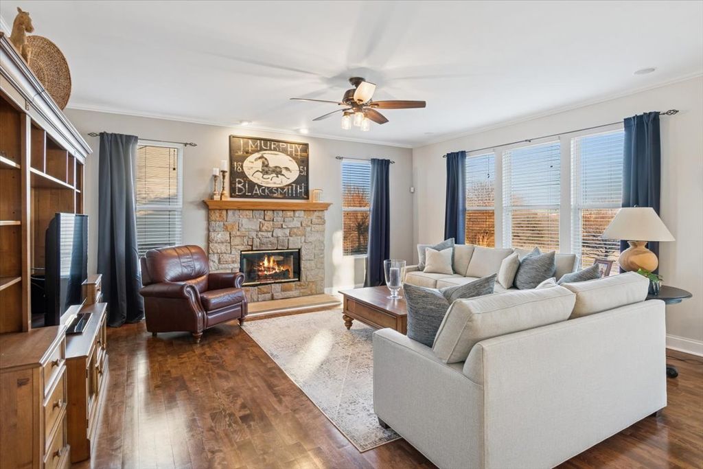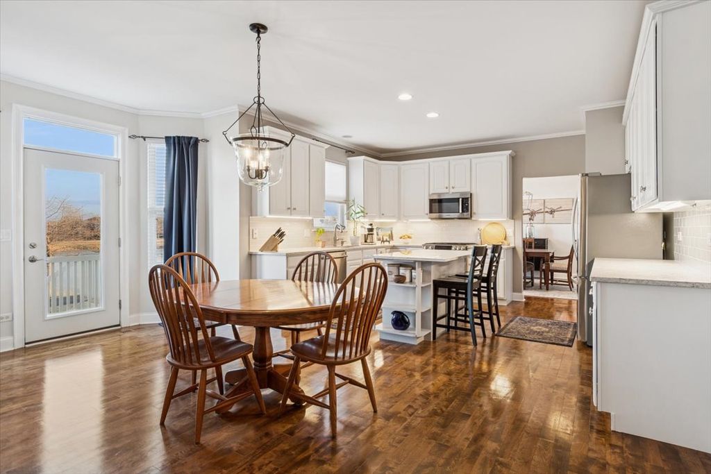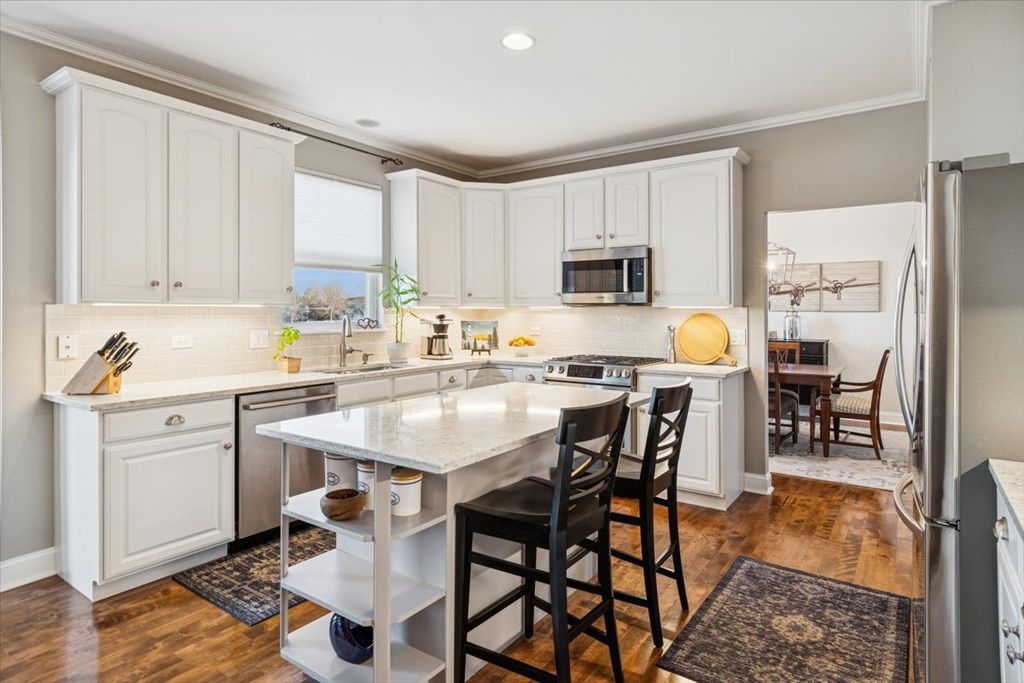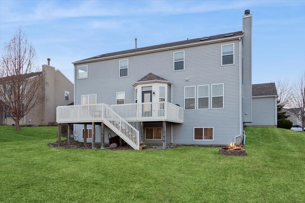 Stunning and extensively updated Maplewood model offering over 3,200 square feet of above-grade living space plus a fully finished lookout basement, perfectly positioned on a premium lot backing to a pond and walking trail in the desirable Crossings at Wolf Creek subdivision, located in the highly regarded Plainfield School District 202 (North Plainfield). A dramatic two-story foyer opens to the formal living and dining rooms, with the living room featuring floor-to-ceiling windows that flood the space with natural light, while oversized trim, crown molding, wrought iron railings, solid oak doors, and birch hardwood floors throughout the entire main level create timeless appeal. The dining room is accented by a tray ceiling, and the updated kitchen showcases white cabinetry, quartz countertops, tile backsplash, stainless steel Bosch appliances including a dual-fuel oven, center island with seating, pantry, and a spacious table area with a bay window overlooking the deck and serene pond views. The inviting family room features a beautiful stone fireplace with mantel, and in-ceiling speakers, ideal for entertaining or relaxing. A first-floor office provides flexible living space. Upstairs, the expansive primary suite offers a large bedroom with an oversized sitting or office area, two walk-in closets, and a private luxury bath with dual sinks, whirlpool tub, separate shower, and built-in speakers, with ceiling fans in all bedrooms. The second full bathroom has been fully updated and includes dual sinks. The finished lookout basement adds exceptional living and entertaining space with a full bathroom, sauna, wet bar with granite countertops, stainless steel refrigerator, extensive cabinetry, built-in speakers, and a backup sump pump. Additional highlights include loads of recessed canned lighting throughout, all updated light fixtures, new carpet in 2023, updated deck, sprinkler system, 200-amp electrical service, a three-car garage with refrigerator included, and washer and dryer that stay. Conveniently located near shopping, dining, and major commuter routes, this move-in-ready home offers thoughtful updates, generous space, and a premium setting an exceptional opportunity in Plainfield.