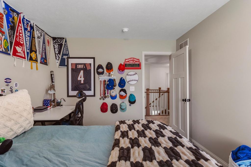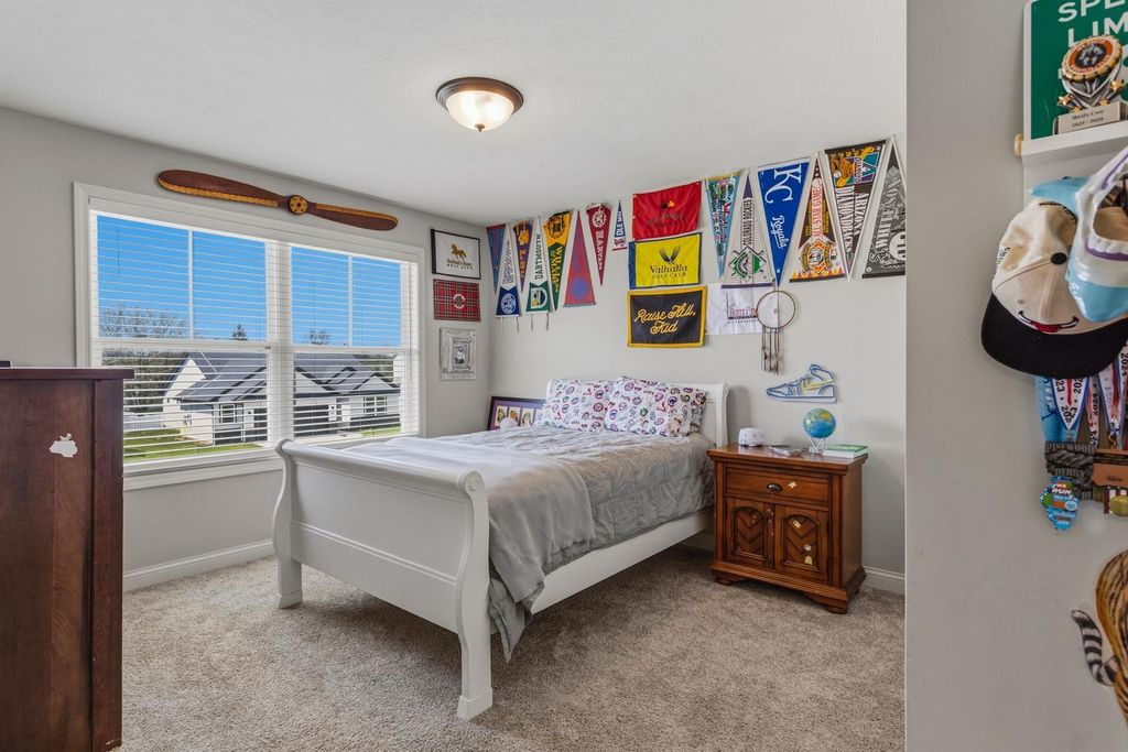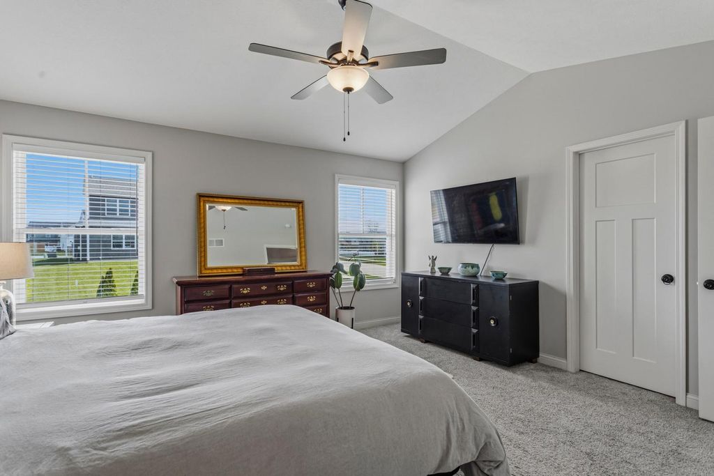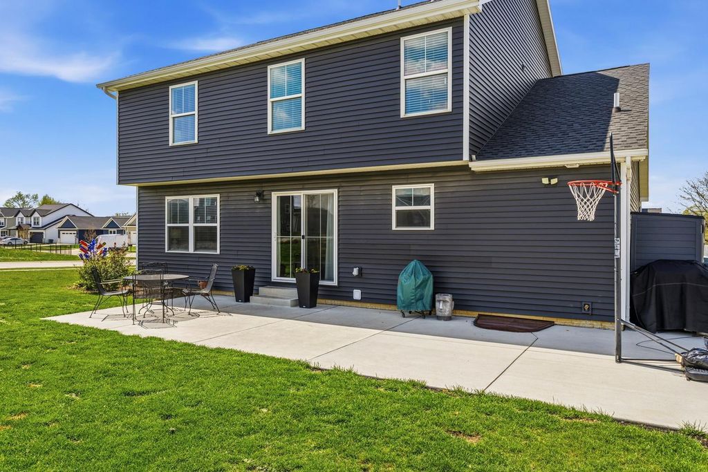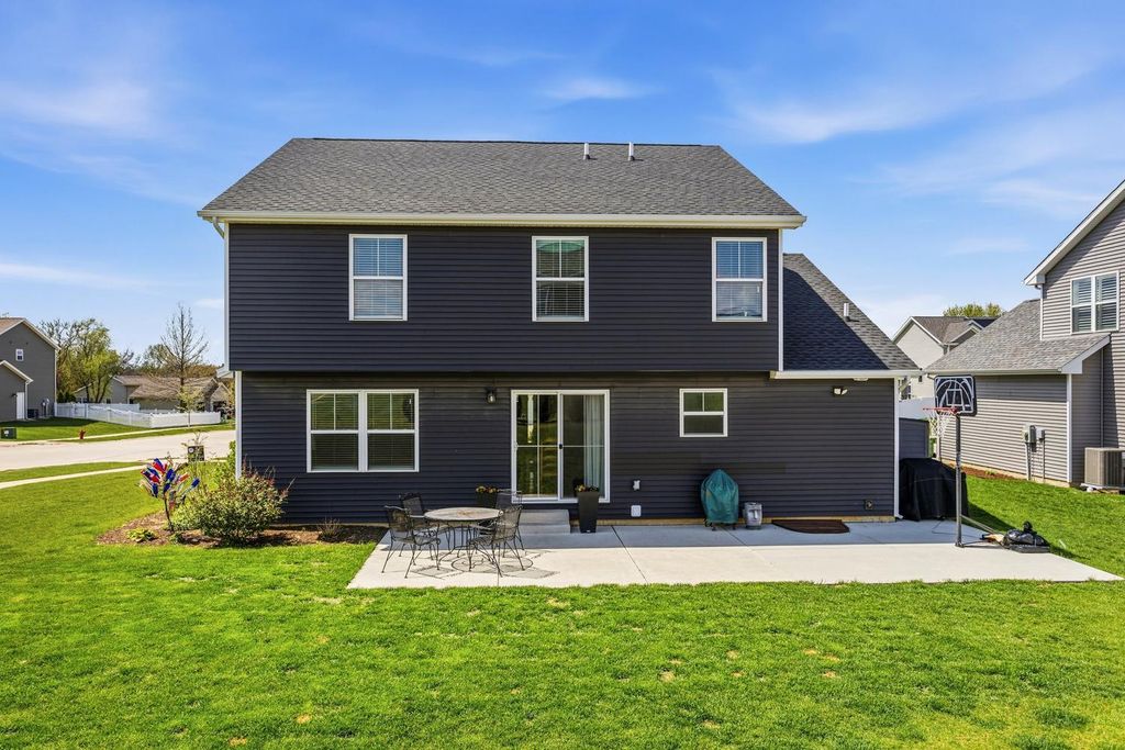 Built in 2022 and located in the desirable Hunter's Ridge Subdivision in Mahomet, this beautifully maintained home sits on a large corner lot with professional landscaping - an upgrade the sellers thoughtfully invested in - and offers 5 bedrooms and 3.5 baths, including a basement that was finished after closing as an added investment, now featuring a 5th bedroom and full bath. The welcoming floor plan offers an open-concept layout with a stunning kitchen showcasing cream-colored cabinetry, quartz countertops, and tile backsplash, flowing seamlessly into the living room highlighted by a cozy gas log fireplace and access to a large patio slab perfect for outdoor entertaining. The vaulted primary suite provides a spacious retreat with a walk-in shower and double sinks, while both upstairs bathrooms feature double vanities for added convenience. A functional back entrance from the garage and a half bath tucked behind the kitchen complete this move-in ready home that blends quality upgrades, space, and everyday functionality. View it today!