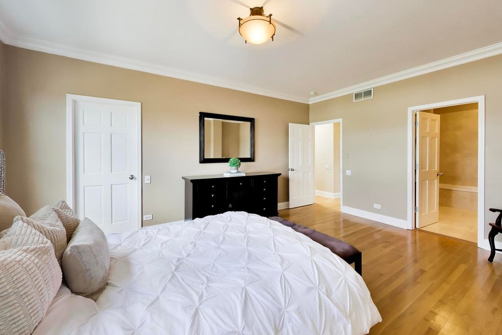 Beautifully updated and light-filled townhome ideally located near the heart of downtown Glenview. Offering 3 bedrooms and 3.1 baths, this spacious home features thoughtful upgrades, quality craftsmanship, and a bright southern exposure that fills the home with natural light throughout the day. The main living area showcases hardwood flooring throughout, vaulted ceilings, and custom oversized crown molding and baseboards that add a refined finish to every room. The updated kitchen features custom cabinetry with soft-close drawers, granite countertops, porcelain tile backsplash, under-cabinet lighting, and stainless steel appliances. The layout flows seamlessly into the dining and living spaces, creating an ideal setting for both everyday living and entertaining. Upstairs, the generously sized primary accommodates king-sized bed and more plus walk in closet and ensuite bath. Additional bedroom has the comfort of a workspace plus each featuring walk-in closets with built-in shelving and full bathrooms. The bathrooms are beautifully appointed with marble tile, custom vanities, granite countertops, Robern medicine cabinets, Grohe fixtures, and Toto water-efficient toilets. A convenient additional bedroom and full bath provide flexible living space for guests, family, or a home office. Additional interior features include recessed lighting throughout, custom Hunter Douglas window treatments, solid wood bedroom doors, upgraded electrical outlets, and quiet Panasonic exhaust fans with integrated lighting. Exterior and community improvements completed between 2020-2025 include new roofs, Renewal by Andersen windows and sliding glass doors, new skylights, newly constructed decks and railings, resurfaced driveways and courtyard, brick paver driveway aprons, irrigation system, and beautifully landscaped grounds with mature trees and flowering plantings. The attached garage includes a newer door with opener and key access, along with updated laundry room. Ideally situated just moments from downtown Glenview, Metra, restaurants, shopping, and award-winning schools, this move-in ready home offers the perfect combination of location, comfort, and quality upgrades. See additional information for all the updates.