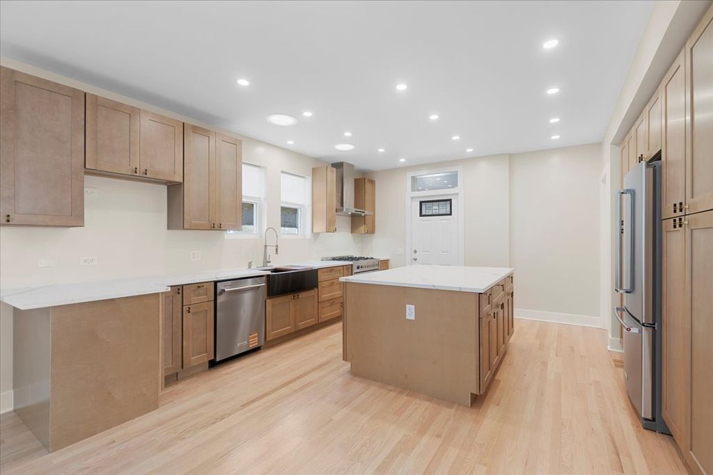 Quintessential Chicago bungalow in the Tallman / West Ridge Bungalow Belt, ideally positioned between two of the neighborhood's most beloved green spaces-Indian Boundary Park and Warren Park. This fully reimagined six-window-wide brick bungalow blends timeless Chicago character with thoughtful modern design and remarkable flexibility for today's lifestyle. At the center of the home, the traditional bungalow layout has been transformed to create a dramatic two-story living and dining space, filling the heart of the home with natural light and an open flow that connects the living room, dining area, and kitchen-perfect for everyday living and effortless entertaining. The chef's kitchen features quartz countertops, custom cabinetry, and stainless appliances, opening to a cozy den or office and a mudroom that leads to the backyard. The main level offers two ensuite bedrooms, enhanced by four skylights that bring in abundant natural light. Upstairs, you'll find two additional bedrooms, a spacious walk-in closet, full bath and optional second laundry. The walk-out lower level adds exceptional versatility with a large family room, kitchenette, two additional bedrooms, a full bath, laundry room, and extensive storage-ideal for extended living, guests, or flexible use. Outside, enjoy an oversized two-car brick garage plus an additional parking pad that doubles as a private outdoor entertaining space. Located on a quiet, tree-lined street, just moments from Warren Park's golf course, tennis courts, fields, and playgrounds and the historic gardens, lagoon, and cultural center at Indian Boundary Park. The Rogers Park Metra station is less than a mile away. Full list of updates in additional documents, this home offers the rare combination of classic Chicago architecture, modern livability, and an exceptional neighborhood setting.