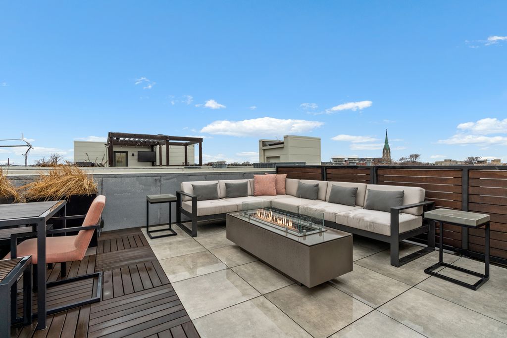 Sleek, stylish and extra wide 4 bedroom, 4.1 bath Lincoln Park row home with a 2 car attached heated garage and 4 outdoor spaces including a custom roof deck terrace with high-end finishes, landscaping, and stunning skyline views - all in one of the city's best locations. Attention to detail exudes throughout this LG Development home. You enter the home through a private gated entrance that opens into your front yard/patio space and leads into the home foyer. On this level is a large multipurpose space/mudroom with ample storage, closet space, and a full bath - flexible as either a workout room or home office. The main living area on the second floor is an open light filled space with high ceilings, rich hardwood flooring, and lovely custom walnut cabinetry and accent walls. This floor is anchored by a beautiful kitchen space, with an expansive white statuary marble waterfall island, SubZero, Wolf, and Mielie appliances, ample built-in cabinet and storage space as well as a custom-built banquette/breakfast nook. This level also features a living room w/fireplace and dining room perfect for seamless entertaining. A half bath and a patio perfect for morning coffee or grilling complete this space. On the third level is the primary suite, a quiet and peaceful oasis featuring two separate walk-in closets and a spa-like bathroom with heated floors, soaking tub, a large walk-in steam shower with bench, and water closet. A second bedroom on this level comes with an en-suite bath perfect for child or guests. The top level of the home comes with 2 additional bedrooms, another full bath as well as a walk-in laundry room with side-by-side washer/dryer and storage. The top floor also features a family/media room with custom built-ins and a wet bar that opens directly to fabulous outdoor living space-perfect for seamless indoor-outdoor gatherings. This incredible home is capped off with a newly updated private roof deck space with spectacular city views. This enormous outdoor space boasts Italian porcelain pavers, Ipe wood accent floors, fire table, drip irrigation for landscaping, and a built-in grill, refrigerator, and countertop perfect for entertaining and relaxing. The attached, spacious, heated garage has epoxy floors and is located in the building's gated courtyard with an entrance on Lakewood, also has extra space perfect for storage. Located in one of Lincoln Park's best pockets, you'll have easy access to public transportation, bars and restaurants, grocery stores and shopping. This row home lives like a single family home and offers the best in City Living.