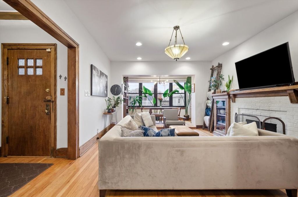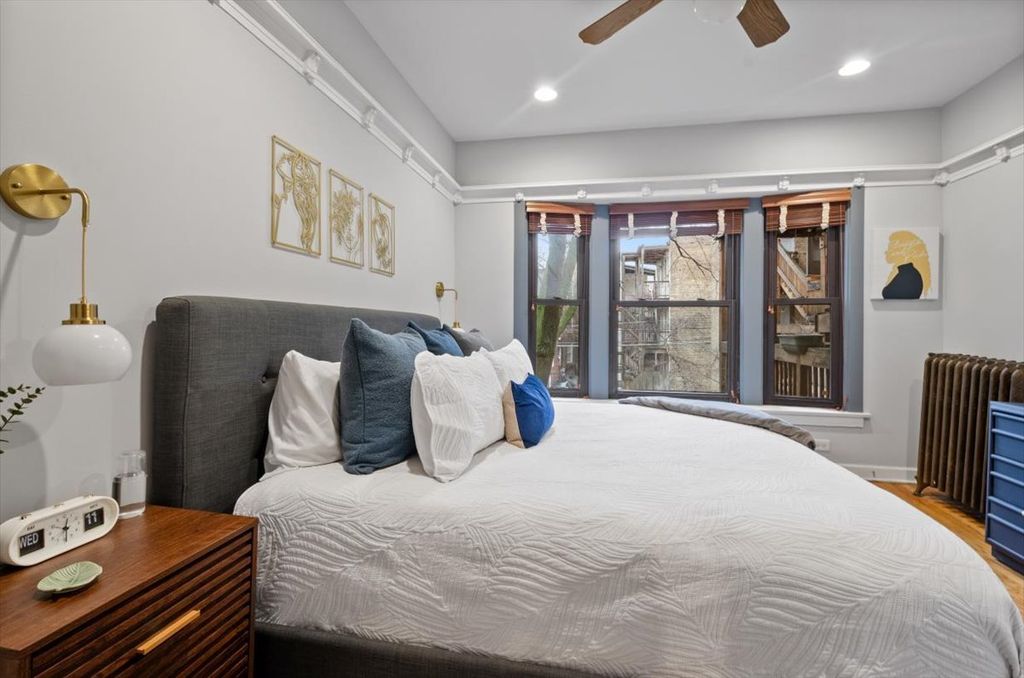 This Classic Chicago updated vintage 2-bedroom beauty in highly sought after East Lakeview will simply take your breath away! Gorgeous original woodwork, gleaming hardwood floors and a beautiful gas fireplace with original built-in bookcases center the living room experience while the dining room enjoys light from two exposures and can easily host a dinner party for six! Notice the lovely design elements of the kitchen with recent updates of quartz countertops, 42" cabinets, ceramic tile backsplash and wine fridge. The bathroom was fully gutted and features ceramic tile shower, marble vanity and porcelain tile flooring. The primary bedroom is flooded with natural light and comfortably accommodates a king-size bed while the second bedroom includes a Murphy Bed and custom closet all within a flexible work-from-home space. The dedicated outdoor deck overlooks a lush courtyard and awaits your morning coffee routine. Finish your check list with the convenience of in-unit laundry, a large private storage unit and common area bike room! This pet-friendly, thoughtfully managed building is in an A+ location within minutes of Wrigley Field, public transit, entertainment, Lake Michigan and The Lake Front Trail!
