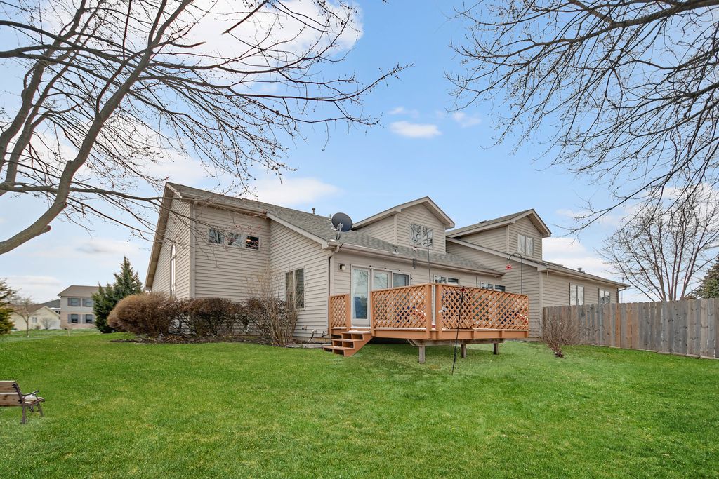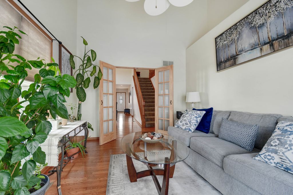 TERRIFIC OPEN & AIRY DESIGN distinguishes this attractive duplex with a convenient first-floor master bedroom, ideally situated on a large corner lot in sought-after Old Plank Road Estates. The gracious interior features a spacious eat-in kitchen with an abundance of cabinets, open to a large living room highlighted by impressive vaulted ceilings. French doors lead to a versatile vaulted family room/sunroom or den, perfect for relaxing or entertaining. Beautiful hardwood floors extend throughout these main living areas. The convenient main-level master suite offers newer carpeting, a large private bathroom, and a generous walk-in closet, along with a main-level laundry room for added convenience. Upstairs, you'll find newer carpeting, a second bedroom with its own ensuite bathroom, and a cozy loft with a large storage closet. Need additional storage? A 4.5-foot walk-in crawlspace provides plenty of room. Additional highlights include a newer concrete driveway and the added benefit of NO (ever-increasing) ASSOCIATION DUES. Priced to sell, so schedule your viewing before this opportunity is gone.