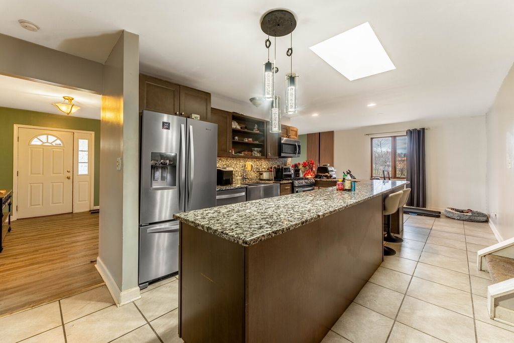 Discover the potential in this spacious quad-level residence offering 4 bedrooms and 3.5 bathrooms with a thoughtfully designed layout and generous living spaces throughout. The home features an open concept main level that creates a comfortable flow for everyday living and entertaining. At the heart of the home is a large kitchen designed for functionality and gathering, highlighted by a granite L-shaped island with breakfast bar seating, abundant cabinetry, granite countertops, and stainless steel appliances including a double oven and microwave. A farmhouse sink positioned beneath a skylight brings in natural light and adds character to the space. The main level family room provides a welcoming atmosphere with a wood burning fireplace with gas starter, perfect for relaxing evenings, and offers direct access to the deck and patio, extending the living area outdoors. A first-floor laundry room adds everyday convenience. The lower level offers additional living flexibility, featuring a bedroom and full bathroom, making it well suited for extended family, guests, or related living arrangements. Below, a large unfinished sub basement provides excellent storage or the opportunity for future finishing based on your needs. This property presents a great opportunity for buyers looking to add their own updates and personal touches. The home is being sold AS-IS, offering the next owner the chance to bring their vision to life.