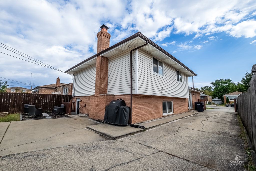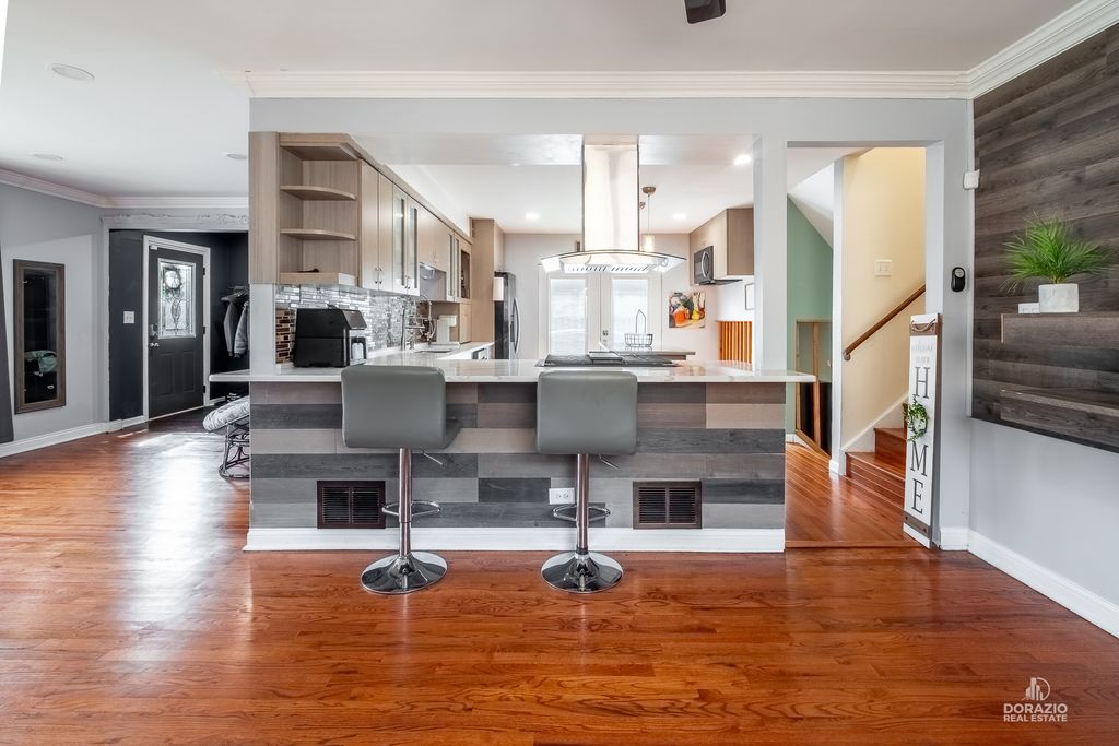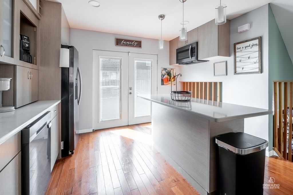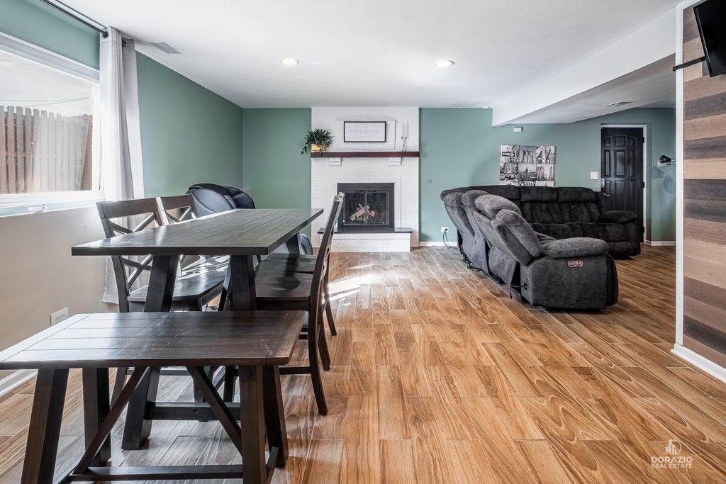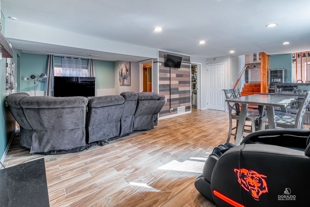Welcome to this beautifully updated 3-bedroom, 3-bath split-level home, thoughtfully designed for both comfort and entertaining. Recently refreshed with modern, stylish finishes, this home features hardwood flooring throughout, custom built-in shelving in the foyer, and a striking media wall in the living room. The kitchen is sleek and functional, offering quartz countertops, an island with seating, and direct access to the yard through double doors with built-in blinds. All three bedrooms are located on the upper level, including a spacious primary suite with a private en suite bath. Downstairs, the expansive L-shaped family room is perfect for gatherings, complete with a wet bar, wood-burning fireplace, and full bathroom-ideal for guests. The lower level also includes a laundry room with newer Maytag appliances and a secondary exit for added convenience. Outside, enjoy a low-maintenance backyard with a firepit and dedicated lounge space. The extra-long driveway includes several parking spots in addition to the finished 2-car garage with shelving and drywall. Smart home features include fiber-optic internet, smart lighting, a smart thermostat, Ring doorbell, and ADT camera system. Recent updates: custom blinds throughout, sump pump (2024), washer/dryer (2024), dishwasher (2023), garage door opener (2024), and fresh interior paint. Roof is 9 years old. Tucked at the end of a quiet cul-de-sac, this home blends modern style, convenience, and comfort-all in a peaceful setting.