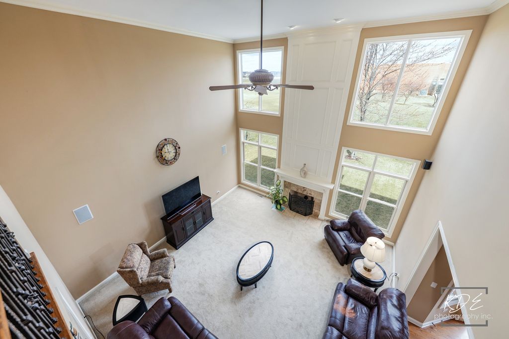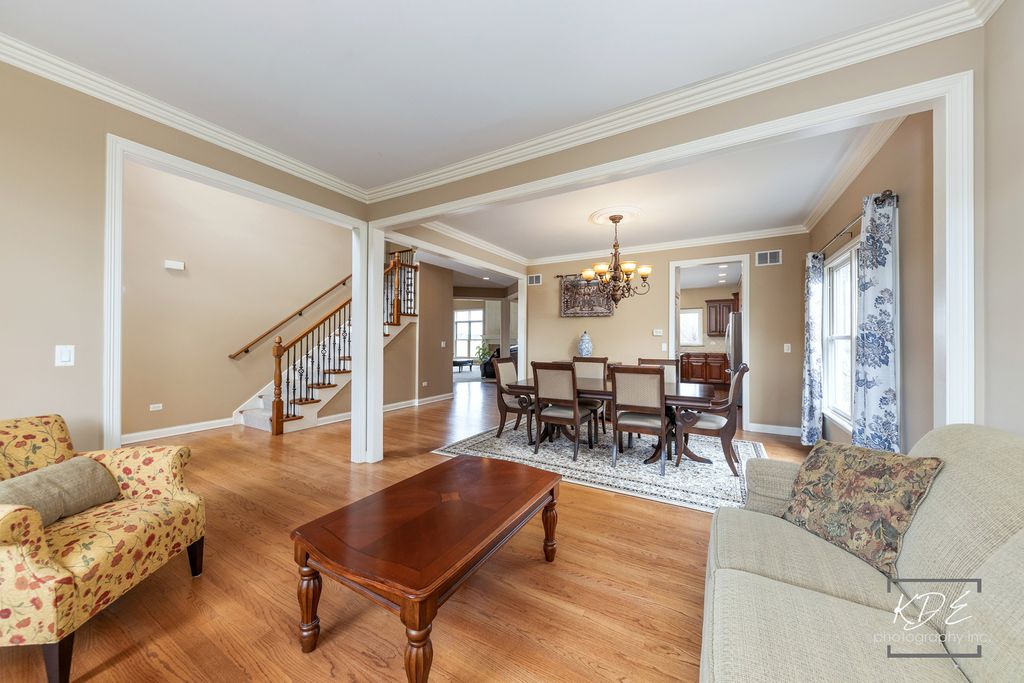Beautiful custom-built home featuring timeless design and impressive space throughout. Soaring volume ceilings, hardwood flooring, wide moldings, and a custom staircase create a warm and inviting first impression, complemented by detailed trim work across the home. The light-filled two-story family room flows seamlessly into the spacious kitchen, complete with a large granite island, 42" cabinetry, stainless steel appliances, tons of counter space and a walk-in pantry: ideal for everyday living and entertaining. A private first-floor den at the rear of the home offers a quiet retreat for work or relaxation. Upstairs, you'll find four generously sized bedrooms with walk-in closets and convenient bath access, providing comfort and functionality for all. The finished LOOKOUT basement expands the living space with an additional bedroom with a walk-in closet, another full bath, a large recreation area-perfect for guests, and an area for fitness, hobbies, etc. Enjoy serene views backing to open green space and a middle school, all located within highly acclaimed District 204 and sought-after Neuqua Valley High School. Residents also enjoy access to an exceptional clubhouse and pool.