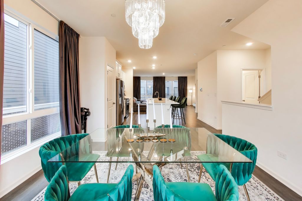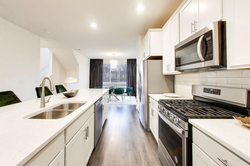 Welcome to this well-maintained corner/end-unit townhome located in the Northgate at Veridian community in Schaumburg. Positioned to allow for additional privacy and enhanced natural light, this home offers a functional open floor plan with 3 bedrooms, 3.5 bathrooms, an oversized 2-car garage, and a finished lower-level flex room with a full bathroom, suitable for office, guest space, or additional bedroom use. Main level features 9-foot ceilings, an abundance of windows providing natural light, and wood laminate flooring throughout. Kitchen includes 42" white cabinets with crown molding and soft-close drawers, quartz countertops, subway tile backsplash, island with seating, pantry, and stainless steel appliances. Kitchen opens to dining and living areas, creating a practical layout for everyday use and entertaining. Second level includes primary suite with walk-in closet and private bath featuring dual sinks and ceramic tile flooring. Two additional bedrooms, full bathroom, laundry room, and linen storage also located on upper level. Additional features include tankless water heater, energy-efficient HVAC system, EV charger conduit in garage, and smart home features including video doorbell, thermostat, and smart lock. Located near planned Veridian development amenities including mixed-use district, walking and biking trails, and park space. Convenient access to highways, shopping, and dining. Located in Fremd High School District.