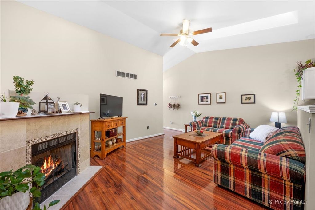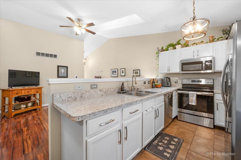 Looking for low-maintenance living without giving up space? This one checks the boxes. Welcome to this beautifully updated end-unit townhome, move-in ready and designed for easy living. With 3 bedrooms and 2 full baths, there's plenty of room to spread out while still keeping things simple. The main level features wood laminate flooring throughout, including the spacious primary bedroom, which offers two closets and great natural light. The shared full bath has a functional layout with plenty of space. The kitchen has been refreshed with painted white cabinets, newer stainless steel appliances, updated countertops, sink, and faucet-plus a generous eating area that easily fits a full-size table. The living room brings in even more light with a skylight and adds a cozy touch with a fireplace. Downstairs, you'll find two additional bedrooms with brand new carpet, a second full bath with granite double sinks, and a laundry area with washer and dryer included. A two-car garage -with gas hookup, private patio for summer nights, and a Nest thermostat round out the home. Simple, comfortable, and ready for its next owner-without the weekend maintenance.