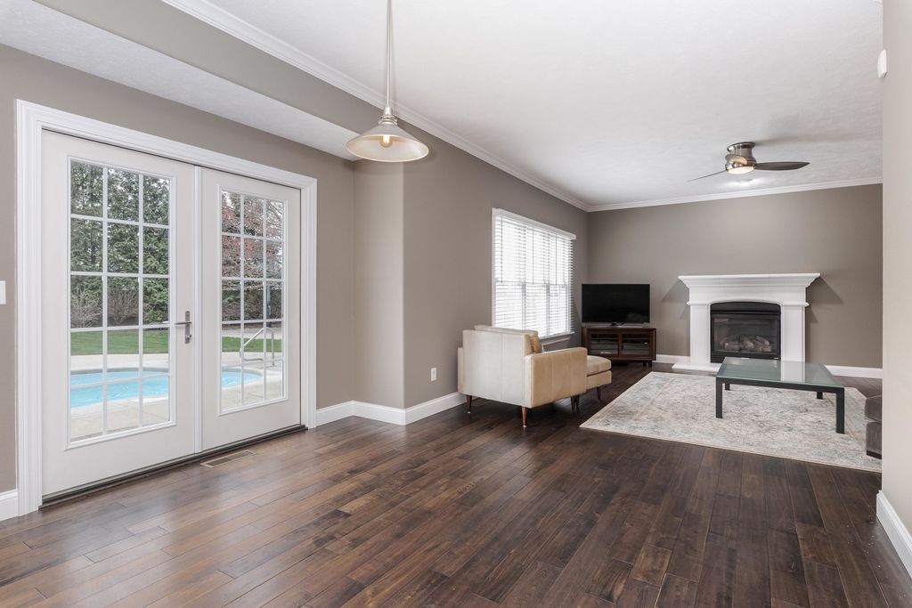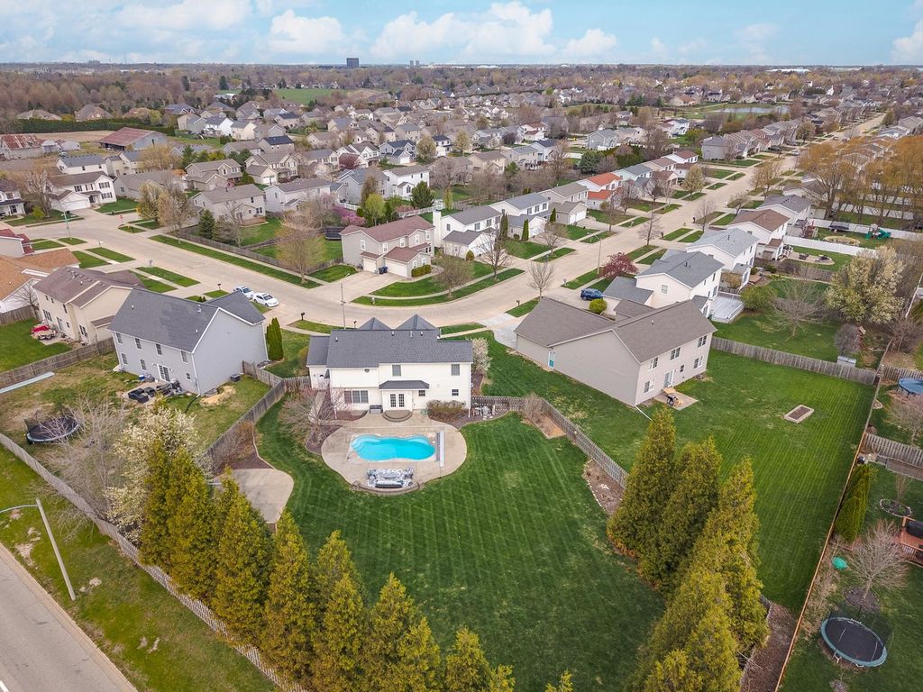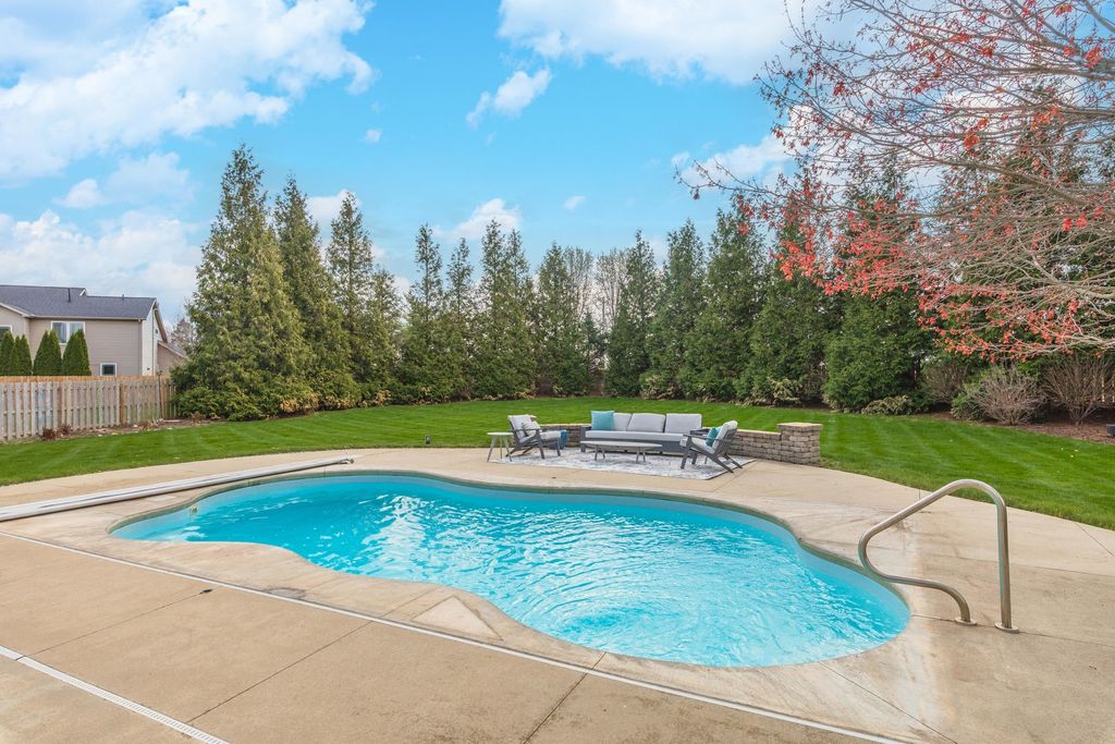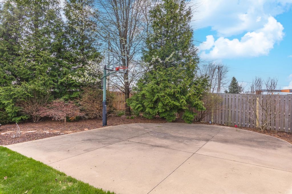 Enjoy living your best life! Stunning POOL home on a huge lot in Gaelic Place Subdivision. Showcase living and entertaining in the back yard with an inground pool! The patio and yard were professionally completed with a curved brick wall that overlooks the private fenced yard, basketball court and firepit. Tons of upgrades. Living room/flex room offers vaulted ceilings and hardwood floors. A recent custom gourmet kitchen features a fabulous 10' island that seats 8, hardwood floors, quartz countertops, stainless appliances, pantry, and dining area. The gas fireplace provides a focal point in the spacious family room. Upstairs: 4 bedrooms, 3 with custom closets and all with newer hardwood floors throughout the upper level. The primary bedroom features a vaulted ceiling, walk in closet, and a complete bath remodel in 2022, with a dual sink vanity, glass enclosed shower, and 2 person jetted bubble tub. The finished basement has an L-shaped family room, an egress window and a full bath, a flex room, plus a great storage room. The storage room has an adjacent mechanical room with built in shelves. New sump pump and backup sump pump with water detect notification feature in 2025, top of the line furnace/heat pump 2024, new tankless water heater 2022. Fenced yard with sprinkler system in front and back yard. New Bosch dishwasher in 2023. New patio doors in 2025. Custom stair handrails made from reclaimed wood in 2022, and newer carpet on stairs. 3 car garage with epoxy flooring. The projection TV with equipment and full screen remain. Pool is approximately 15'x28' with curved sides. All information believed to be accurate but should be verified by buyer.