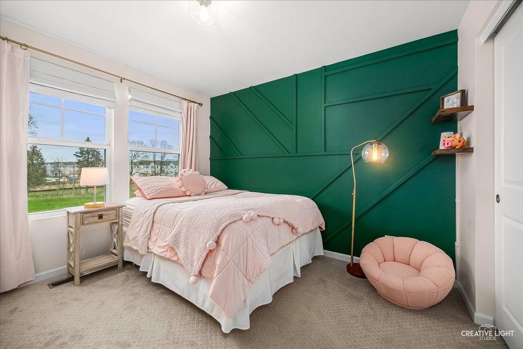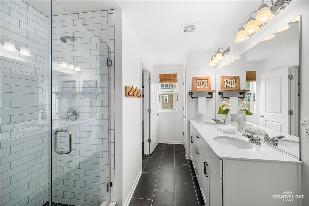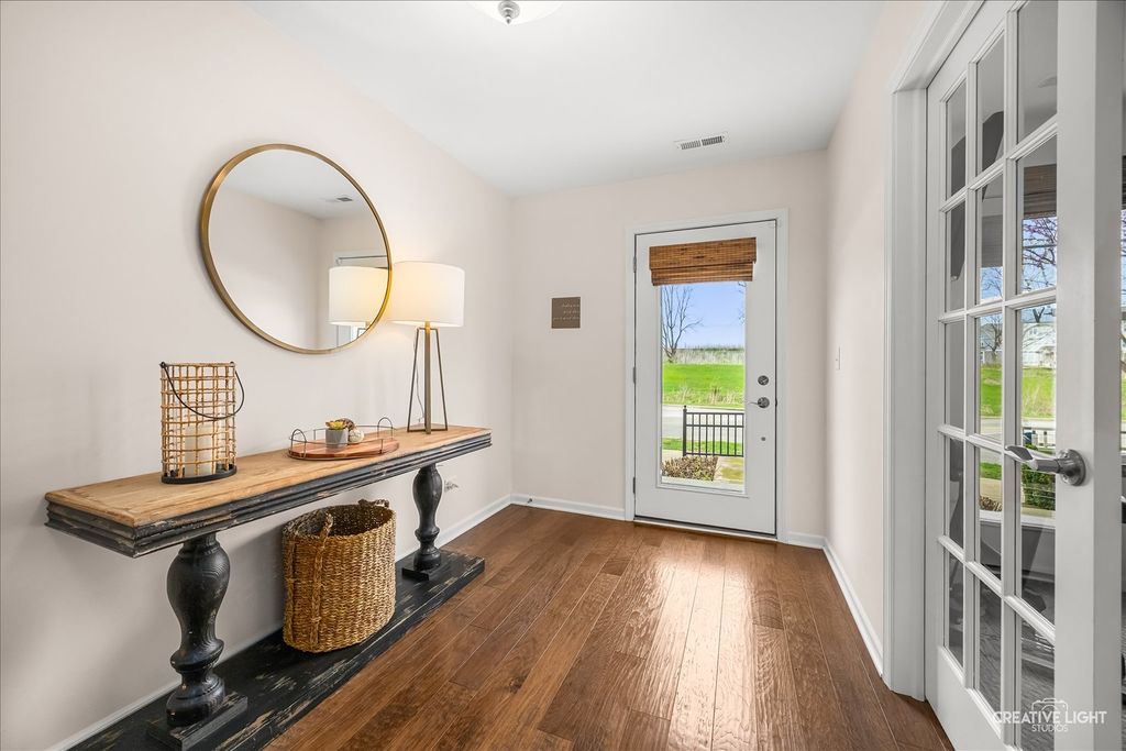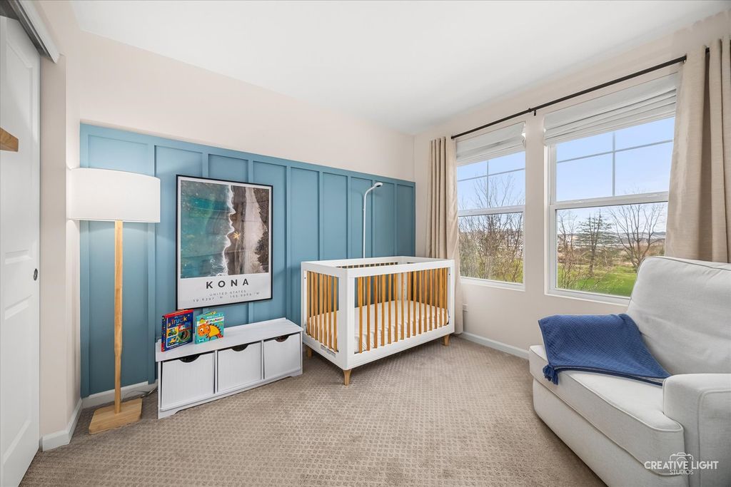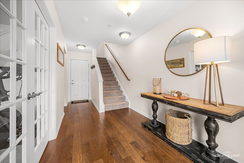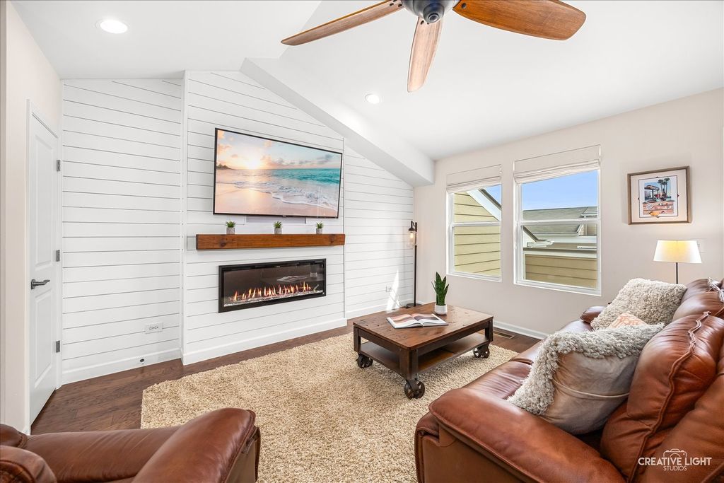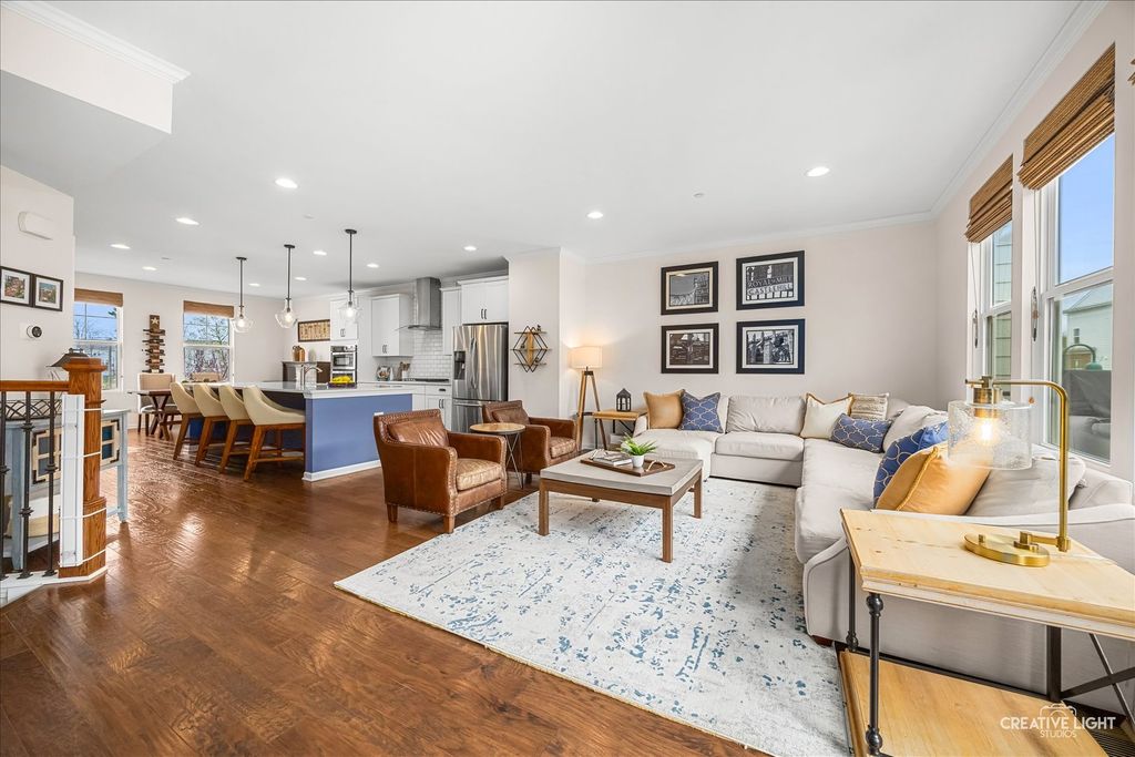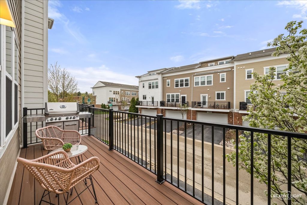 Welcome to the Uptown at Seven Bridges! This community is known for its vibrant lifestyle, where you can walk right out the front door and enjoy all the amenities and activities Seven Bridges has to offer. Stunning expanded model with a rare 4th-floor bonus room, fireplace, and private terrace! The welcoming front patio leads into the foyer featuring upgraded 5" hardwood flooring and French door entry to a bright, private first-floor office with abundant windows and blinds. The second level showcases an open-concept layout with hardwood flooring, extensive crown moulding and recessed lighting throughout. The sun-filled family room offers access to a private balcony, while the chef's kitchen impresses with abundant white cabinetry, stainless steel appliances, upgraded sink, gleaming quartz countertops, subway tile backsplash, a massive island with breakfast bar and custom pendant lighting, plus a spacious dining area. Upstairs on the third level, you'll find convenient laundry and three generously sized bedrooms, including a luxurious primary suite with a custom closet and private bath featuring a dual-sink vanity and oversized glass shower. The fourth-floor retreat is a true showstopper-your own private sanctuary with vaulted ceilings, hardwood flooring, and a cozy fireplace, plus access to the terrace. Attached garage with workbench. Ideally located near dining, shopping, entertainment, golf, commuter train, and expressways- this is one you don't want to miss!