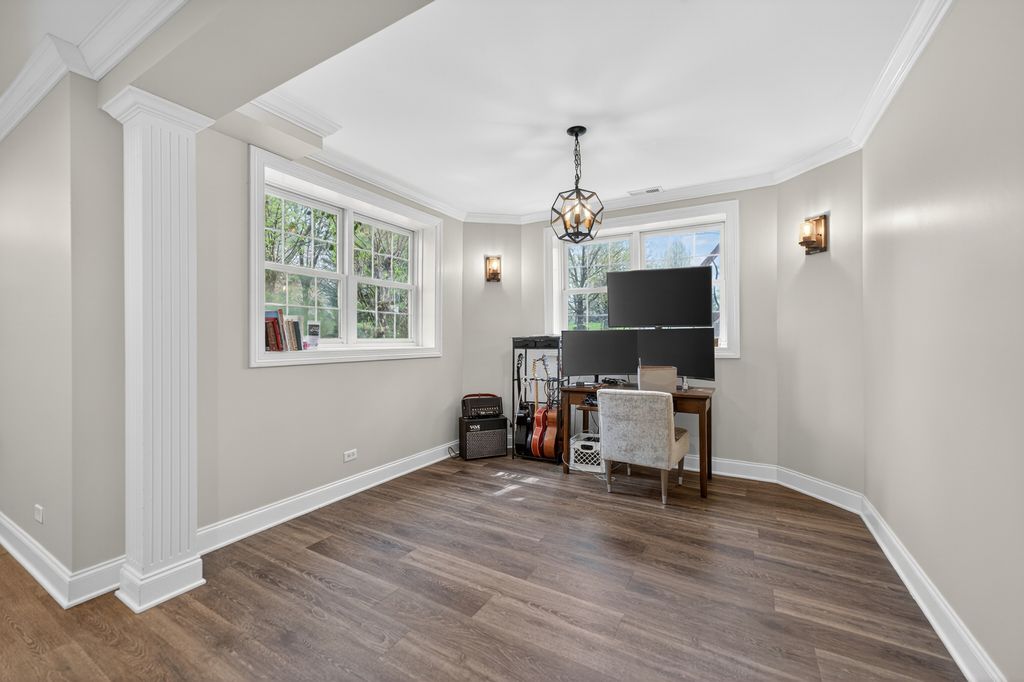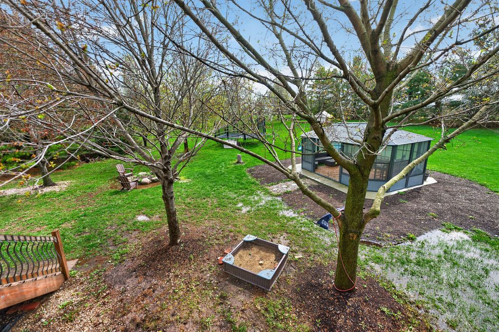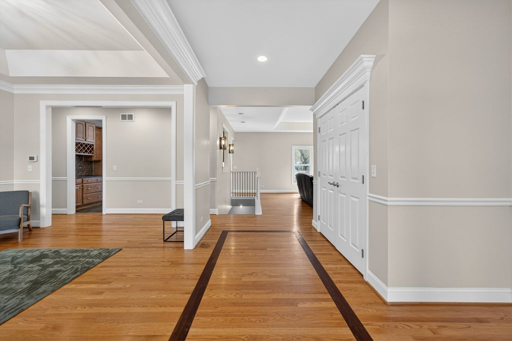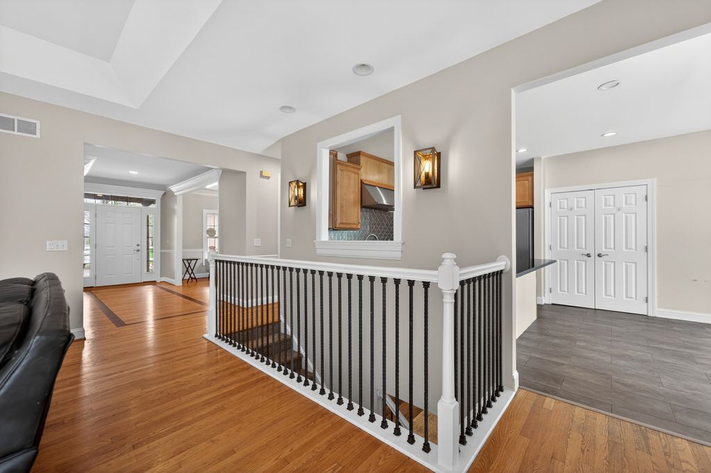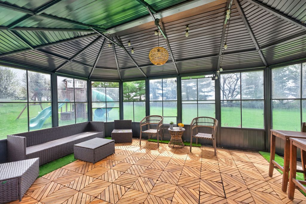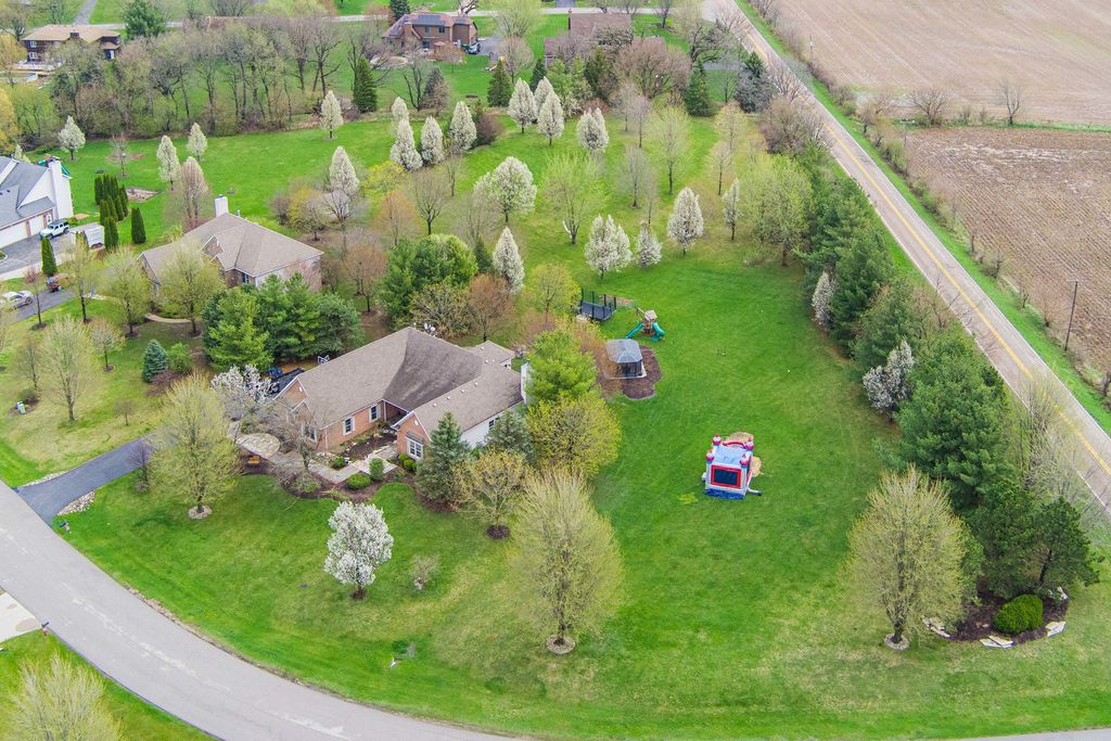 Step into luxury with this exceptional custom home, beautifully refreshed with new, updated lighting throughout and loaded with standout features at every turn. A charming slate walkway and inviting covered front porch set the tone for what awaits inside over 4,900 sq ft of thoughtfully designed living space nestled on more than 1.5 acres on a premium corner lot in Hampshire Point, complete with a picturesque gazebo perfect for cozy s'mores nights under the stars all with no HOA restrictions. Designed for both comfort and functionality, this home features a 3 car extra-wide garage, offering ample space for vehicles, storage, and hobbies. With 5 spacious bedrooms and 3.5 baths, this home blends elegance and comfort effortlessly. Rich hardwood flooring with cherry inlay, intricate crown molding, and classic chair rail detailing create a timeless, upscale feel. The heart of the home is a true showstopper an expansive gourmet kitchen designed for both everyday living and entertaining. Featuring a Dacor commercial-grade 6-burner cooktop, double convection ovens, and a direct-vent range hood, plus maple cabinetry, granite countertops, a wine rack, butler's station, and a stylish backsplash this space has it all. The sun-filled eating area showcases breathtaking, panoramic views and opens to a maintenance-free Trex deck with elegant iron accents perfect for relaxing or hosting under the stars. The living room impresses with a dramatic 10-foot tray ceiling, oversized windows that flood the space with natural light, and a cozy wood-burning/gas starter brick fireplace. Retreat to the luxurious primary suite featuring a soaring 10-foot ceiling with detailed molding, two walk-in closets, and a spa-like ensuite bath designed for ultimate comfort. A convenient Jack and Jill bathroom connects the second and third bedrooms. The fully finished lookout basement expands your living space even further and is highlighted by two additional large bedrooms, making it ideal for guests or extended living arrangements. This level also includes a versatile area perfect for a home office, gym, or playroom, a bright and inviting family room, and a full bathroom complete with a large walk-in shower. Recent updates include new basement flooring, new carpet, dishwasher, refrigerator, tankless water heater, and water softener. Perfectly located near parks, top-rated schools, and easy access to I-90, this incredible home truly has it all space, style, updates, NO HOA, and an unbeatable serene setting. Make it yours!