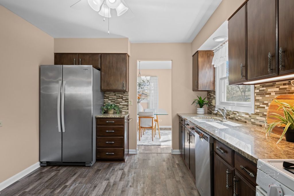 Tucked away on a quiet cul-de-sac in the sought-after Winston Hills subdivision, this charming ranch-style home offers the ease of one-level living with a warm, welcoming feel from the moment you enter the grand foyer (12x10). Thoughtfully updated and freshly painted, it's truly move-in ready-perfect for first-time buyers looking to plant roots or those ready to simplify and enjoy a more manageable lifestyle. Step inside to a spacious L-shaped living room that flows effortlessly into the dining area, creating an open and inviting space ideal for both everyday living and entertaining. Natural light pours in, and the newer sliding glass door leads you out to a private patio and a generous fenced yard-perfect for morning coffee, pets, gardening, and/or summer gatherings. The kitchen is both stylish and functional, featuring stainless steel appliances, granite countertops, and a conveniently tucked-away laundry closet with full-size, side-by-side washer and dryer-making daily living easy and efficient. Just beyond, the cozy family room invites you to unwind by the wood-burning fireplace, creating the perfect space to relax at the end of the day. The primary bedroom offers its own private retreat with an updated ensuite bathroom featuring a tiled shower with sliding glass door and single vanity. The second bathroom is equally well-appointed with a tub/shower combination and a granite-topped vanity. Set on a spacious, fenced yard with room to enjoy the outdoors, this home also features a 2-car attached garage and minimal steps, offering a true single-level convenience. All of this in a peaceful neighborhood setting, close to everything you need and located within the highly regarded North High School district.