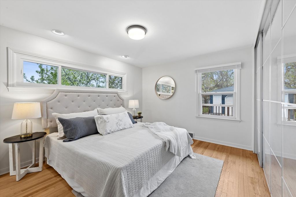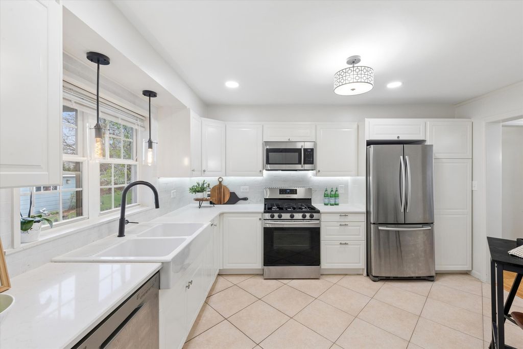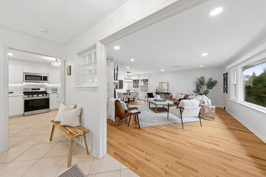 Located in the sought-after Field Grade School and Sandburg Middle School districts, this move-in ready ranch offers true walk-to-everything living-just steps to town, train, restaurants, shops, parks, and more-all on a quiet, family-friendly street. Set on a deep 165' lot, this home features 2,610 sq ft of living space (1,369 sq ft on the main level) and an inviting front porch that welcomes you inside. The main level offers a bright living room with a stone wood-burning fireplace that flows seamlessly into the dining area. The updated white kitchen features custom cabinetry, quartz countertops, backsplash, and stainless steel appliances. The primary bedroom includes a private full bath, with two additional spacious bedrooms and a second full bathroom on the main level. The finished lower level provides excellent additional living space with a large family room featuring a second wood-burning fireplace, plus an oversized laundry and storage area with potential for a future office, playroom, or additional bedroom. Enjoy the outdoors with an entertainer's deck, fully fenced yard, and a Tuscan-inspired pergola with vine-covered seating area. Shed offers great storage or playhouse potential. 2.5+ car garage. Recent updates include newer roof, kitchen, furnace, and bathrooms. Incredible in-town location with everything right outside your door.