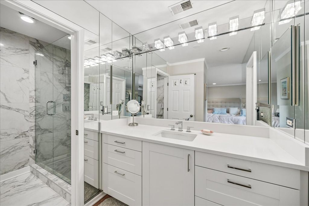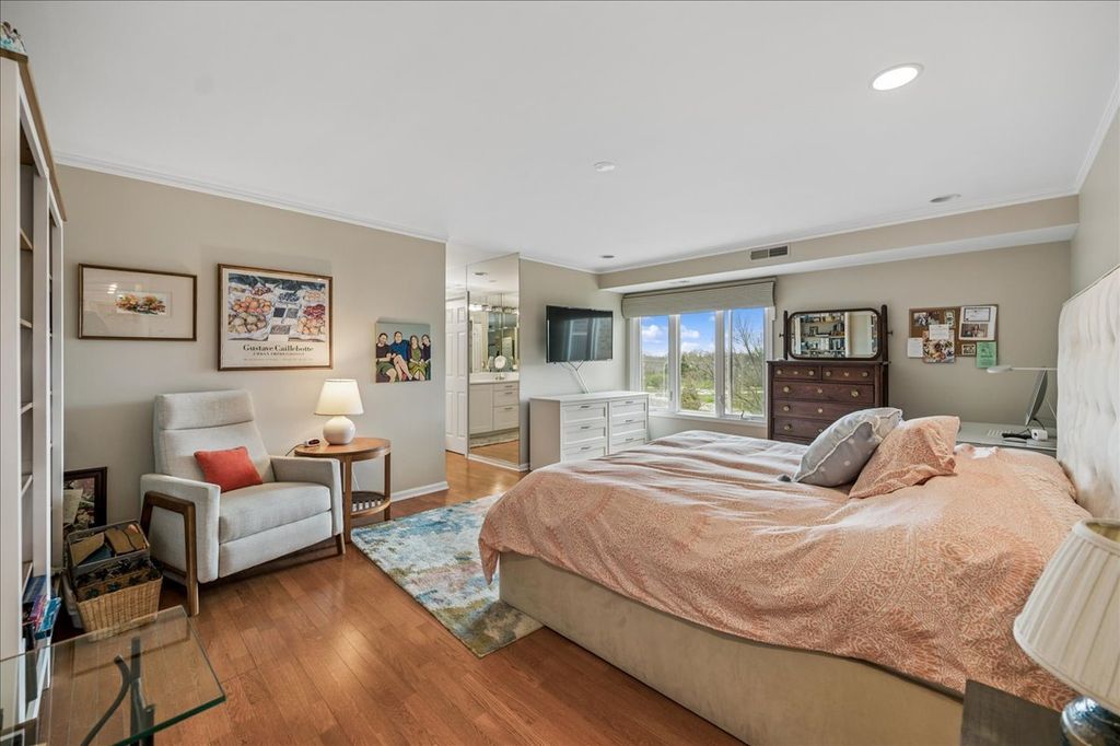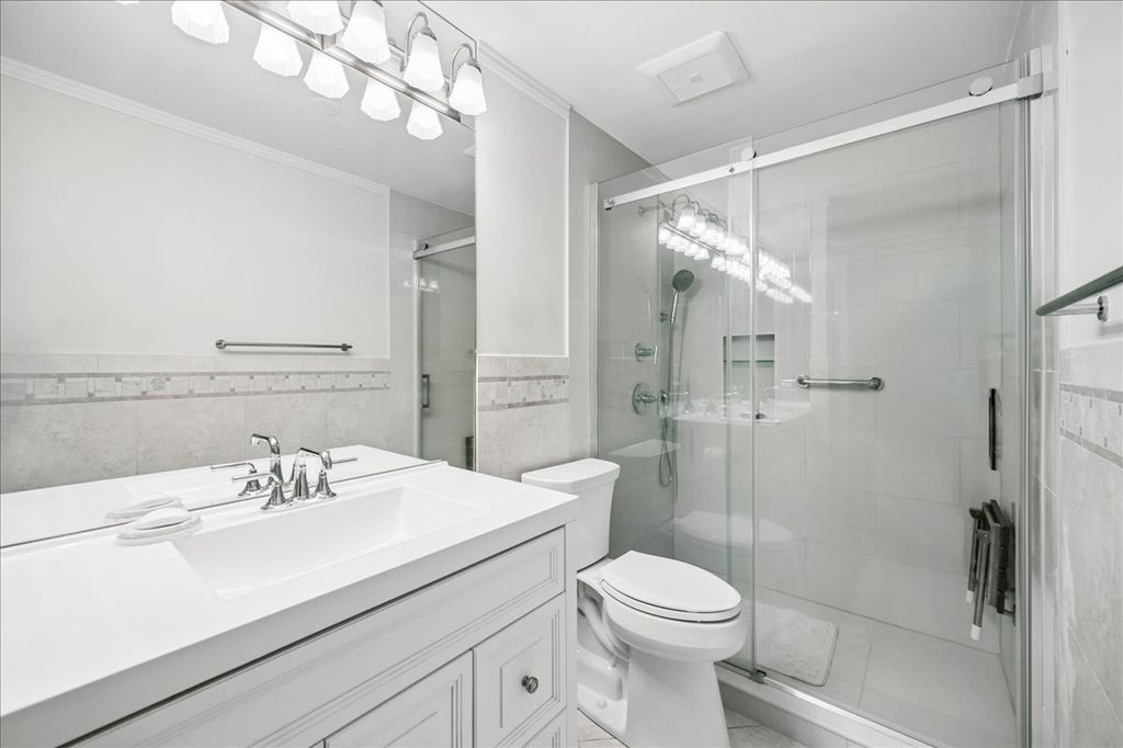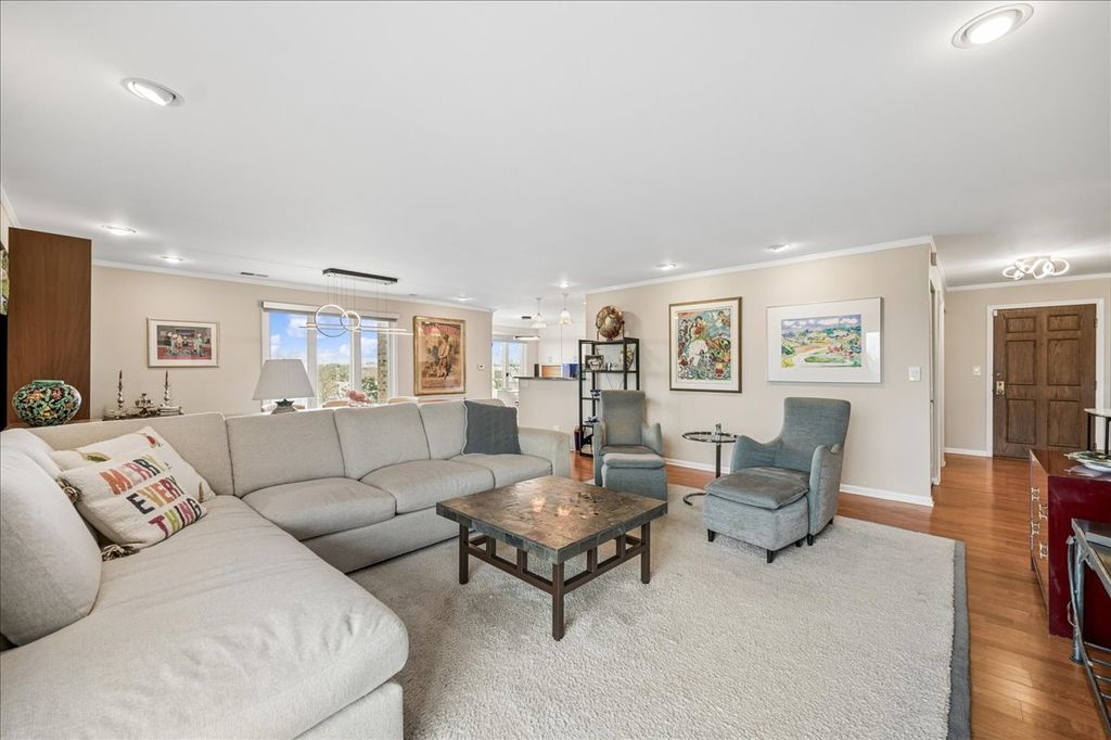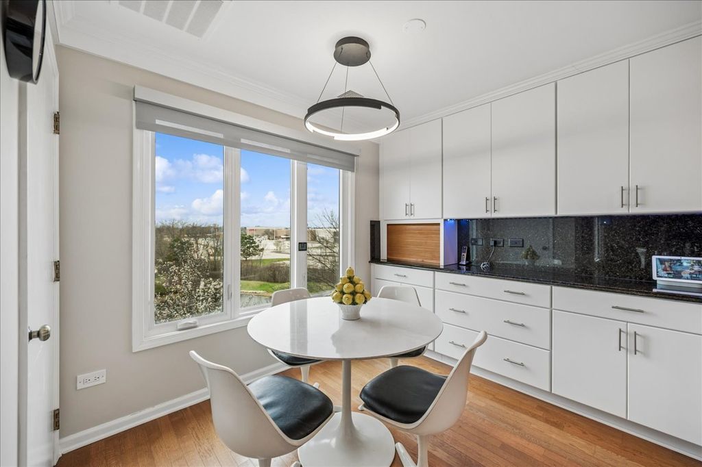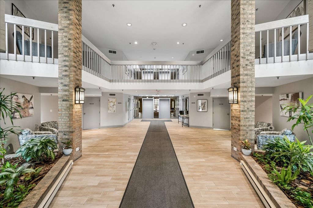 Highly sought-after, fully renovated corner residence offering refined finishes and abundant natural light throughout. This meticulously maintained home features a gracious foyer that opens to an expansive living and dining area, highlighted by newer floor-to-ceiling windows and sliding glass doors (2020) leading to a private balcony. This refreshed eat-in kitchen is designed for both style and function, showcasing white cabinetry with updated hardware, granite countertops, and newer stainless steel appliances (2021), along with extended cabinetry for exceptional storage and workspace. Beautiful wood floors and crown molding run throughout the home, complemented by new designer light fixtures and custom electric shades. Both the hall and primary bathrooms have been exquisitely renovated, with the primary suite featuring a spa-like bath, heated floors and a walk-in shower. Generously proportioned bedrooms offer outstanding closet space, including a spacious walk-in closet in the primary suite. Additional highlights include in-unit laundry, abundant storage with a private locker, and two heated garage spaces. Set within a well-maintained community in a premier location, with outdoor pool, exercise room and security, this sophisticated, sun-filled residence offers effortless, move-in ready living.