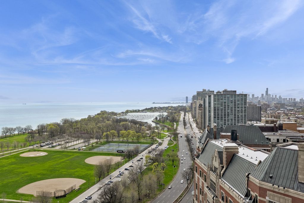 Breathtaking million-dollar south views of the lake, the drive and the city from this spacious lake front stunner. Worry-free with these recent upgrades: GE AC - 2023 bedroom / 2024 living space, 2024 Samsung Refrigerator with beverage center, 2023 Bathroom gut-remodel, 2025 Bosch 500 series dishwasher, & 2026 paint throughout. The open floor plan with real hardwood flooring is great for entertaining and has a dedicated space to easily accommodate a separate dining table. If dining is more casual there's always the breakfast bar with ample seating. The kitchen features a large island with granite countertops and custom backsplash. Working from home has never been easier as there's a built-in home office! Storage abounds throughout this unit and there's an included storage locker in the building. Amenities include a beautiful rooftop solarium & deck with panoramic views & shared grills. The building is well managed (on-site) including 24-hr door staff, on-site maintenance, 2024 laundry room, receiving room, and updated Luxor package room. The location is perfect with the lake front right outside your front door! Express bus whisks you downtown in no time. Easy access to nearby coffee shops, restaurants and grocery stores. Building allows cats and ESA-registered dogs. No planned special assessments with $7.5 investments & cash reserves, 2013 roof.
