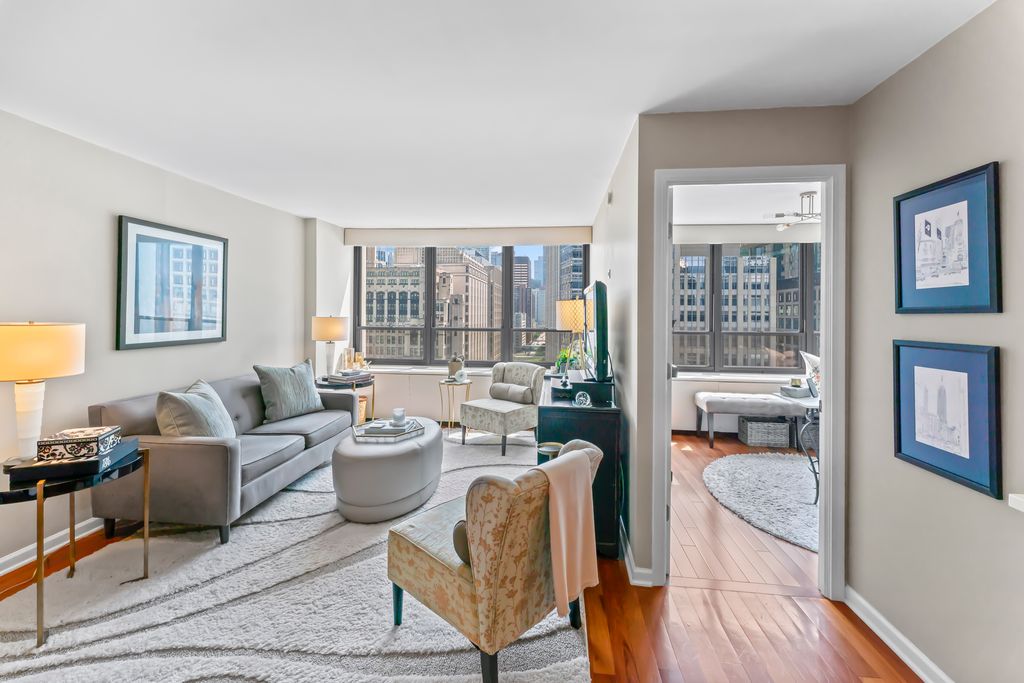 Sun-drenched and beautifully updated, this spacious Streeterville condo offers the perfect combination of modern finishes, functional layout, and stunning city views. Situated on a high floor, the home is filled with natural light through a wall of oversized windows showcasing iconic vistas. The open-concept living and dining area features rich hardwood flooring and a seamless flow, ideal for both everyday living and entertaining. The thoughtfully-designed kitchen has been fully updated with crisp white shaker cabinetry, quartz countertops, stainless steel appliances, a subway tile backsplash, and a large peninsula with seating. The generously-sized primary bedroom easily accommodates a king bed and offers excellent closet space, while the second bedroom functions perfectly as a guest room, home office, or flex space. The bathroom is finished with natural stone tile and a glass-enclosed walk-in shower for a clean, spa-like feel. Additional highlights include in-unit laundry, ample storage, and the valuable right to garage parking, adding convenience and flexibility. Full-amenity building with 24-hour door staff, fitness center, and on-site management. Unbeatable location just steps to the lakefront, Michigan Avenue, Northwestern, parks, dining, and shopping. Welcome to your new home!