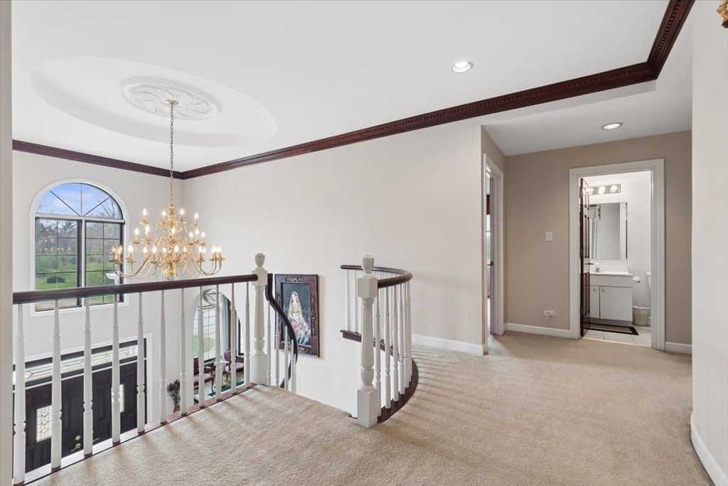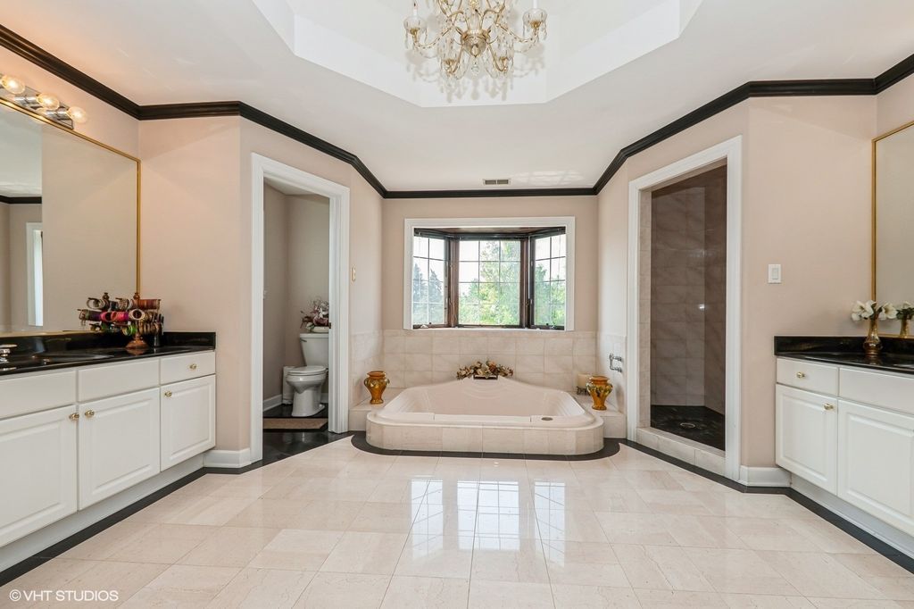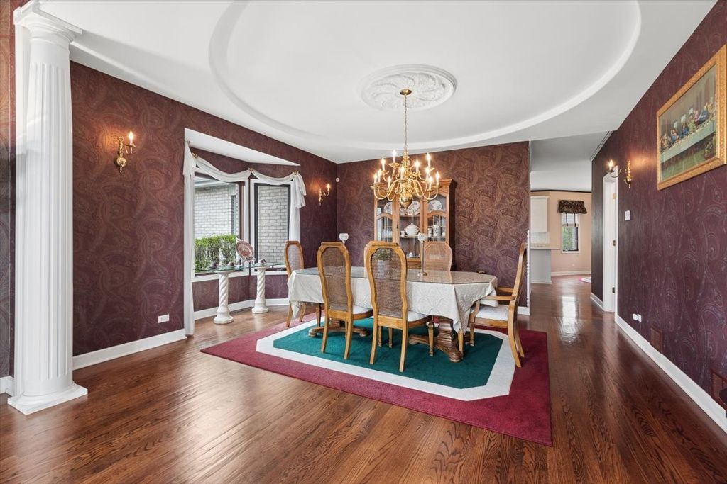 Stunning 5 bed, 5.5 bath home Set on a private drive, this brick home sits on a spacious, tree-lined almost 1/2 acre lot with a calm, tucked-away feel. Over 6000 sq ft of living space with soaring ceilings, marble foyer, and timeless finishes throughout. This well-maintained, all-brick property offers a spacious layout designed for everyday living and entertaining. The main level features separate living and dining rooms, a massive family room with custom cherry wood-beamed ceiling, an updated kitchen (2017) with stainless steel appliances, large eating area, and pantry, plus a bright sunroom with hot tub. Updates include new roof and gutters (2023) and dual HVAC systems (2020). A full bedroom with en-suite bath is also on the main floor. Upstairs includes four large bedrooms and three full baths. Two with en-suites-including a spacious primary suite with tray ceilings, two walk-in closets, whirlpool tub, dual vanities, and separate shower. The finished basement includes a full bar, kitchenette, recreation area with pool table, gym, full bath, ample storage, and access to the garage and backyard. Exterior features include a private deck, professionally landscaped yard, sprinkler system, brick paver driveway, and a 4-car garage with storage space. The home backs up to a private, wooded area with plenty of outdoor space. Located in Orland Park School District and D230 High School.