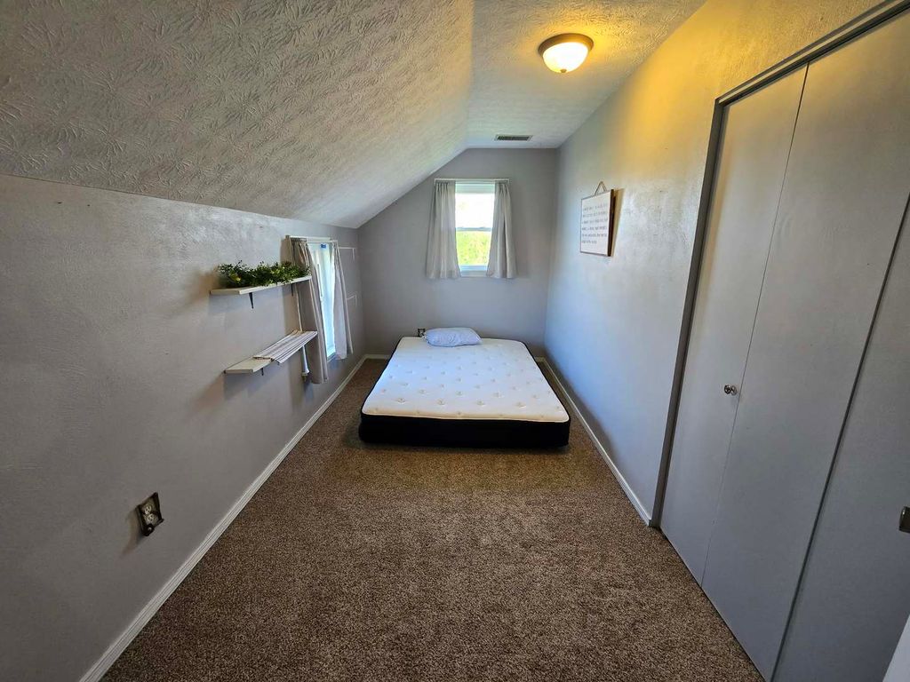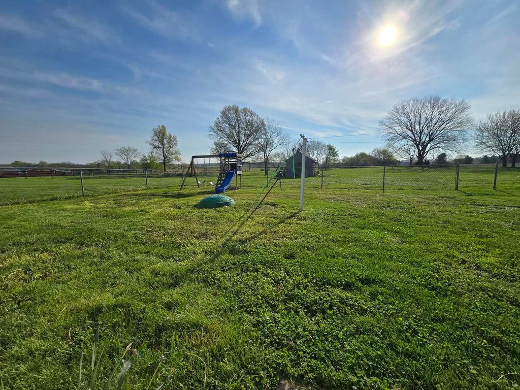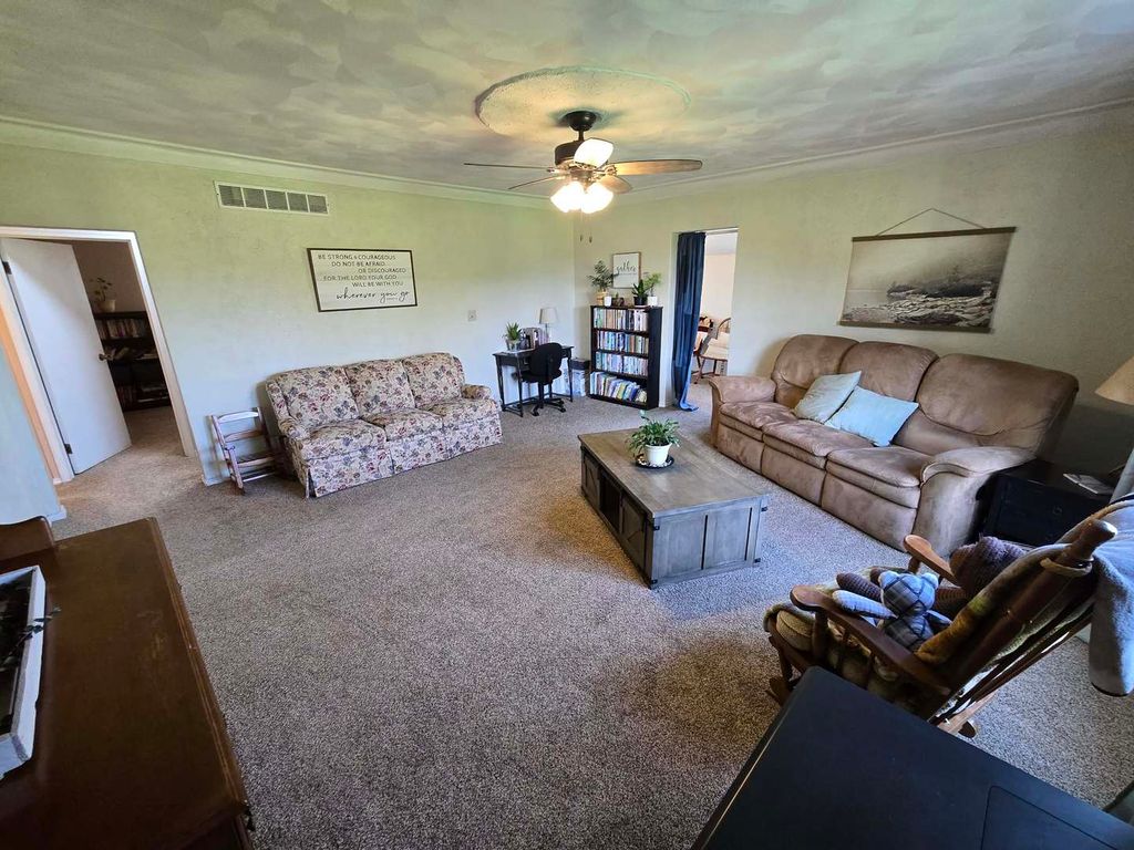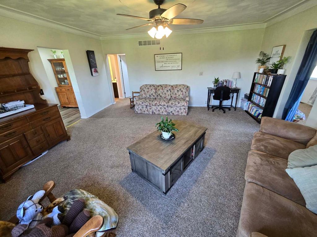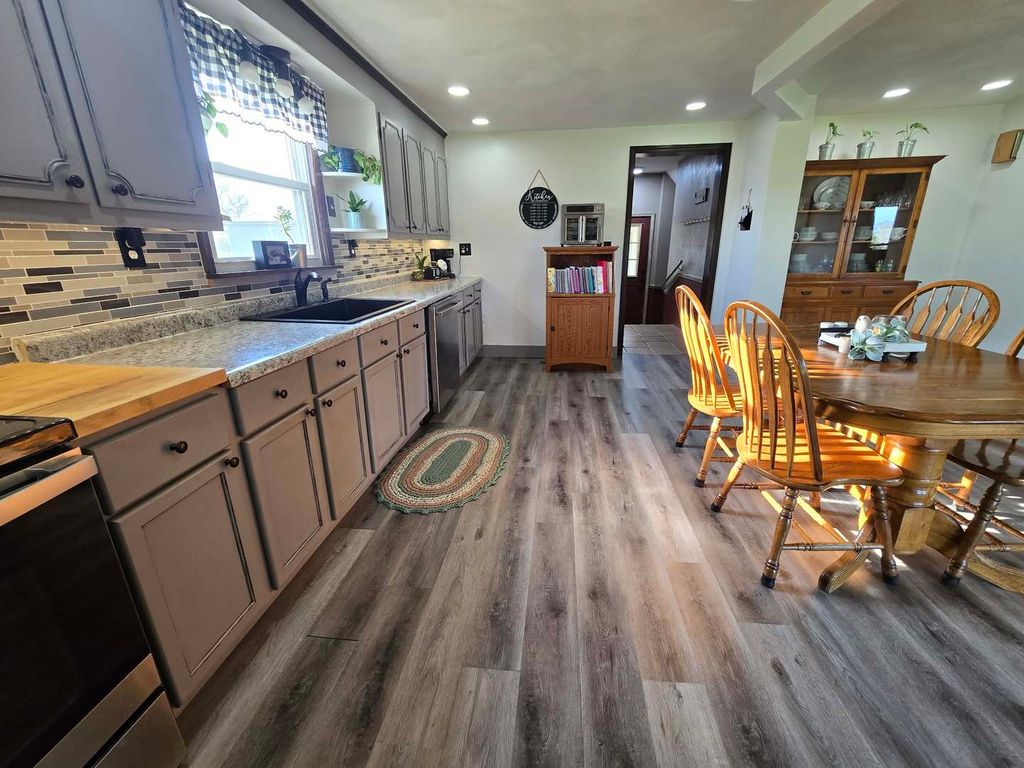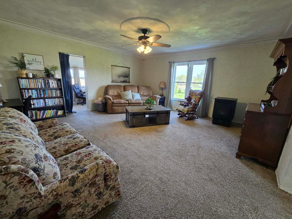 Charming stucco country home situated on 4.3 acres just outside Dix, offering peaceful rural living with beautiful views of surrounding fields and woods. This inviting home has seen several recent updates, including a central A/C system (5 years old), metal roof (4 years old), hot water heater (just 2 months old), and vinyl replacement windows. Inside, the main level features a spacious living room along with a versatile bonus room currently used as a bedroom and playroom. The large kitchen and dining area is perfect for gathering, complete with updated countertops, backsplash, and upper cabinets (4 years old), and French doors leading out to a side patio-ideal for enjoying the scenic surroundings. A pellet stove provides an additional, efficient heat source. Upstairs, you'll find two bedrooms, a full bath, a landing area, and a generously sized storage room that could serve multiple purposes. Additional highlights include a large laundry/mudroom, enclosed porch for extra storage, and a partial basement with spray foam insulation and natural exterior drainage-perfect for maintenance access and storage. Outside, the property truly shines with a fenced backyard area, circle drive, and a detached 16x28 pole barn/garage with two overhead doors. The 4.3 acres offer plenty of room for gardening, animals, entertaining, or simply enjoying the open space. A wonderful opportunity to own a move-in ready country property with modern updates and room to grow!