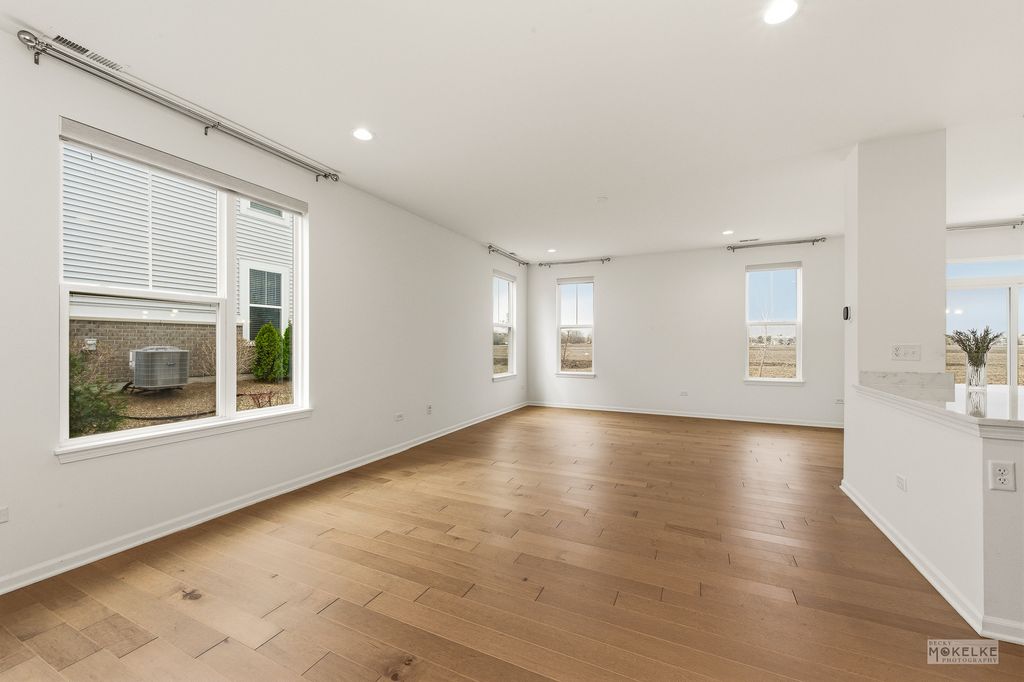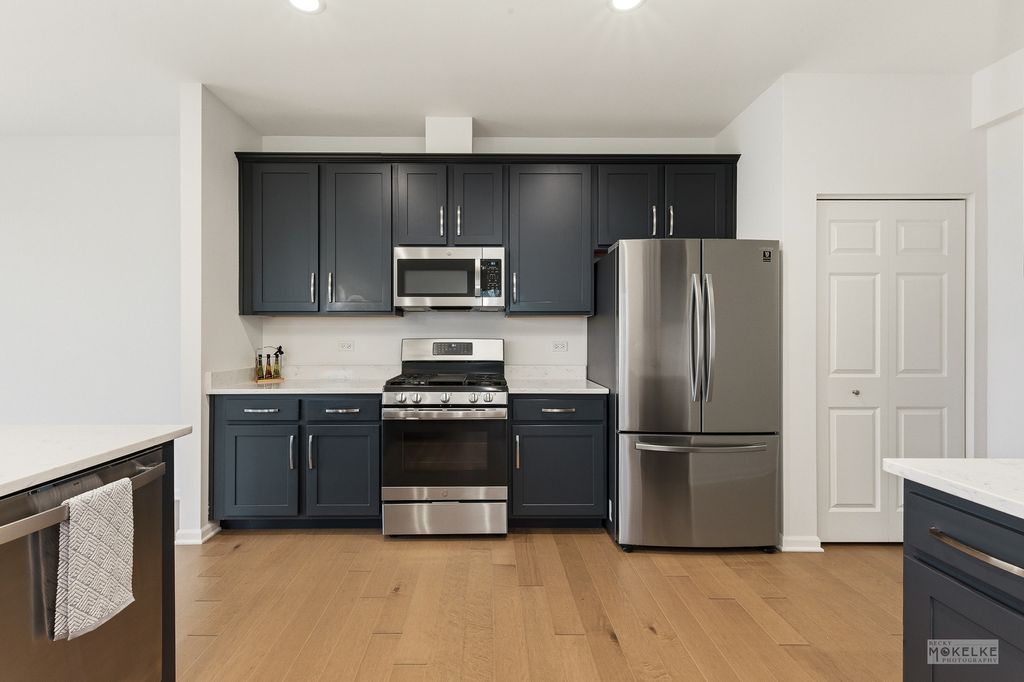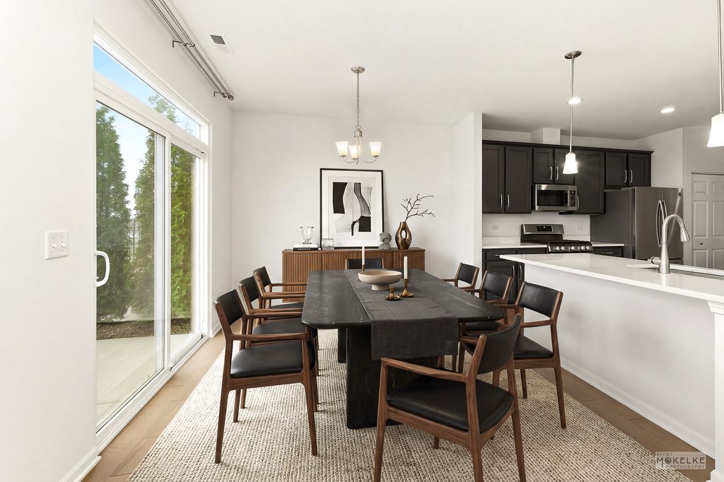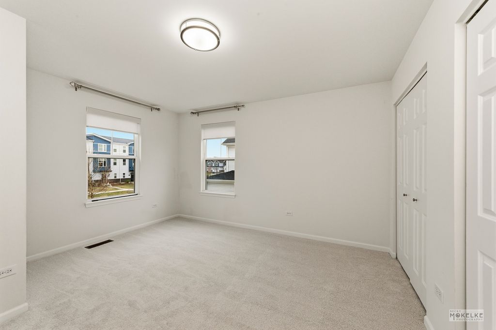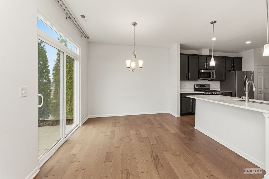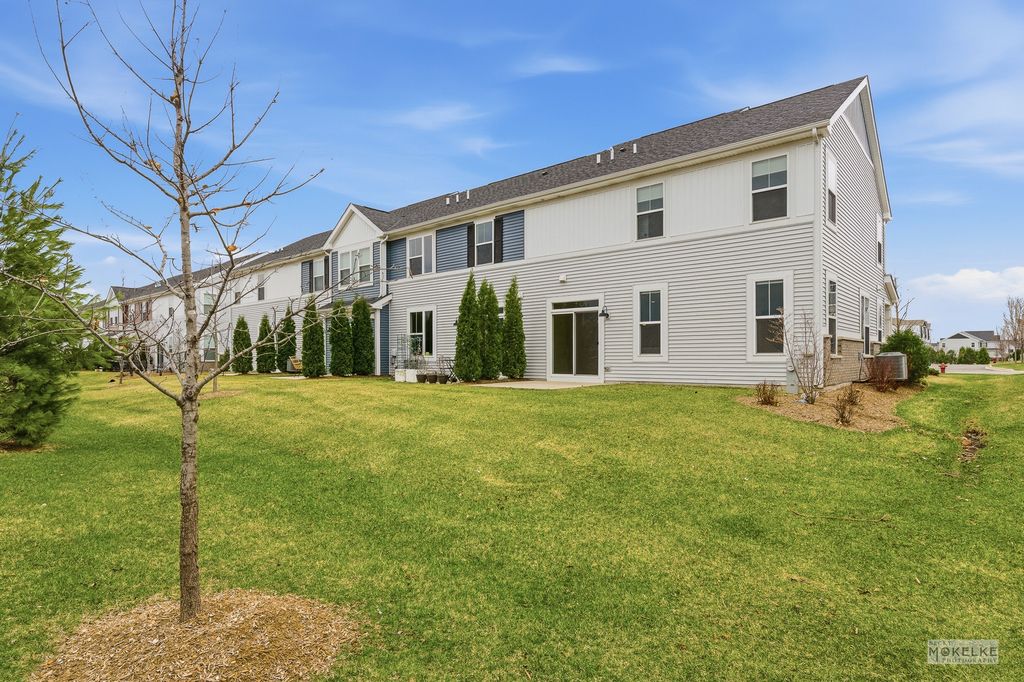Welcome home to this beautifully maintained end-unit townhouse, offering the perfect blend of space, style, and natural light in a highly sought-after community. With 2 bedrooms, 2.5 bathrooms, and a versatile layout, this home lives larger than expected. Step inside to a welcoming entryway that opens into a bright and airy main level, where oversized windows flood the space with natural light. The expansive family room flows seamlessly into the dining area-ideal for both everyday living and entertaining. From here, step out to your private concrete patio, perfect for relaxing or hosting guests. The kitchen is a standout, featuring rich navy cabinetry, sleek quartz countertops, stainless steel appliances, a pantry closet, and abundant storage-including an additional oversized closet. Engineered hardwood flooring throughout the main floor and custom blinds throughout the home add both style and functionality. Convenient access to the attached 2-car garage completes the main level. Upstairs, you'll find a massive loft space-perfect for a home office, second living area, or easily convertible into a third bedroom. The spacious primary suite is a true retreat with vaulted ceilings, a large walk-in closet, and a private en-suite bathroom complete with double sinks, a soaking tub, and a separate walk-in shower. A generously sized second bedroom with two large closets, a full hall bathroom, and a dedicated laundry room round out the upper level. Located in an amazing community close to shopping, dining, and within highly acclaimed District 204 schools, this home truly checks every box.