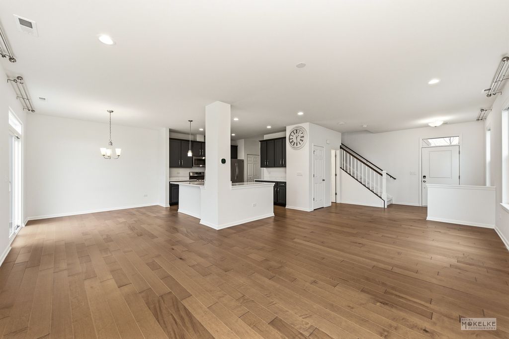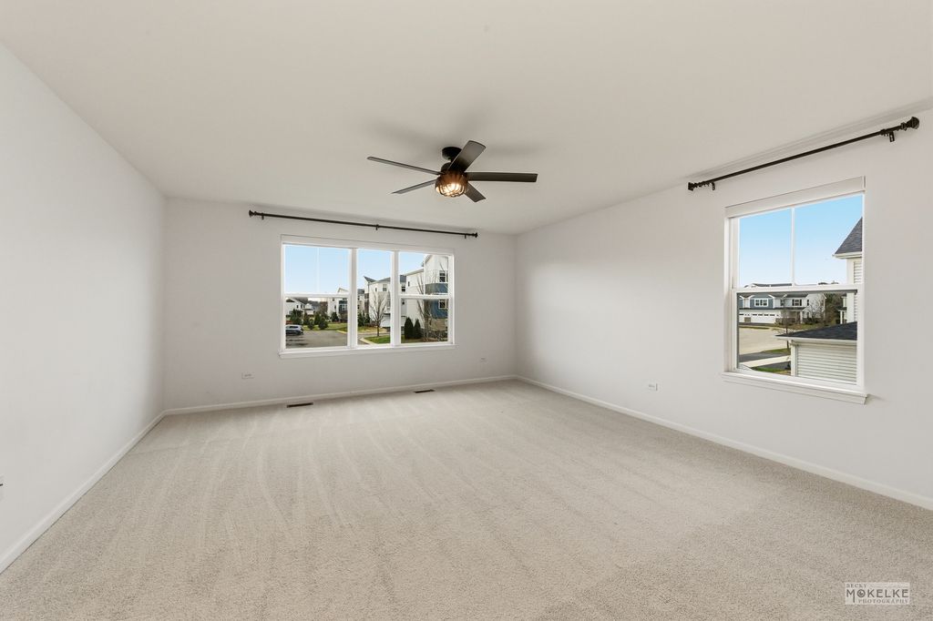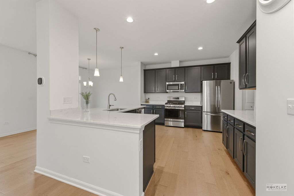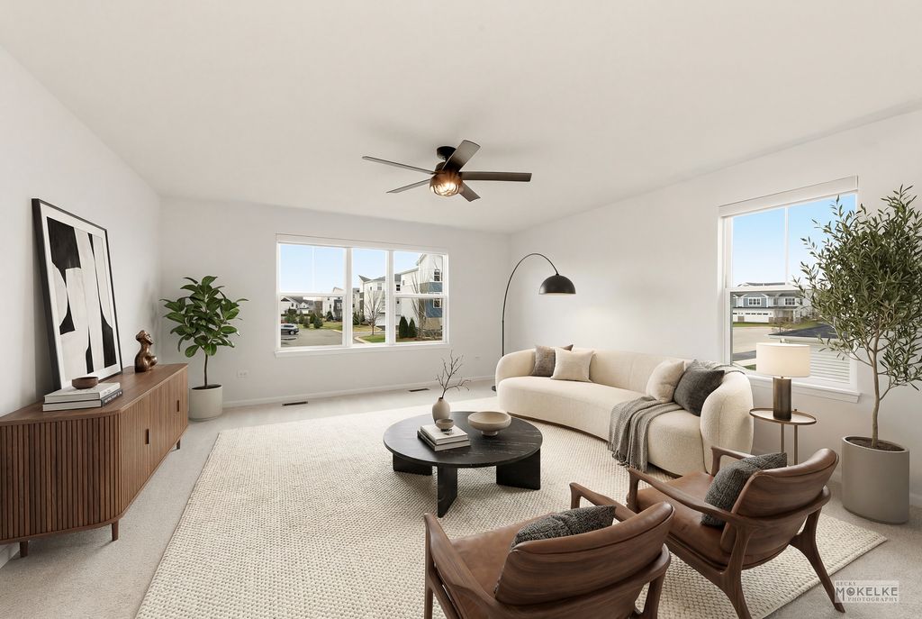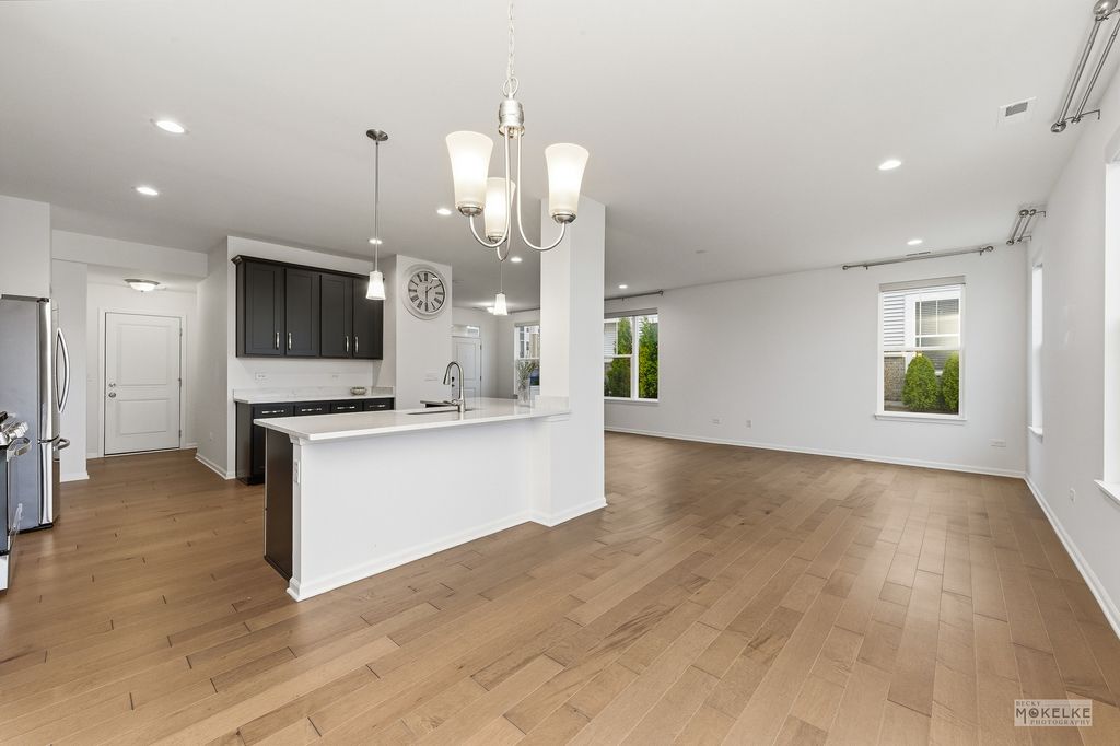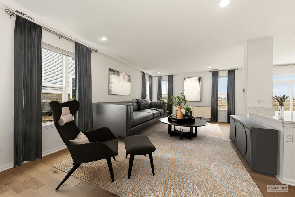 Welcome home to this beautifully maintained end-unit townhouse, offering the perfect blend of space, style, and natural light in a highly sought-after community. With 2 bedrooms, 2.5 bathrooms, and a versatile layout, this home lives larger than expected. Step inside to a welcoming entryway that opens into a bright and airy main level, where oversized windows flood the space with natural light. The expansive family room flows seamlessly into the dining area-ideal for both everyday living and entertaining. From here, step out to your private concrete patio, perfect for relaxing or hosting guests. The kitchen is a standout, featuring rich navy cabinetry, sleek quartz countertops, stainless steel appliances, a pantry closet, and abundant storage-including an additional oversized closet. Engineered hardwood flooring throughout the main floor and custom blinds throughout the home add both style and functionality. Convenient access to the attached 2-car garage completes the main level. Upstairs, you'll find a massive loft space-perfect for a home office, second living area, or easily convertible into a third bedroom. The spacious primary suite is a true retreat with vaulted ceilings, a large walk-in closet, and a private en-suite bathroom complete with double sinks, a soaking tub, and a separate walk-in shower. A generously sized second bedroom with two large closets, a full hall bathroom, and a dedicated laundry room round out the upper level. Located in an amazing community close to shopping, dining, and within highly acclaimed District 204 schools, this home truly checks every box.