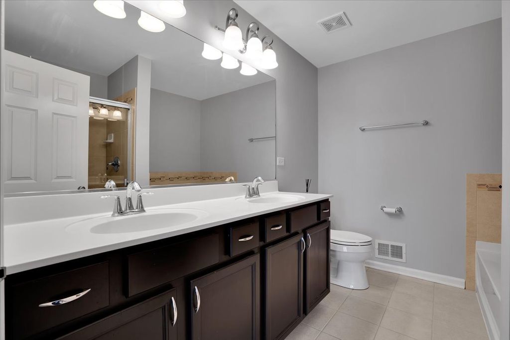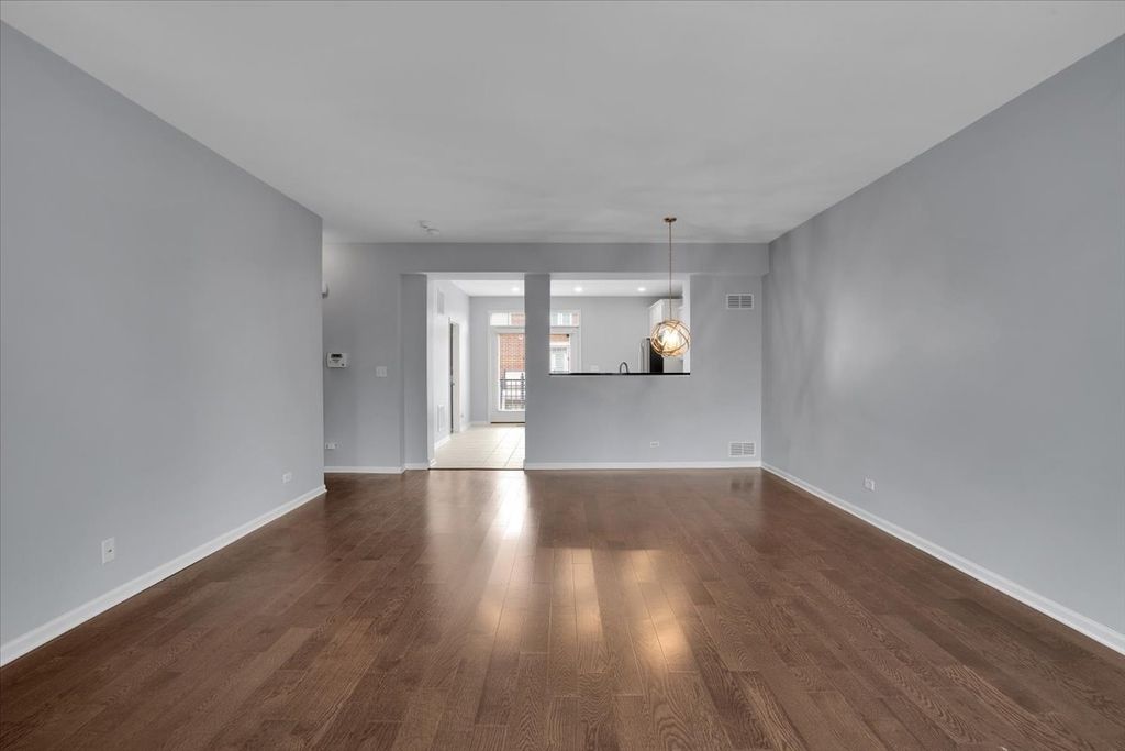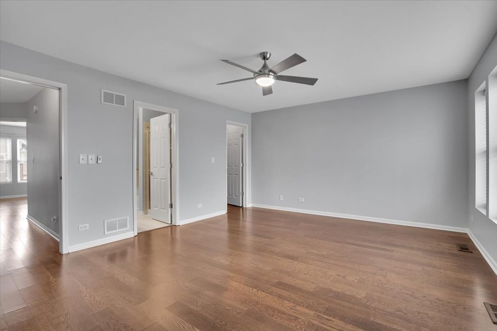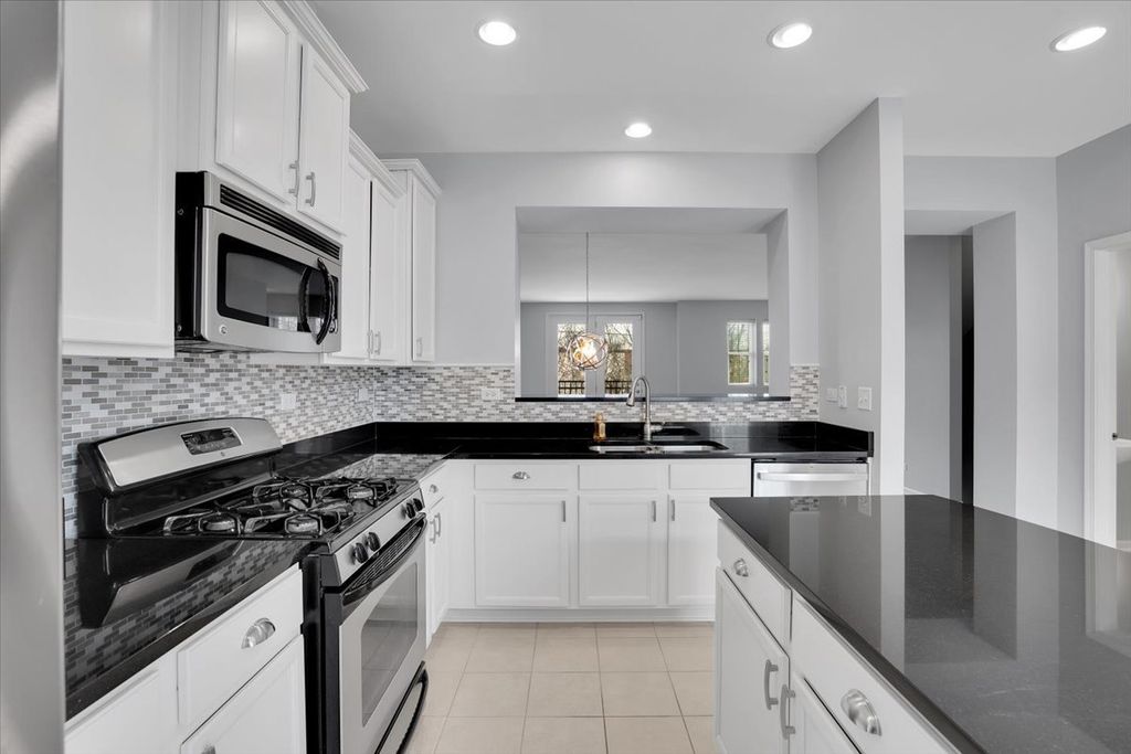 Elegant, sun-filled 3-story townhome in sought-after Arlington Reserve. This private interior residence features two spacious primary en-suite bedrooms and a thoughtfully designed open floor plan ideal for modern living. The kitchen showcases granite countertops, white cabinetry with crown molding, stainless steel appliances, a breakfast bar, and pantry. A transom French door opens to an oversized balcony-perfect for refined indoor-outdoor entertaining. Additional highlights include soaking tub, separated shower, a finished lower-level living space with half bath ideal for a home office or lounge, engineered hardwood flooring throughout, 9' ceilings, and fresh designer-neutral paint. Complete with a 2-car attached garage and exceptional storage. Ideally located near upscale dining, shopping, Busse Woods Forest Preserve, and minutes to I-90.