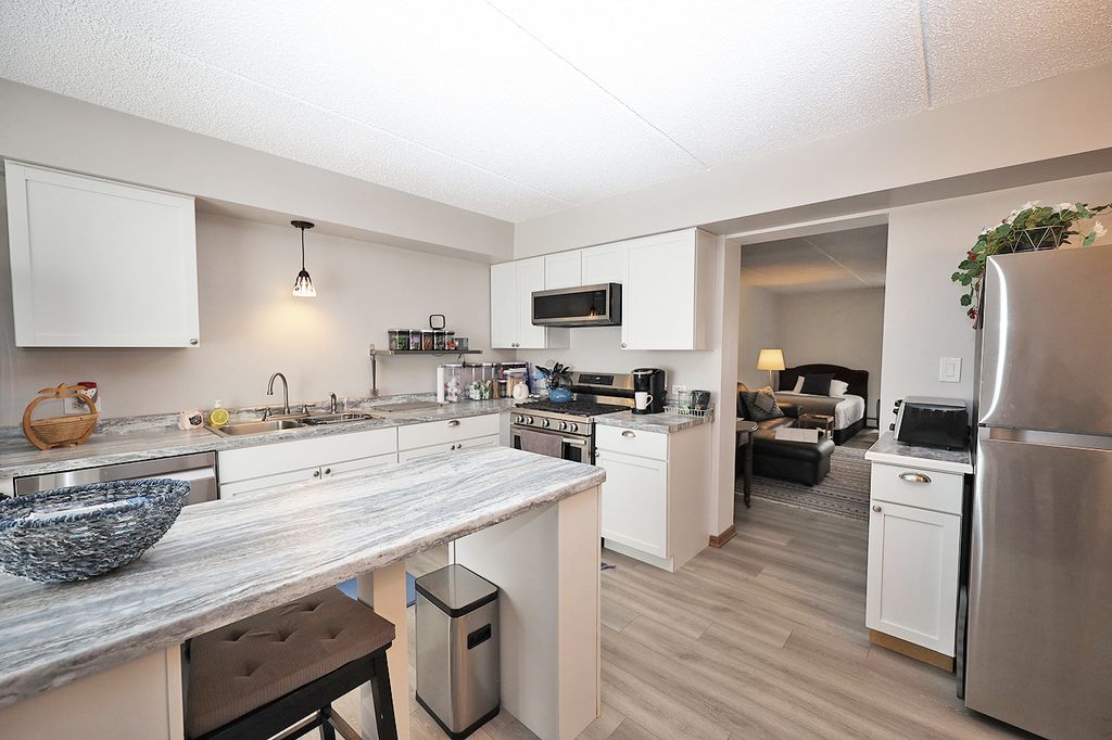 Totally Updated! Not just the perfect living place, but also a great investment! as this Move in Ready 2nd floor home has been fully Remodeled for you! It's a Super sharp one-bedroom condo located near the downtown area and one block to the train station! Gorgeous vinyl plank flooring throughout. The Kitchen was remodeled with white cabinets, and an island, and all NEW appliances. There's space for an eating table! The Remodeled bathroom has new tile flooring. Large master bedroom and super spacious living room. Baseboard is radiant heat and included in your low HOA fee. One car garage included and 1 reserved parking space, as well as storage locker! Balcony overlooks the courtyard and is the perfect place for relaxing or morning coffee. All utilities are included in the HOA except for electric, which makes this a great affordable place. As well as very reasonable property taxes. No homeowner exemption currently, so your taxes could be even lower! Downtown activities include concerts, auto shows, park, library, restaurants, sports bars, shopping, yoga, Starbucks etc.