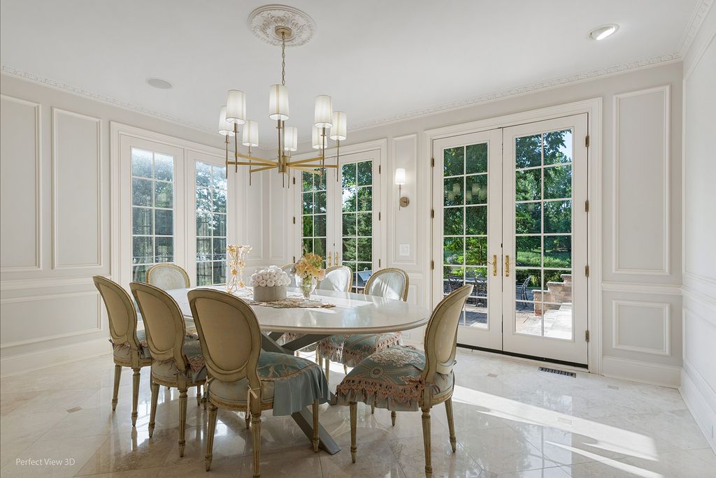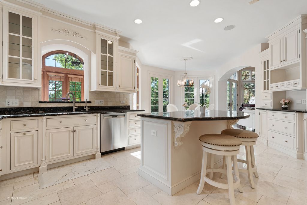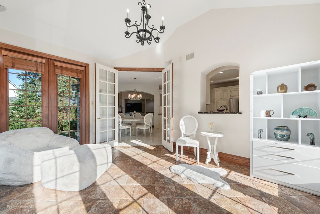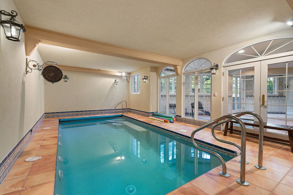 Secluded on a quiet cul-de-sac in the prestigious Thorngate subdivision, this French Provincial residence was custom built by the renowned Orren Pickell Building Group. Combining timeless architecture, refined finishes, and exceptional indoor-outdoor living, it offers a truly elevated lifestyle in one of the area's most sought-after neighborhoods. The grand two-story foyer, highlighted by a sweeping curved staircase, sets an elegant tone upon entry. A sunlit living room features soaring vaulted ceilings and a limestone fireplace, while the formal dining room opens through French doors to a spacious stone patio overlooking a tranquil pond. Perfect for entertaining, the patio is equipped with gas and charcoal grills, a fire pit, refrigerator, and ample space for outdoor dining and relaxation. The chef's kitchen was tastefully updated in 2021 and flows seamlessly into the family room, which is filled with natural light from its east, south, and west exposures. A private library, complete with floor-to-ceiling built-ins and a fireplace, offers an ideal work-from-home retreat. Upstairs, the primary suite is a serene escape, featuring a spa-inspired bath with jacuzzi, walk-in shower, built-in vanity, and a newly renovated dressing room. Three additional bedrooms complete the second floor. The fully finished lower level is designed for entertaining and wellness, with an indoor swimming pool, home theater with surround sound, temperature-controlled wine cellar, and a custom-built eight-person sauna. The walkout basement opens to a second patio, extending the home's seamless indoor-outdoor living. Beautifully refreshed front exterior is newly replaced EIFS. Recent updates include: Closets by Chicagoland Home Products (2021), shutters in the primary and guest bedrooms (2021), automatic pool cover and pump (2022), new garage doors (2024), new roof and gutters (2024), water heaters (2025) and renovated EIFS(2026).