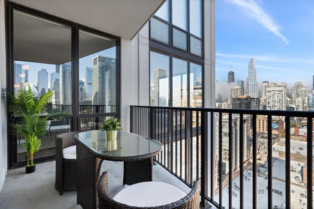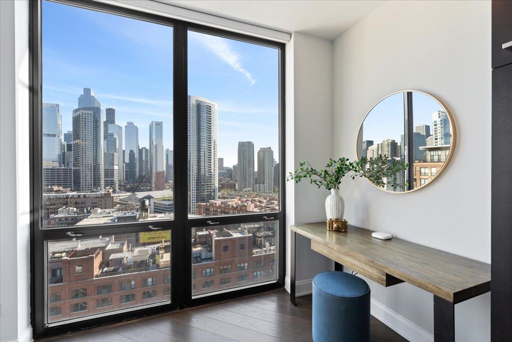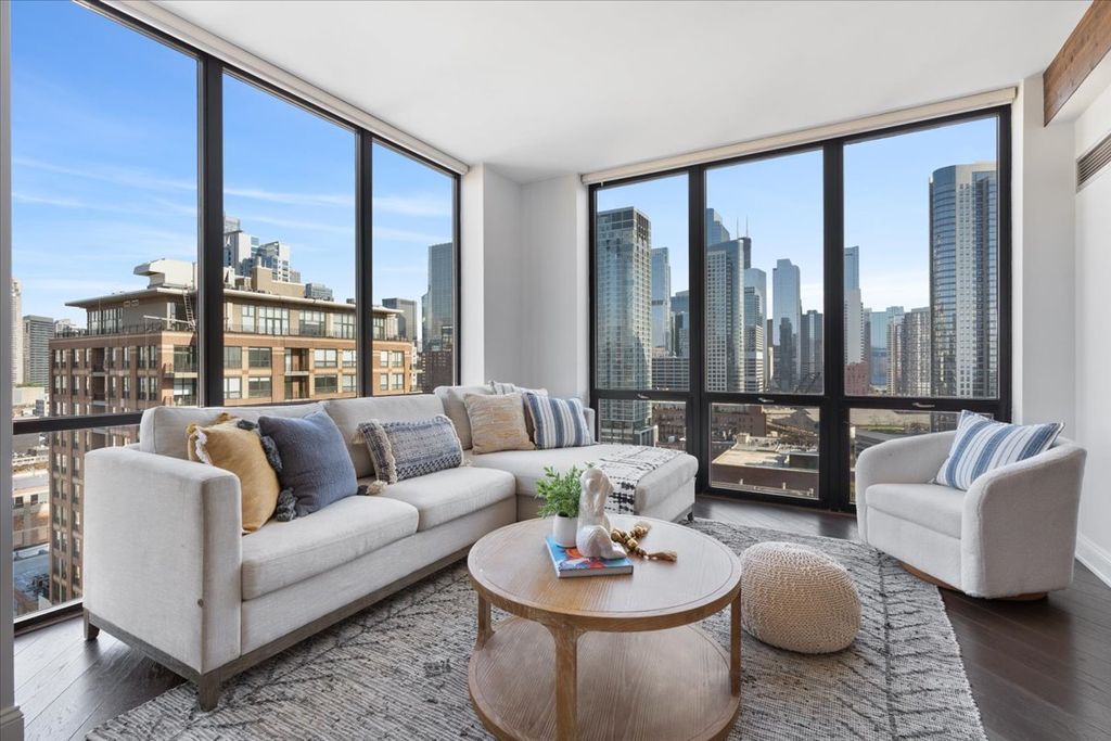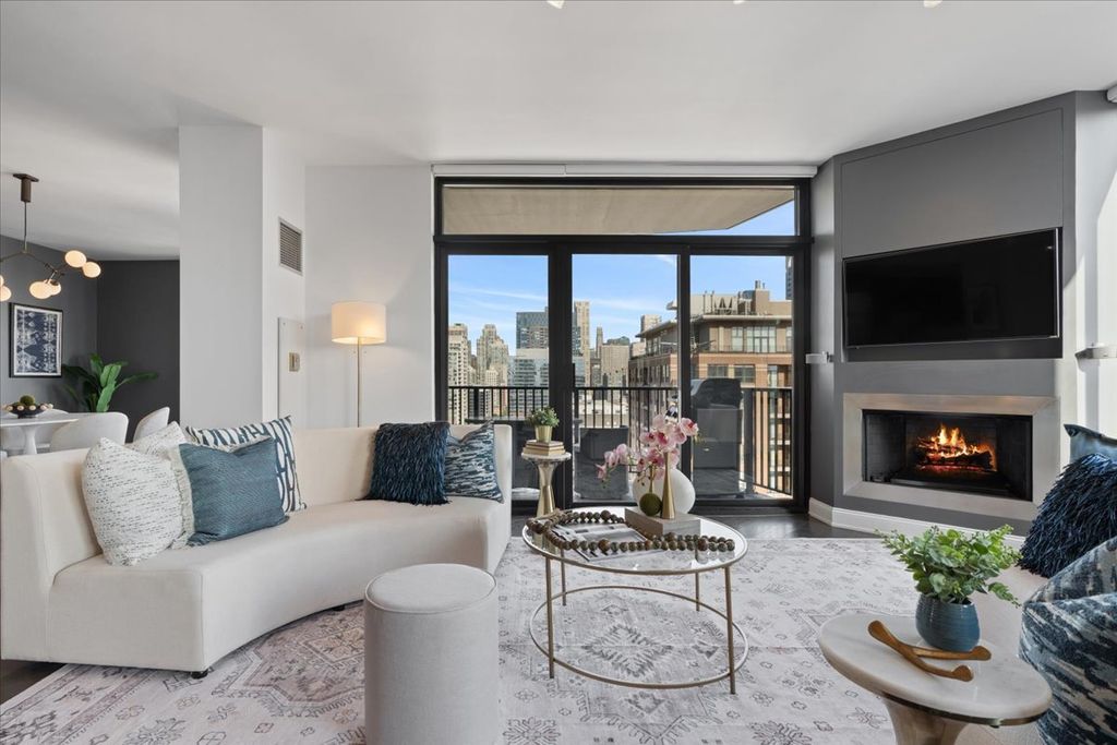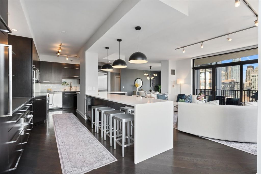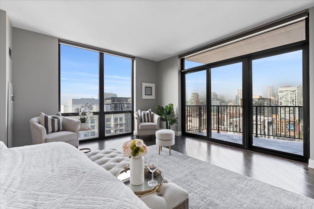 Experience refined luxury living at Erie Centre Tower in the heart of River North. This spectacular, fully gutted and meticulously redesigned residence offers approximately 3,000 square feet of sophisticated living space, spanning the entire east side of the building with breathtaking, unobstructed city views to the south, east, and north. Floor-to-ceiling windows flood the home with natural light, while two private balconies provide the perfect setting for morning coffee or evening entertaining. The expansive open-concept layout showcases a stunning chef's kitchen designed for both everyday living and effortless hosting, complemented by premium designer finishes and integrated smart home technology throughout. Every detail has been thoughtfully curated, including 6" Carlisle white oak flooring, custom closets, Hunter Douglas electronic shades, and designer lighting throughout. An additional living area featuring a wet bar and beverage center creates the ideal space for entertaining or relaxing in style. The luxurious primary suite offers a true retreat, complete with a spa-inspired bath featuring a soaking tub, walk-in shower with body sprays, rain shower, steam, and Robern mirrors with integrated lighting. Additional highlights include two heated, deeded, electric vehicle-ready parking spaces available for an additional $50,000 total. Erie Centre Tower offers full-service amenities including 24-hour door staff, a fitness center, and a rooftop sundeck. This is a rare opportunity to own a turnkey, designer-quality residence in one of River North's premier locations.