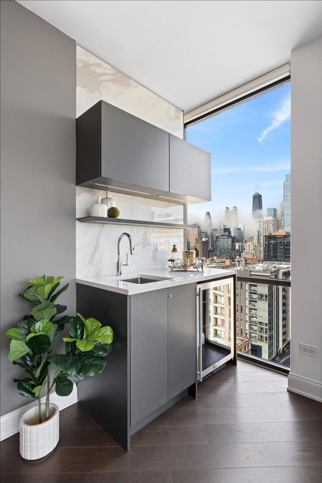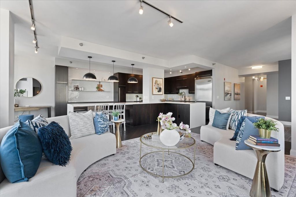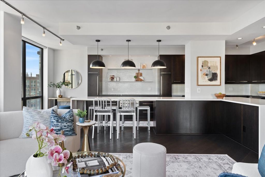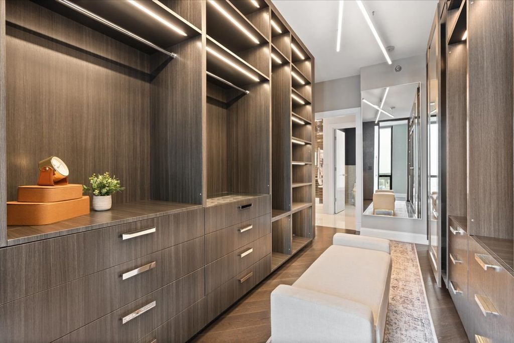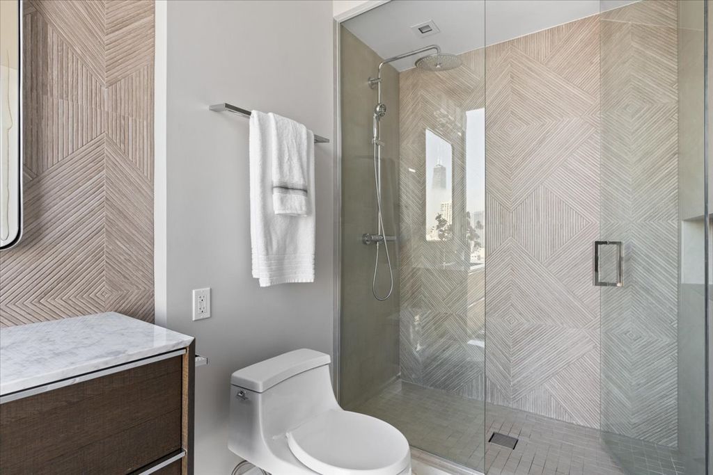Experience refined luxury living at Erie Centre Tower in the heart of River North. This spectacular, fully gutted and meticulously redesigned residence offers approximately 3,000 square feet of sophisticated living space, spanning the entire east side of the building with breathtaking, unobstructed city views to the south, east, and north. Floor-to-ceiling windows flood the home with natural light, while two private balconies provide the perfect setting for morning coffee or evening entertaining. The expansive open-concept layout showcases a stunning chef's kitchen designed for both everyday living and effortless hosting, complemented by premium designer finishes and integrated smart home technology throughout. Every detail has been thoughtfully curated, including 6" Carlisle white oak flooring, custom closets, Hunter Douglas electronic shades, and designer lighting throughout. An additional living area featuring a wet bar and beverage center creates the ideal space for entertaining or relaxing in style. The luxurious primary suite offers a true retreat, complete with a spa-inspired bath featuring a soaking tub, walk-in shower with body sprays, rain shower, steam, and Robern mirrors with integrated lighting. Additional highlights include two heated, deeded, electric vehicle-ready parking spaces available for an additional $50,000 total. Erie Centre Tower offers full-service amenities including 24-hour door staff, a fitness center, and a rooftop sundeck. This is a rare opportunity to own a turnkey, designer-quality residence in one of River North's premier locations.