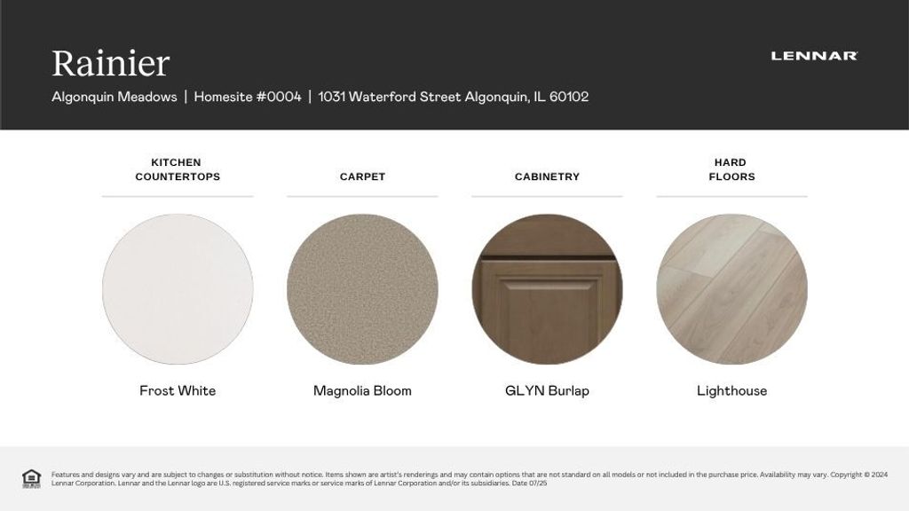 READY FOR JUNE DELIVERY!! Homesite# 0055 Discover a harmonious blend of comfort and practicality in the Rainier plan-an intelligently crafted 4-bedroom, 2.5-bath home designed to support your modern lifestyle. Just off the foyer, a flex space awaits, ready to serve as a formal dining area, home office, or creative space-adaptable to your unique needs. The first floor features an open-concept design where the kitchen, family room, and breakfast room flow seamlessly together, creating a welcoming environment for both daily living and entertaining. The kitchen is the heart of the home, highlighted by a large center island, durable quartz countertops, ample cabinetry, and stainless steel appliances that provide both style and functionality. Throughout the first floor, luxury vinyl plank flooring, energy-efficient LED lighting, and thoughtfully chosen features contribute to a warm and contemporary atmosphere. Upstairs, a flexible loft area provides extra space perfect for a study nook, playroom, or casual hangout. The spacious owner's suite offers a serene retreat with a generous walk-in closet and a private bathroom designed for comfort and relaxation. Three additional bedrooms share a full bathroom, making this layout ideal for families or guests. Additional features include a first-floor laundry room, a first-floor powder room, and a three-car garage, ensuring the Rainier plan balances style and everyday practicality on every floor. Exterior will be Indigo color vinyl siding with Sand Dunes color brick. (pic for reference ONLY) *Photos are not this actual home* Nestled in a beautifully planned community, Algonquin Meadows offers a variety of thoughtfully designed single-family homes, traditional townhomes, and urban townhomes - all set among serene green spaces and tranquil ponds. Winding streets, cul-de-sacs, and walking paths create a peaceful neighborhood atmosphere that feels private, yet perfectly connected. Just minutes away, charming downtown Algonquin awaits with scenic riverfront parks, fishing spots, and a vibrant local culture. You'll enjoy convenient access to premier destinations like Northwestern Medicine, top-rated golf courses, and fitness centers such as Lifetime Fitness. Located right off the Randall Road corridor, you're surrounded by some of the area's best shopping and dining - including Trader Joe's, Cooper's Hawk, Target, Costco, and Algonquin Commons. Whether you're looking for daily essentials or a relaxing night out, everything you need is within easy reach. Come home to Algonquin Meadows - where natural beauty, community charm, and modern convenience meet.