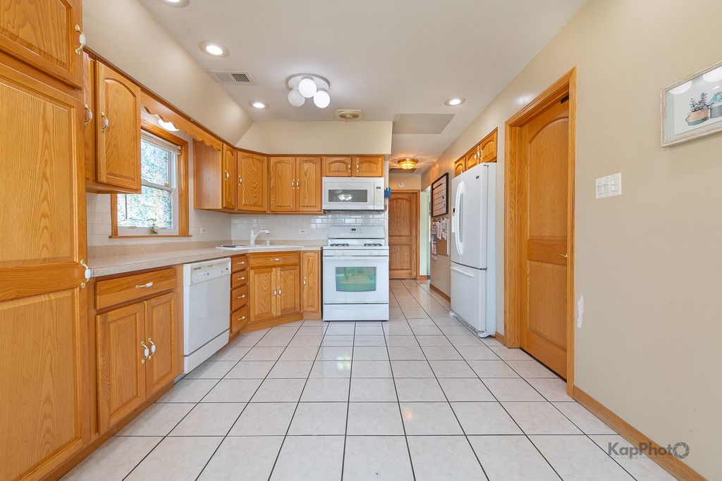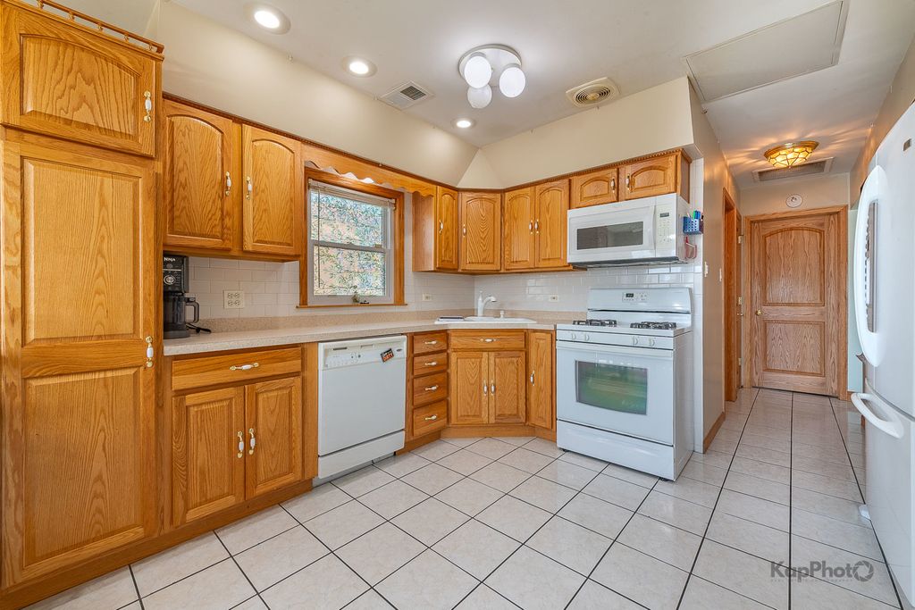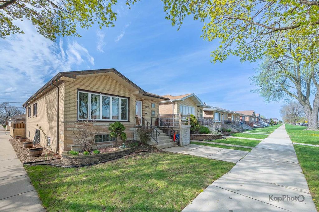 Amazing all-brick, corner-lot single family home featuring 3 bedrooms, 2 bathrooms, a finished basement, and a large brick detached 2-car garage. The main floor offers a spacious living and dining room with hardwood floors throughout, along with 3 generously-sized bedrooms and a full bath. The kitchen includes oak cabinets, matching white appliances, and a large eat-in area. The finished lower level features an open layout, ample storage, a full bath, a large laundry room, a sump pump with ejector, and wood laminate flooring. Enjoy a fully concrete patio in the yard and a large all-brick garage with a side carport. Come view today!