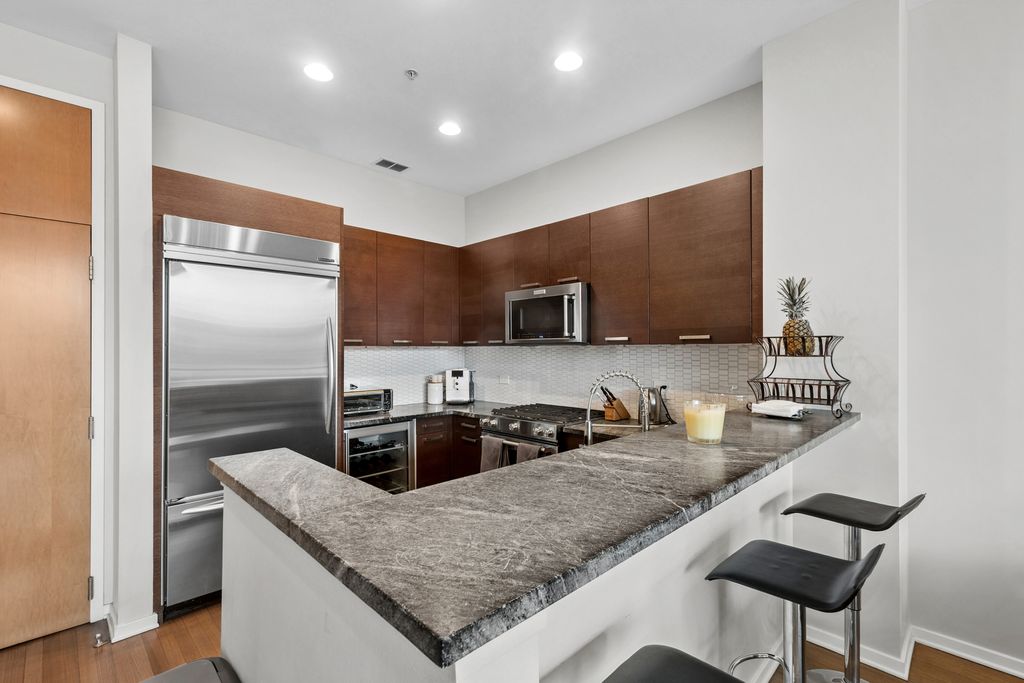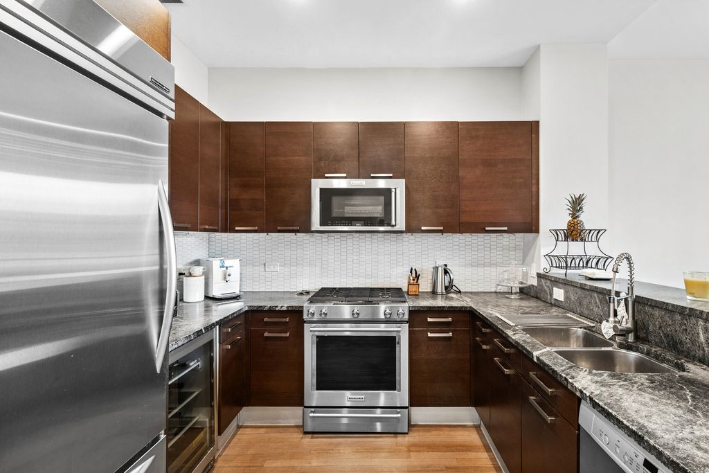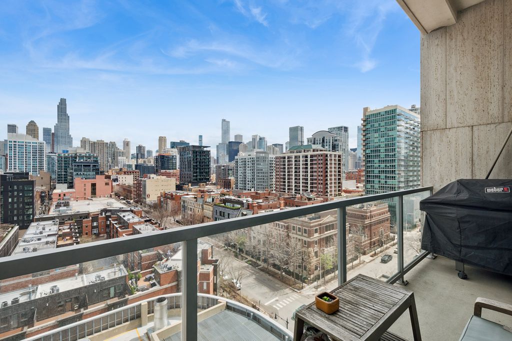 Rarely available, this exceptional residence offers breathtaking city views from a private, east-facing balcony in the heart of River North. Designed with both elegance and comfort in mind, the expansive open-concept layout is ideal for sophisticated entertaining, featuring rich hardwood flooring throughout and a chef-inspired kitchen appointed with premium stainless steel appliances, granite countertops, a designer tiled backsplash, and an inviting breakfast bar. The serene primary suite serves as a true retreat, complete with a refined office nook, two spacious walk-in closets, and a spa-caliber marble bath featuring a linen closet, dual vanities, a whirlpool soaking tub, and a separate glass-enclosed shower. Additional upscale amenities include built-in speakers, an in-unit washer and dryer, and a dedicated storage locker, offering the perfect blend of luxury, convenience, and urban living. Garage parking additional 35k. Pet friendly - 2 pets per unit with no weight or breed restrictions. Parking space P-249 on 2nd floor. Assessments listed include parking.