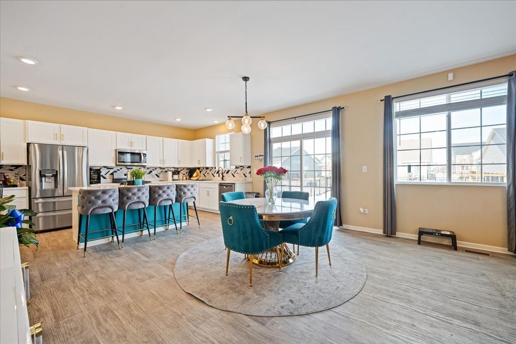 This stunning 2-story North Lake model offers over 2,800 sq ft of beautifully designed living space & a full unfinished basement with peaceful pond views right from the front porch. Featuring an open floor plan and soaring 9' ceilings on the main level, this home blends modern style with energy-efficient features and SMART home technology. The gourmet kitchen is a true showstopper with quartz countertops, a large island, designer cabinetry, luxury designer lighting, stainless steel appliances, and a huge walk-in pantry. The spacious kitchen opens seamlessly to the family room, creating the perfect space for entertaining or simply relaxing at home. The main level also includes a bright foyer, formal living and dining areas, and a convenient powder bathroom. Upstairs, you'll find a spacious owner's suite with a luxurious ensuite bath, and large walk-in closet. Three additional generously sized bedrooms, a full hallway bath, a massive loft (17x12), and a second-floor laundry room add to the home's functionality and comfort. Outside, enjoy professional landscaping. Located in the acclaimed Minooka School District and close to interstates, shopping, dining, and Four Seasons Park. The Towne Center offers year-round community events and activities for all ages. This is more than a home, it's where your next chapter begins. The sellers have already relocated and are very motivated. Sellers are offering a closing credit for paint.