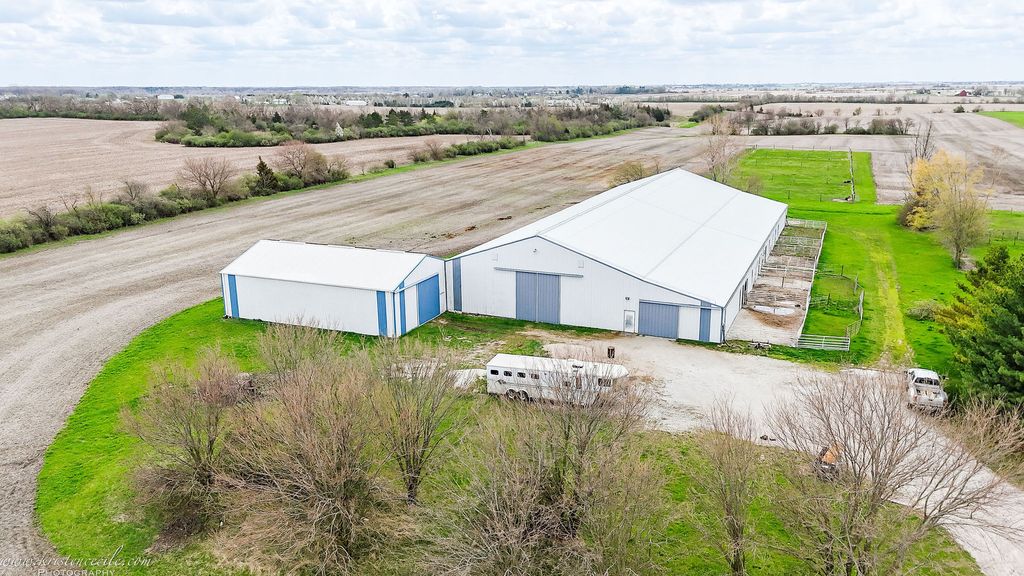 This premier 40-acre equestrian estate in Beecher offers a rare combination of professional-grade training facilities and high-yield agricultural land. Designed for the serious equestrian, the property features a massive 210' x 90' Lester-built ventilated barn housing a 20m x 60m regulation dressage arena. With an 18' interior height, the arena is perfectly suited for high-level jumping and year-round training. The facility is engineered for maximum efficiency and horse comfort, featuring a 12' wide center aisle, a spacious two-stall wide tack room, and a dedicated manure spreader. The stable area includes 12 stalls total (10' x 12'): 5 double stalls, 7 single stalls, and an additional empty stall. Every stall is outfitted with rubber mats and dedicated electric outlets. Grounds & Agriculture Turnout: Exceptional variety of turnout options including 4 hotwire paddocks, 3 steel pole fence paddocks, and dedicated dry paddocks for all-weather use. Land Quality: 30 acres of the 40-acre parcel are professionally tiled, ensuring superior drainage and premium pasture/crop quality. Storage: A separate 40' x 60' hay barn with 14' drive-through doors offers a 6,000-bale capacity, providing ample logistics for a high-volume boarding or training operation. Legacy Features: The property also includes an old outdoor arena area, providing additional space for expansion or specialized training. Residence The estate includes a substantial custom home totaling over 4,100 square feet of living space across the main level and a walk-out basement. The layout is designed for a modern "live-work" lifestyle, featuring: Spacious Living Room and formal Kitchen. Dedicated Office space. Three primary bedrooms on the main level plus additional lower-level sleeping quarters. This is a turnkey opportunity for a professional trainer, a high-end boarding business, or an equestrian enthusiast seeking a private compound with significant agricultural value in the heart of Will County.