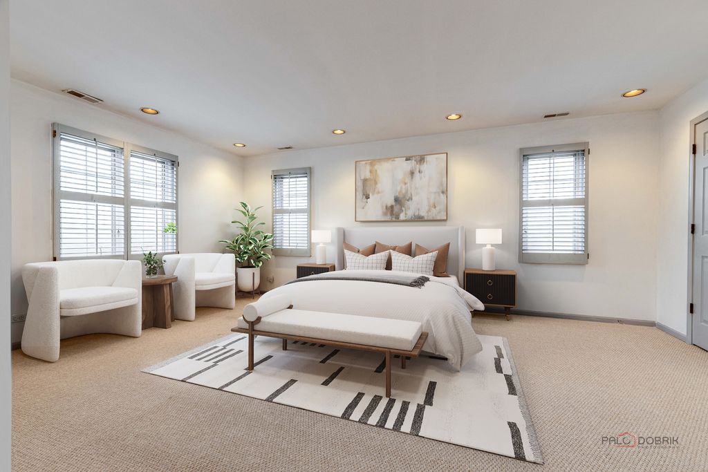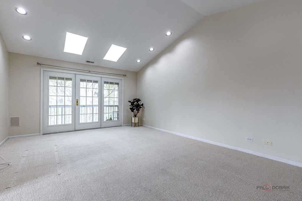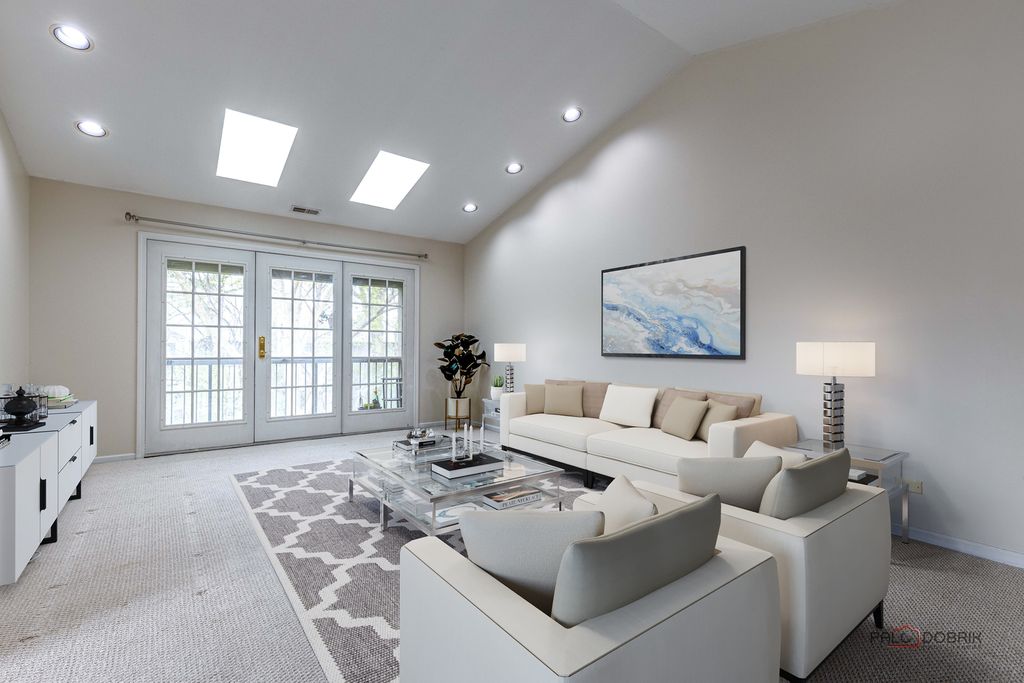 Bright and spacious 3-bedroom, 2-bath home featuring an open, airy layout. The combined living and dining area showcases vaulted ceilings, two skylights, and a built-in wet bar with cabinetry-perfect for entertaining. The expansive kitchen offers a charming greenhouse window, a separate dining nook, and French doors leading to a private balcony. The generous primary suite includes two walk-in closets and a luxurious en-suite bath with dual vanities, a whirlpool tub, separate shower, and linen storage. Additional bedrooms are well-sized with oversized closets and are complemented by an additional full bath. Enjoy the convenience of in-unit laundry with a full-size washer and dryer, cabinetry, and a utility sink. Recessed lighting enhances the home throughout. Ideally located close to downtown, train, library, shopping, dining, parks, and top-rated schools-this home truly has it all!
