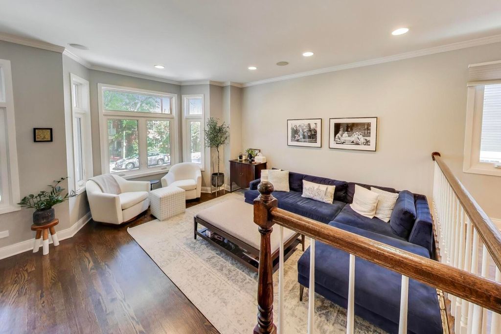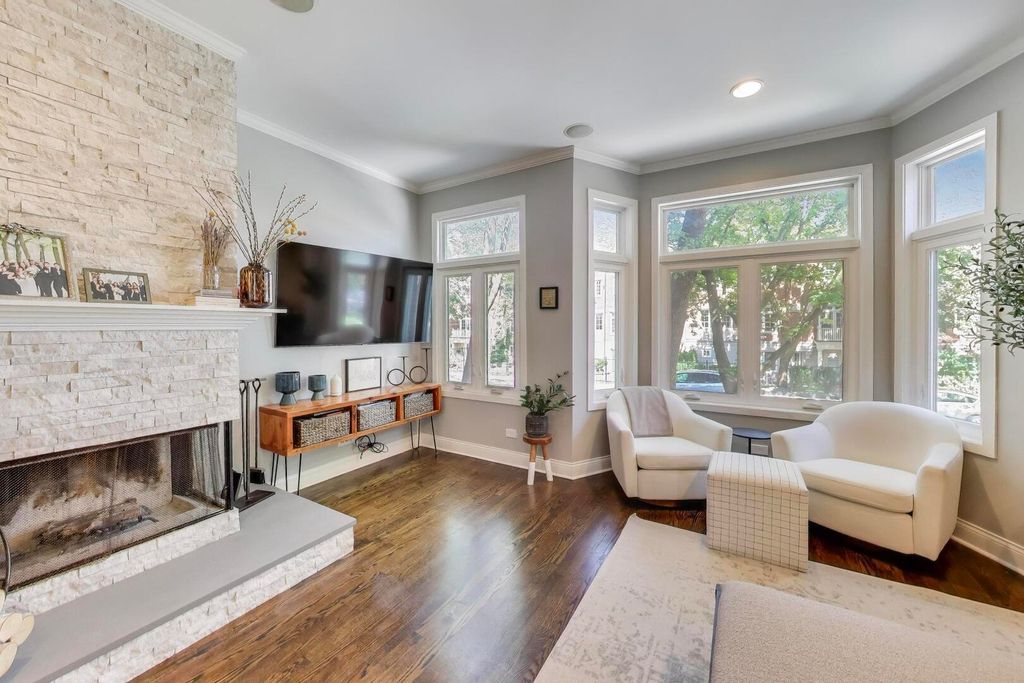 Rarely available end unit triplex with attached 1.5 car garage in a prime West Lincoln Park location, just steps from Wrightwood Park! This beautifully renovated 3 bed, 2.1 bath townhome provides single-family style living with only one shared wall and exceptional natural light from multiple exposures. The flexible first level offers a spacious living area ideal for a home office, gym, or playroom, plus direct access to the garage with added storage. The main level features an open-concept layout with hardwood floors, a designer kitchen with oversized island, farmhouse sink, quartz countertops, white cabinetry, subway tile backsplash, and designer lighting. Expansive east/west/north exposures flood the space with light, while the dining and living areas showcase large windows and a wood-burning fireplace with gas starter. A well-appointed powder room completes the level. Upstairs, two generous bedrooms include a stunning primary suite with cathedral ceilings, custom closets, and a spa-caliber bath with dual vanities, oversized shower, soaking tub, and quartz finishes. Laundry is conveniently located on this level. The top floor offers a versatile third bedroom with skylight, closet, and additional storage. Turnkey and move-in ready in a professionally managed community with strong reserves, low assessments, private courtyard, and beautifully landscaped shared green space. Major improvements include water heater (2023), new furnace control board & electrical contractor (2023), replaced 1st floor sliding glass door (2022), & Windows replaced (2018). Must see!